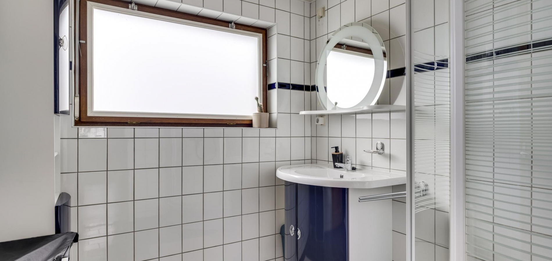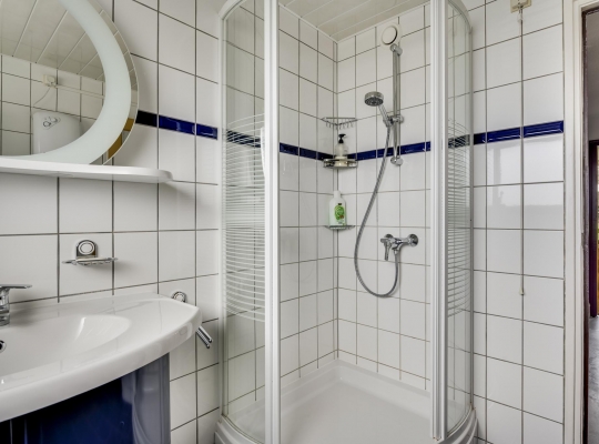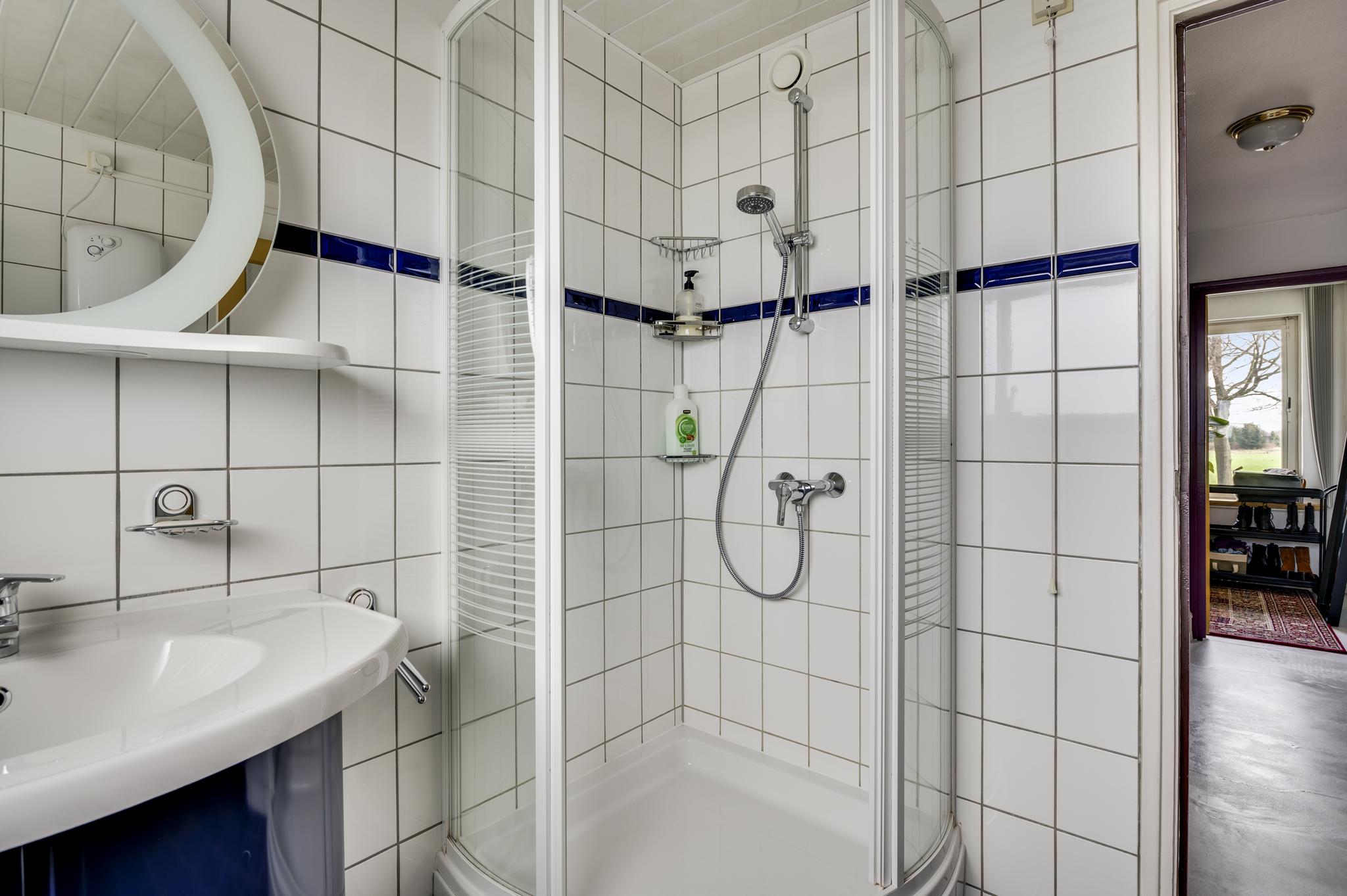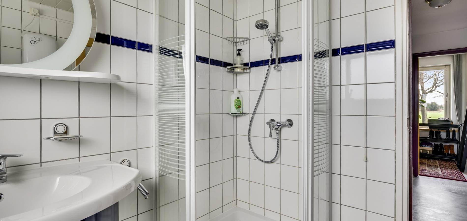 De badkamer (2,12 x 2,10) met groot raam is ingedeeld met een kwartronde douche en een wastafelmeubel. Qua grootte is de badkamer geschikt om een ligbad te realiseren. De naastgelegen inbouwkast kan worden verbouwd tot toiletruimte.