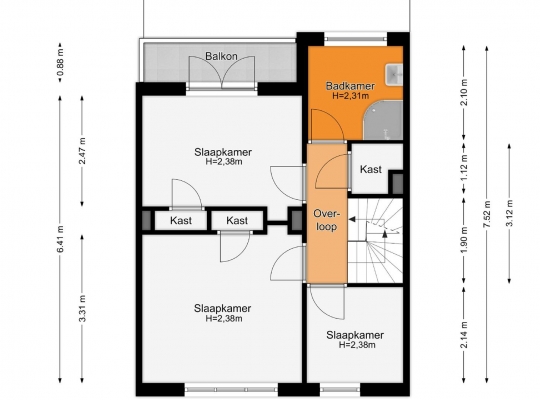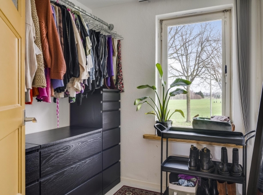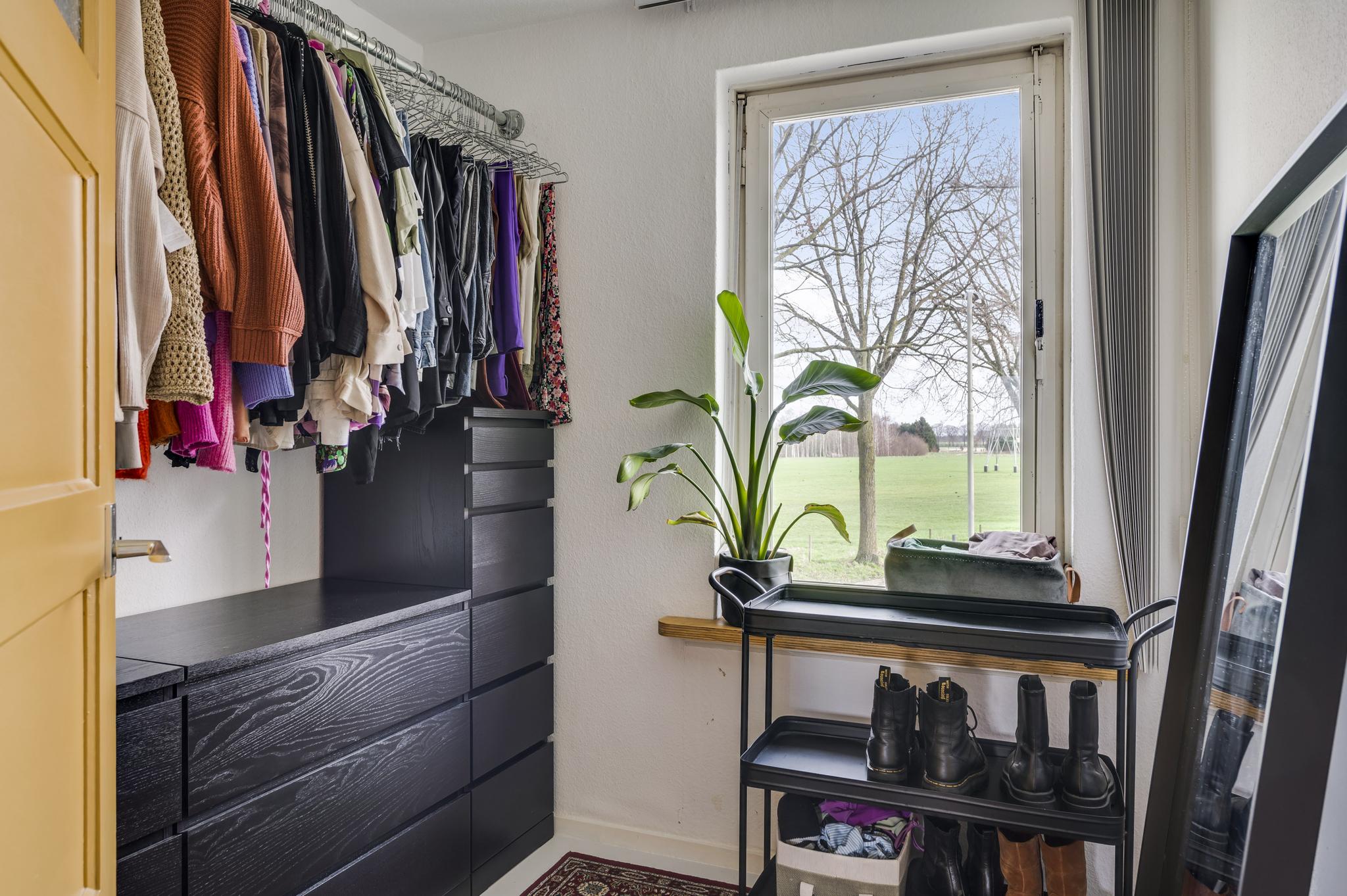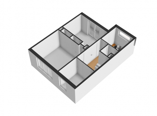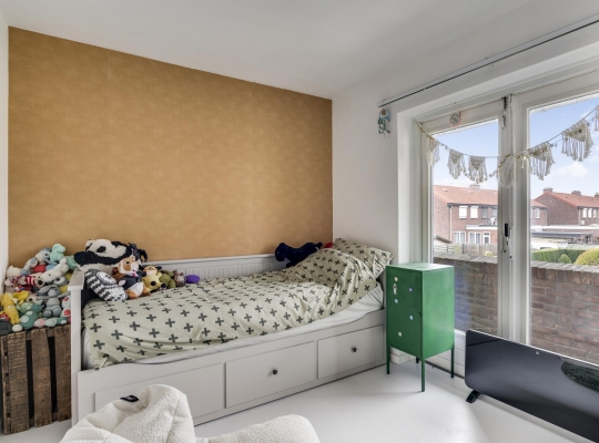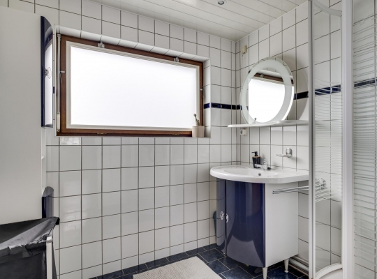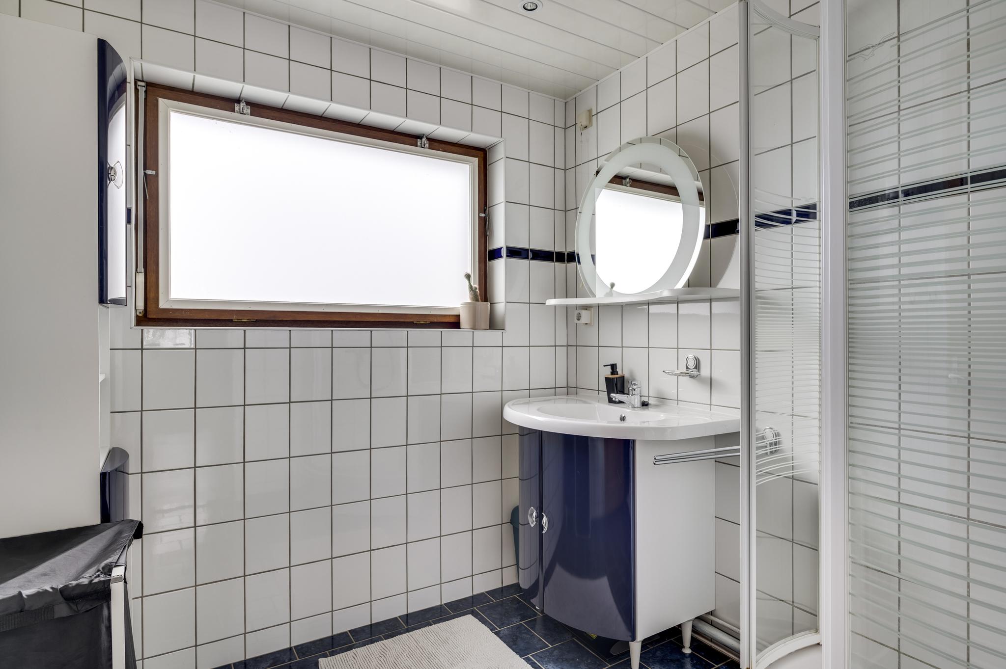 De badkamer (2,12 x 2,10) met groot raam is ingedeeld met een kwartronde douche en een wastafelmeubel. Qua grootte is de badkamer geschikt om een ligbad te realiseren. De naastgelegen inbouwkast kan worden verbouwd tot toiletruimte.