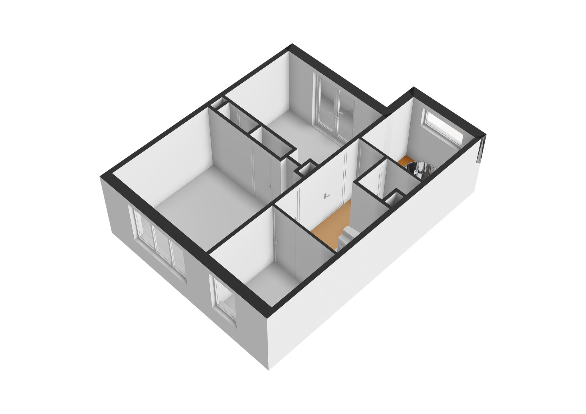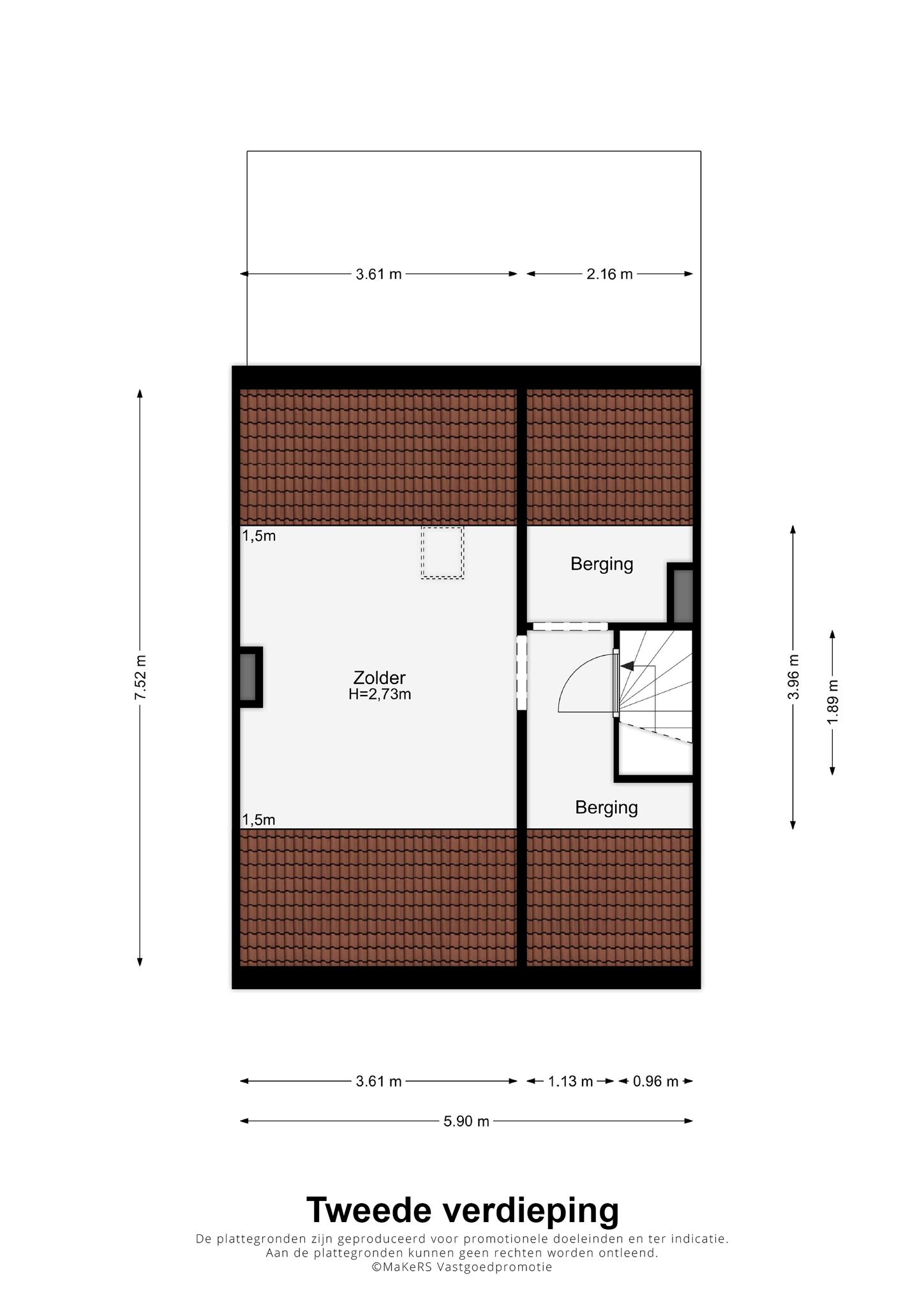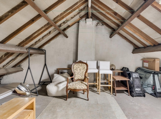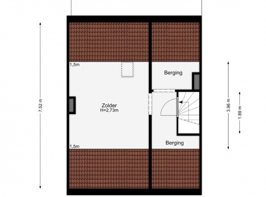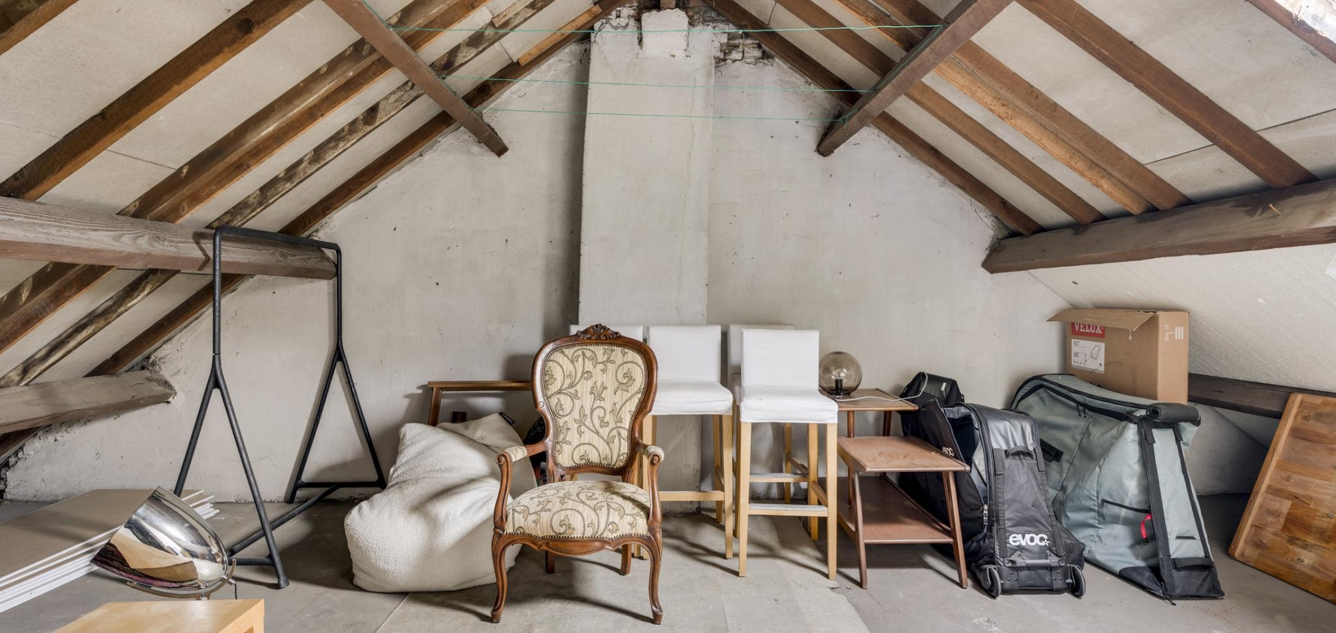 Een vaste trap geeft toegang tot de tweede verdieping, verdeeld in drie ruimtes. De eerste ruimte is de overloop, van waaruit een berging en de zolderkamer (3,96 x 3,61) te bereiken zijn. De hoge nok maakt het mogelijk om deze kamer te verbouwen tot ruime slaapkamer.