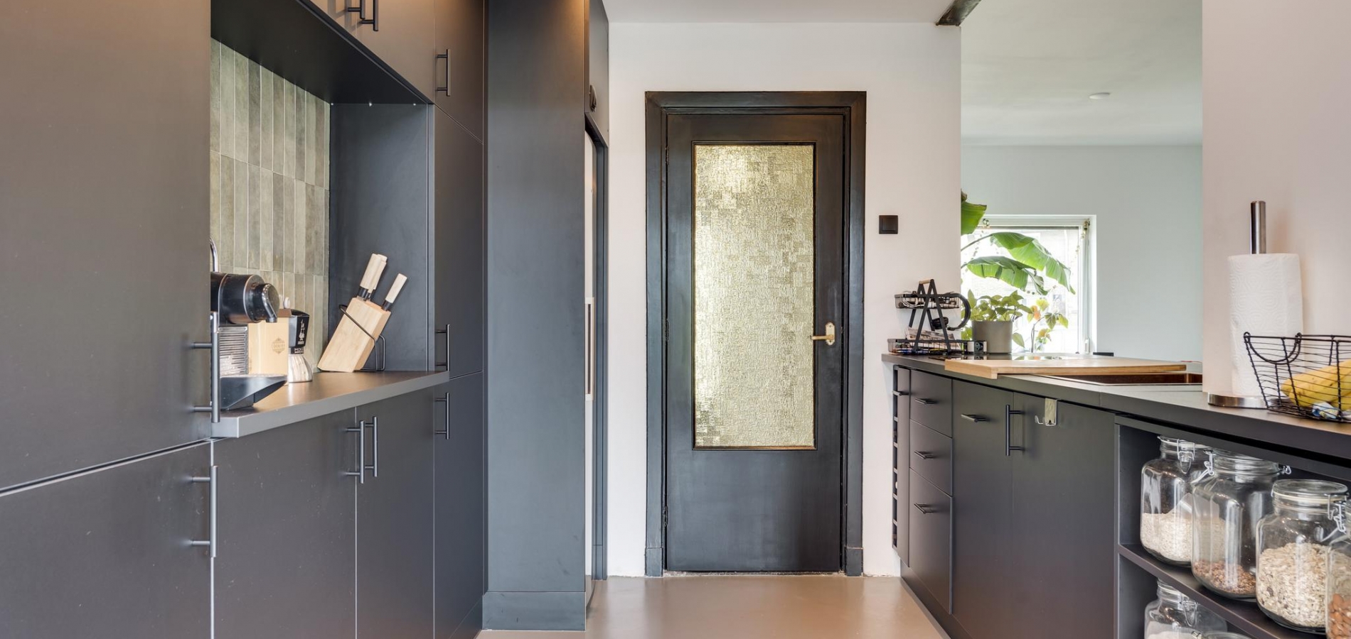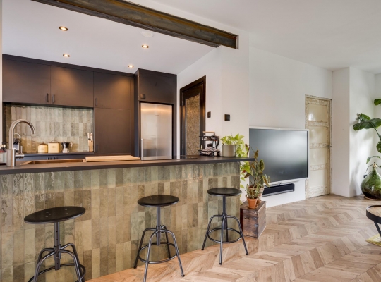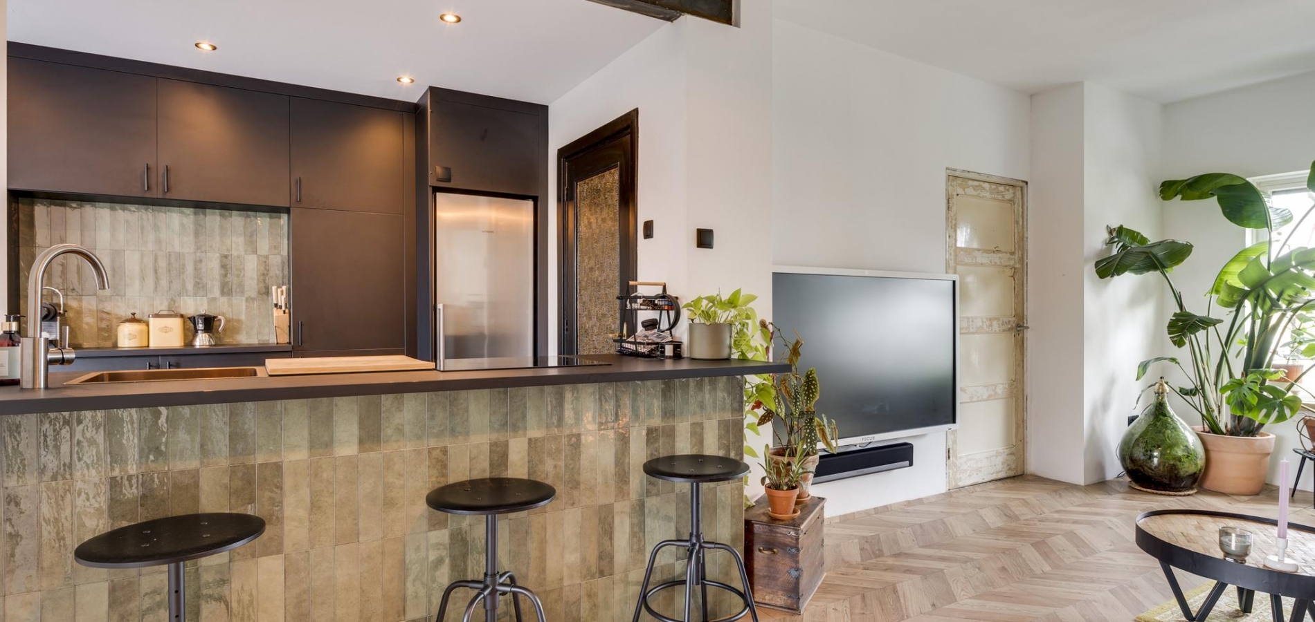 In de halfopen keuken (3,24 x 2,08) staat een in 2023 geplaatste keukenopstelling met een groot eiland, veel bergruimte en diverse inbouwapparatuur. Aan het eiland, aan de woonkamerzijde, is ruimte met krukken neer te zetten waardoor de keuken en woonkamer een geheel zijn.