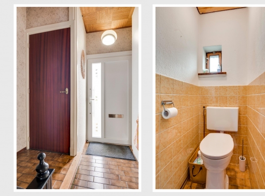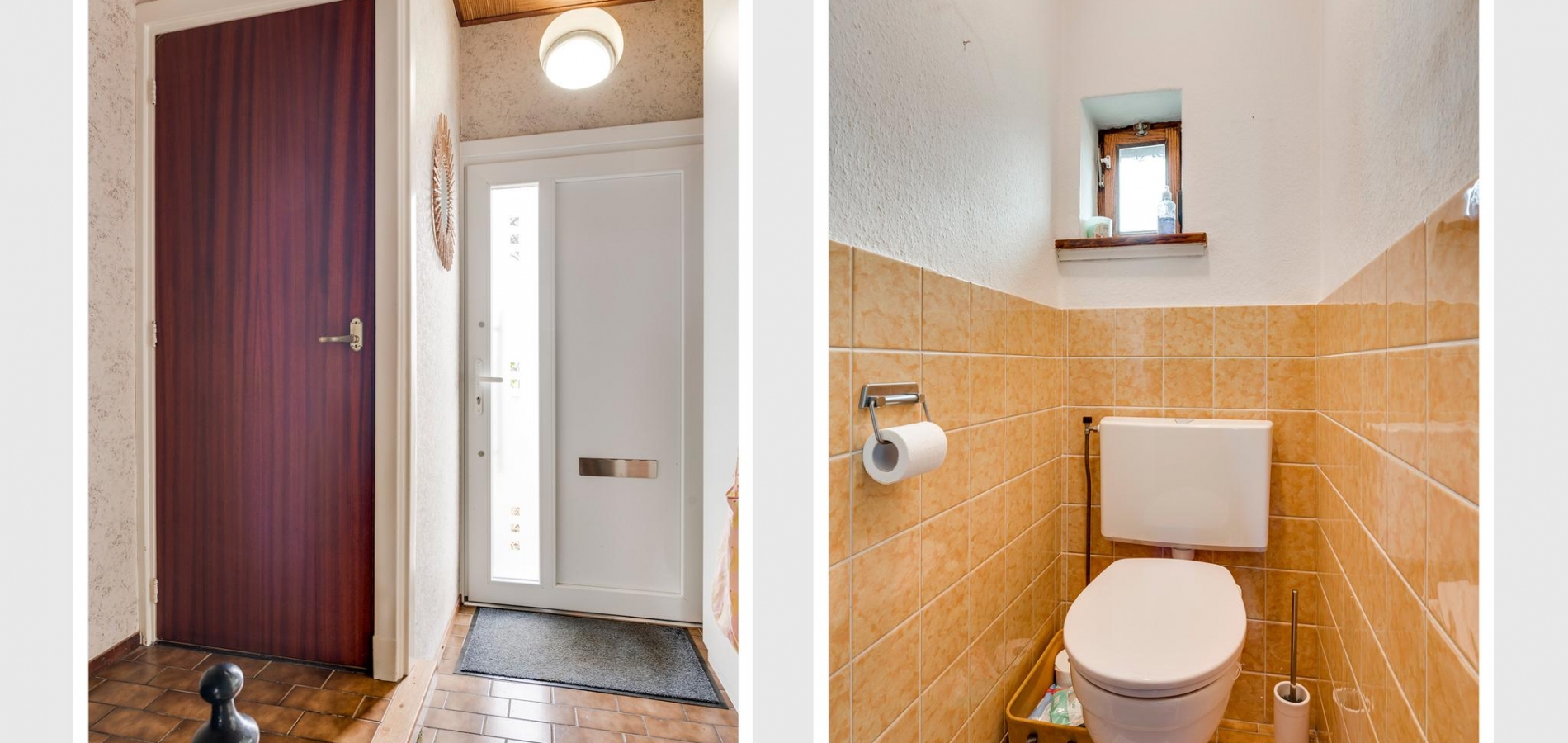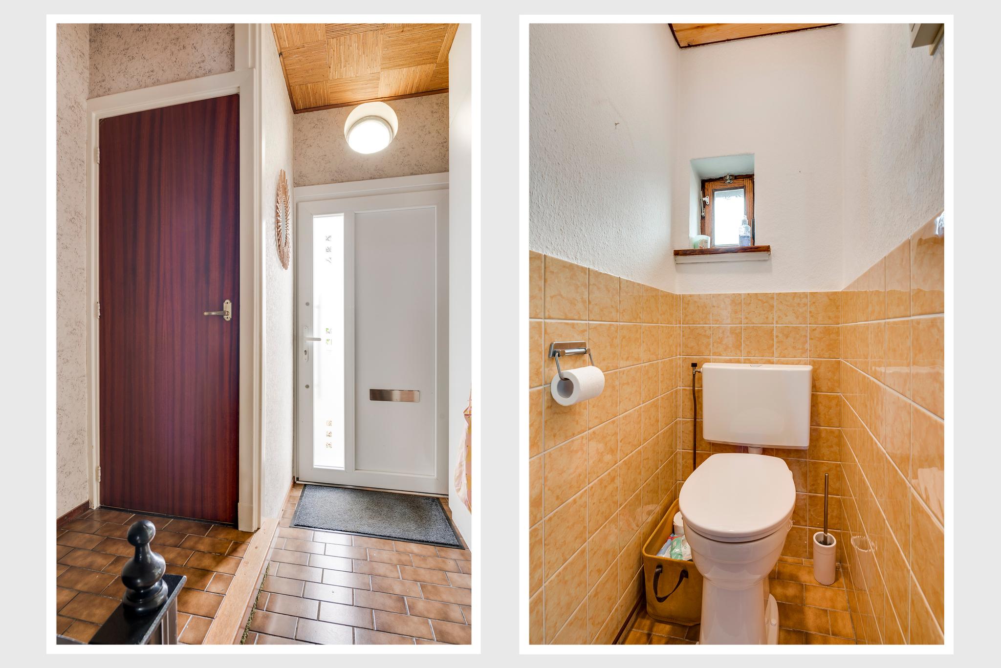 De entree met donkergroene voordeur en rond raam is fraai. In de hal ziet u de meterkast, trapopgang en een bruine tegelvloer. Aan de rechterzijde is de toiletruimte met een raampje in de voorgevel.