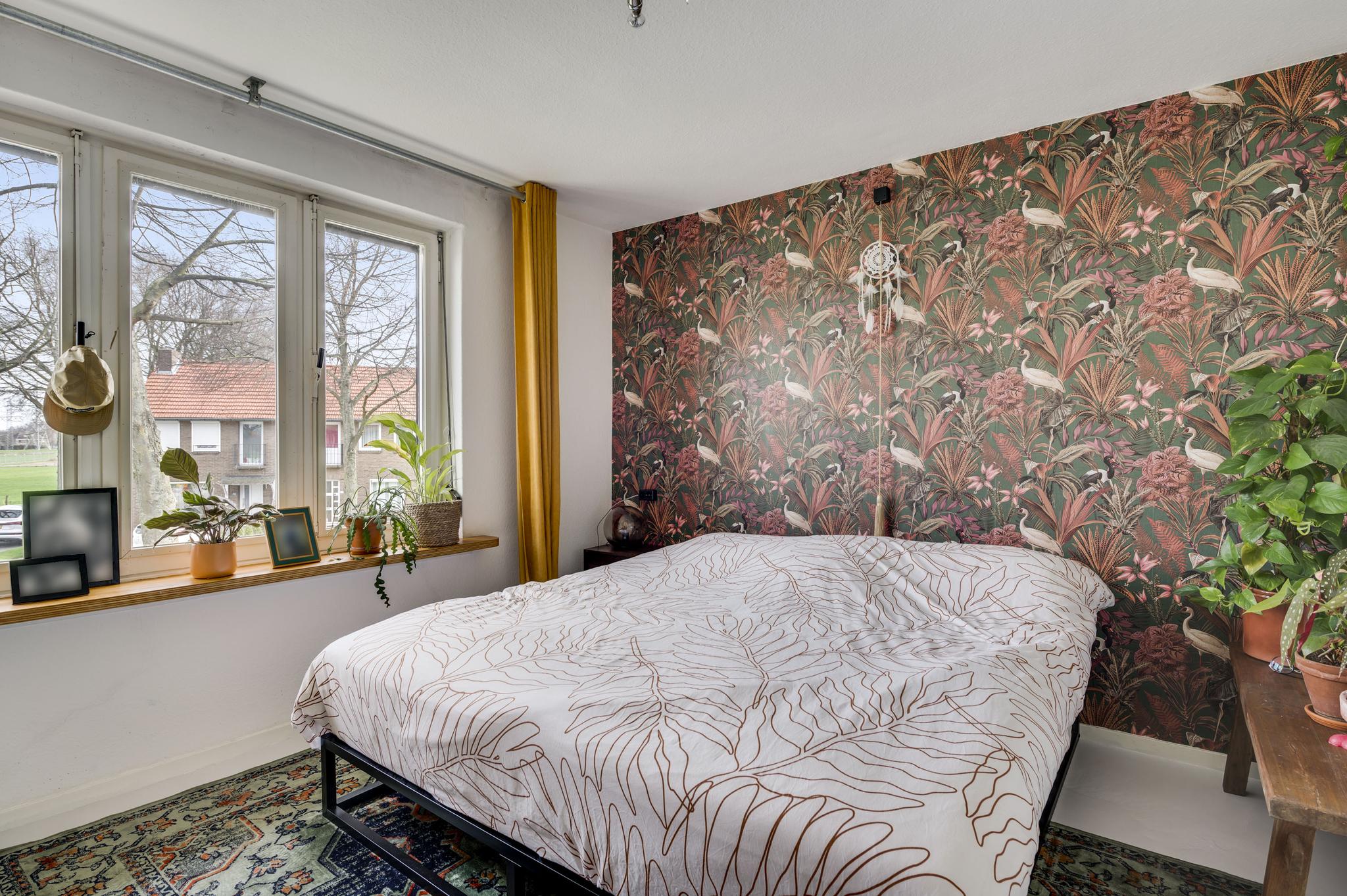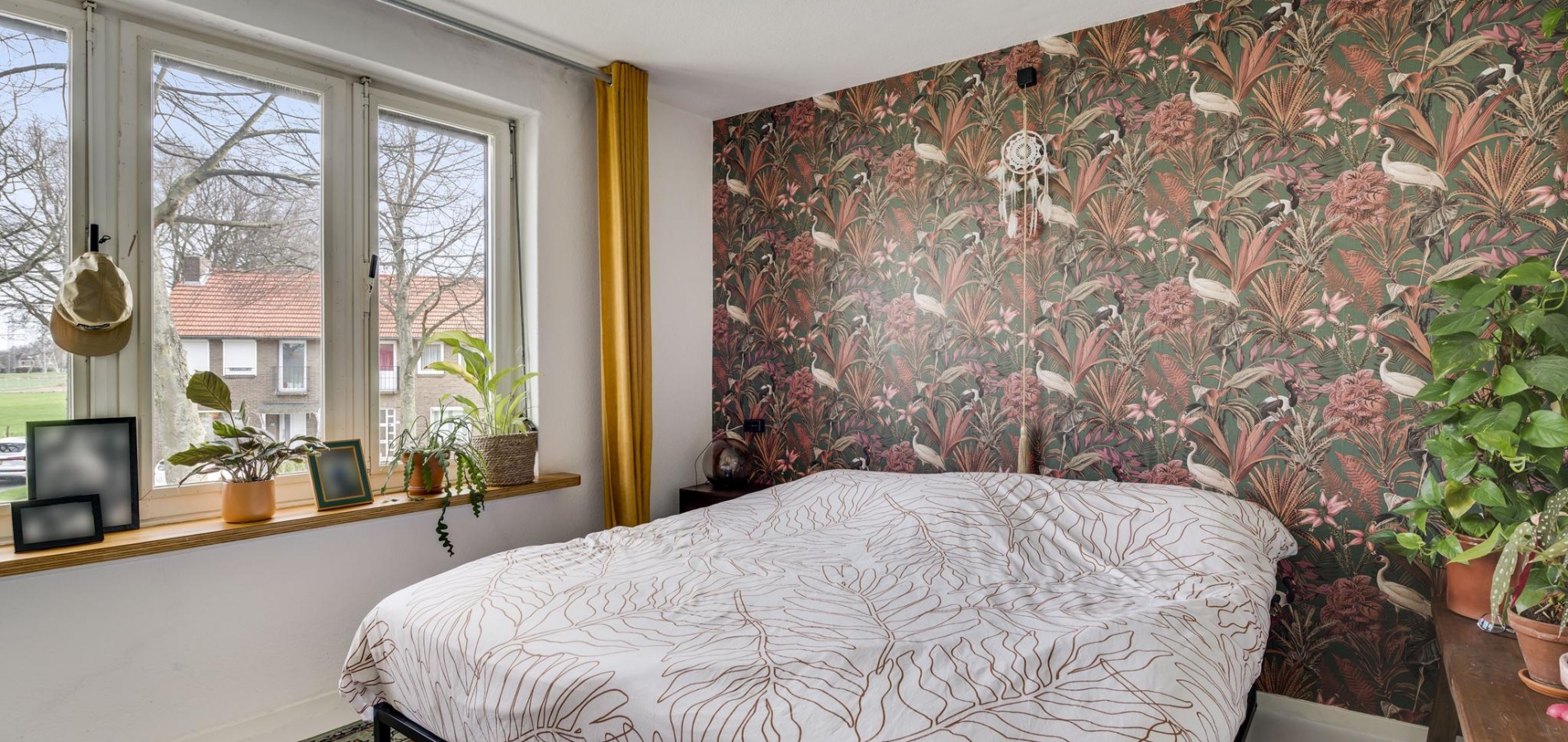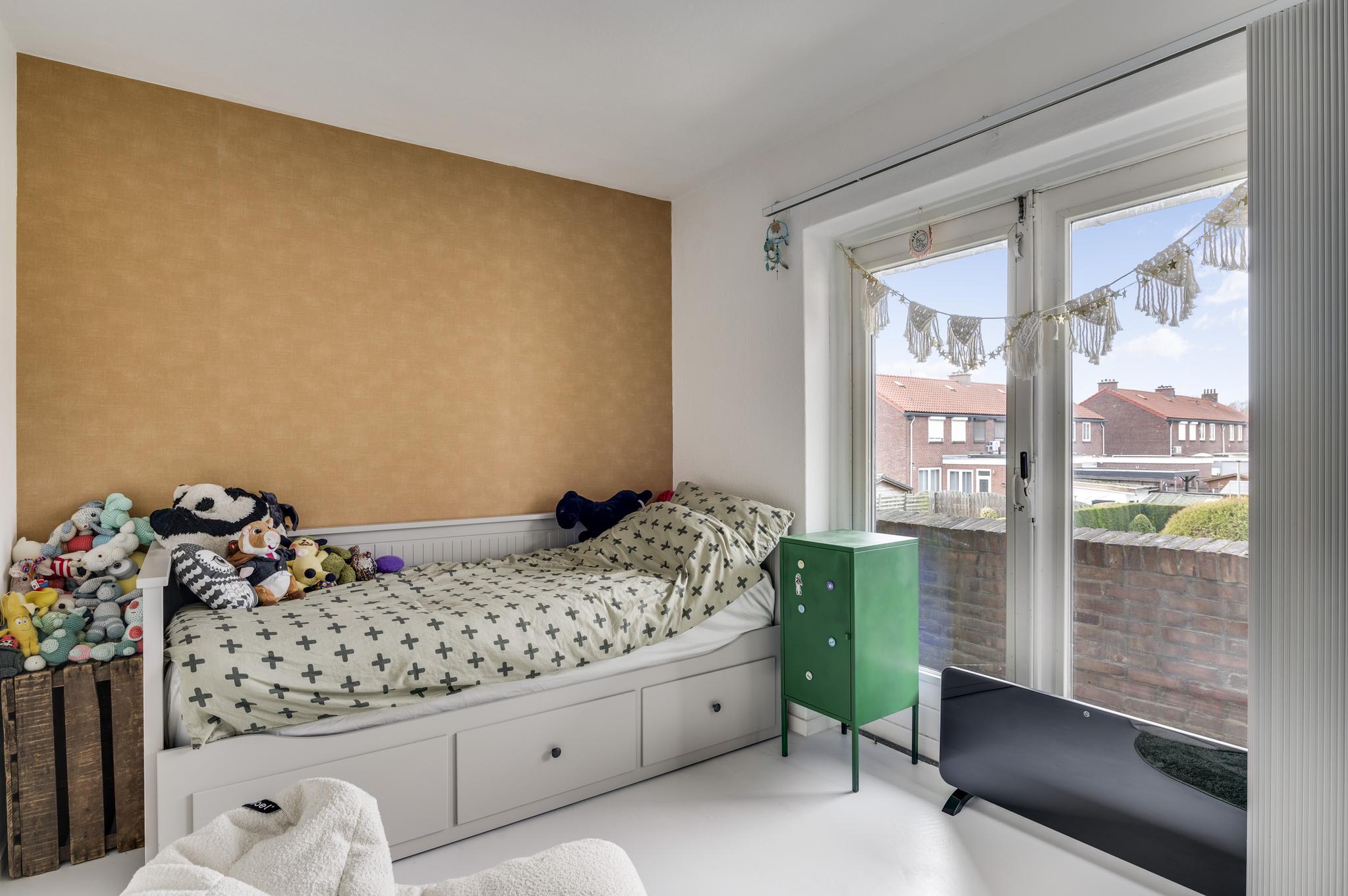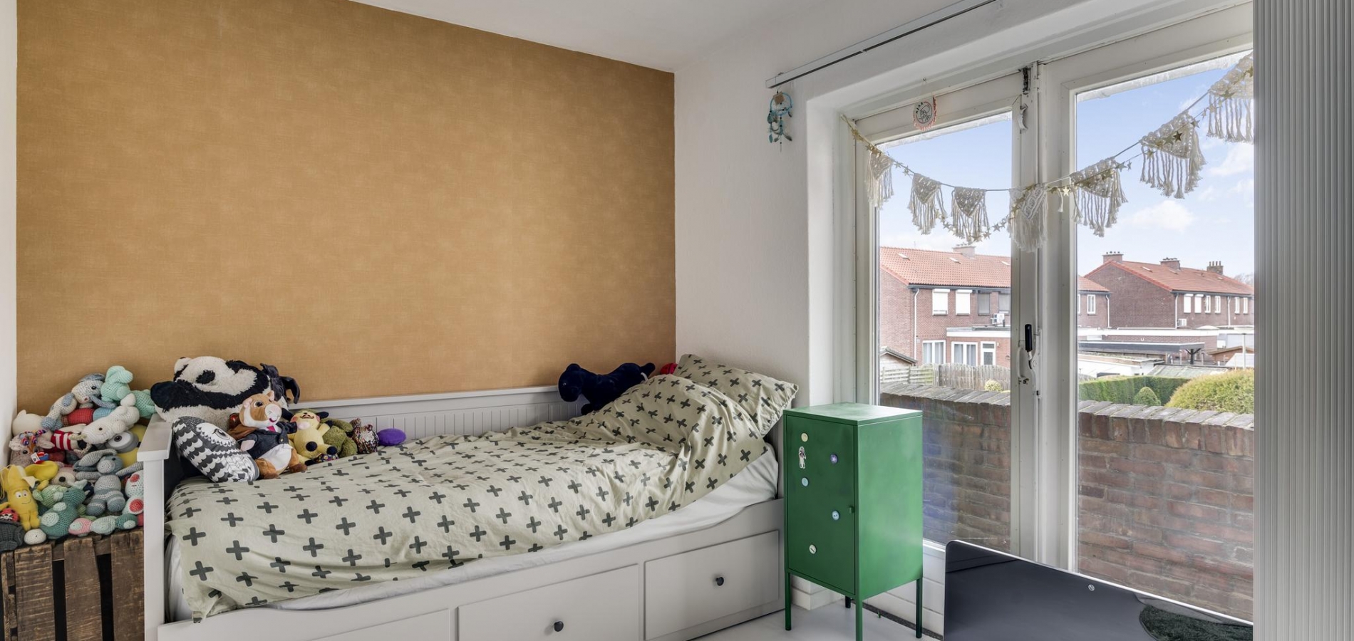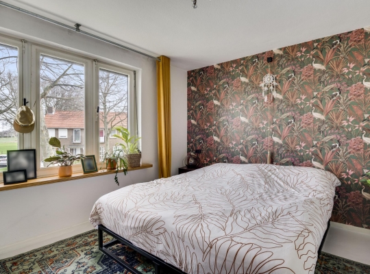 Op de eerste verdieping zijn de overloop, drie slaapkamers en de badkamer. Slaapkamer I (3,56 x 2,47) met inbouwkast en balkon bevindt zich aan de achterzijde. Aan de voorzijde zijn slaapkamer II (3,55 x 3,31) met inbouwkast en slaapkamer III (2,15 x 2,14) die nu als kleedruimte in gebruik is. De originele paneeldeuren zijn gecombineerd met stucwerk, trendy behang, een gietvloer en houten vensterbanken.