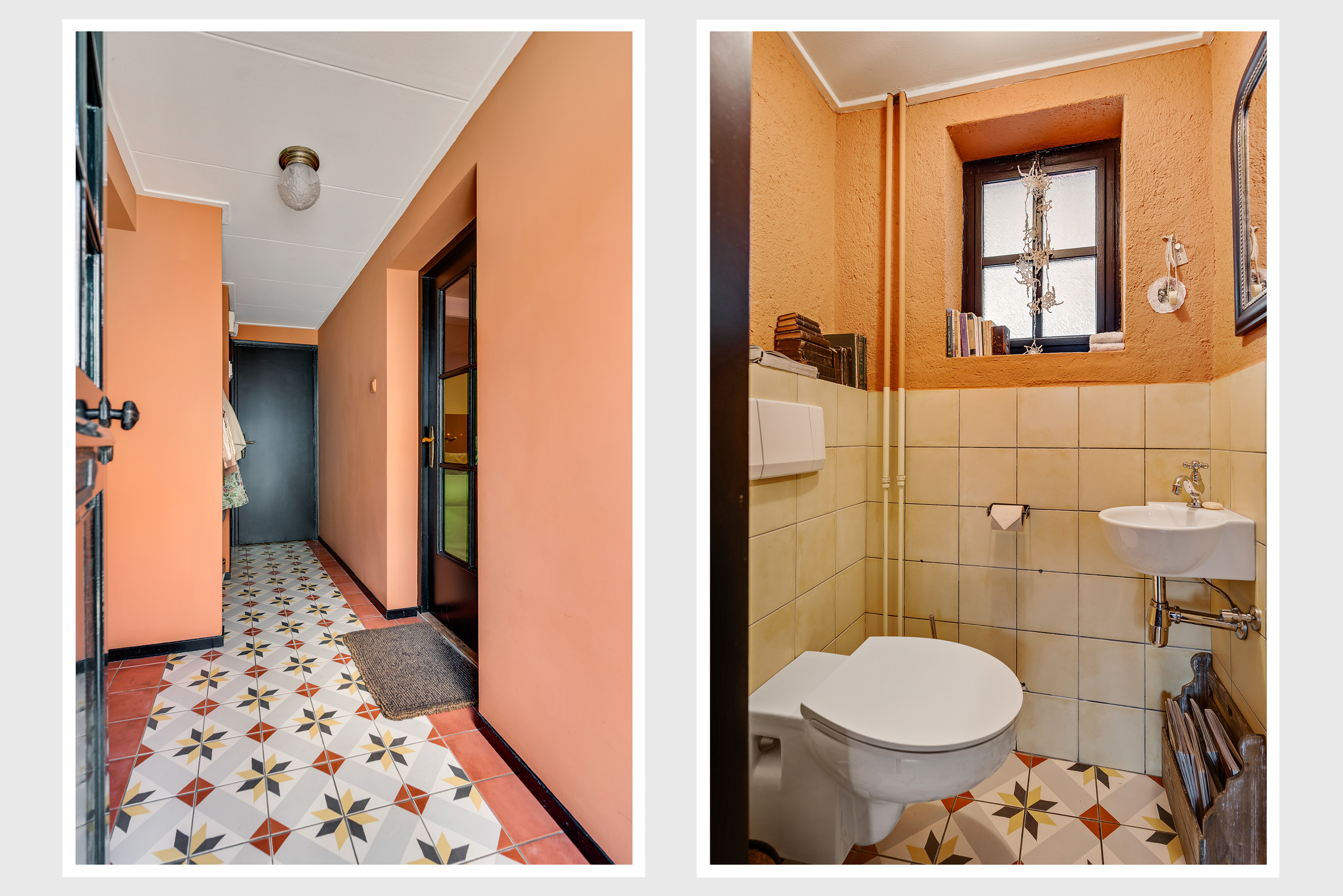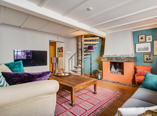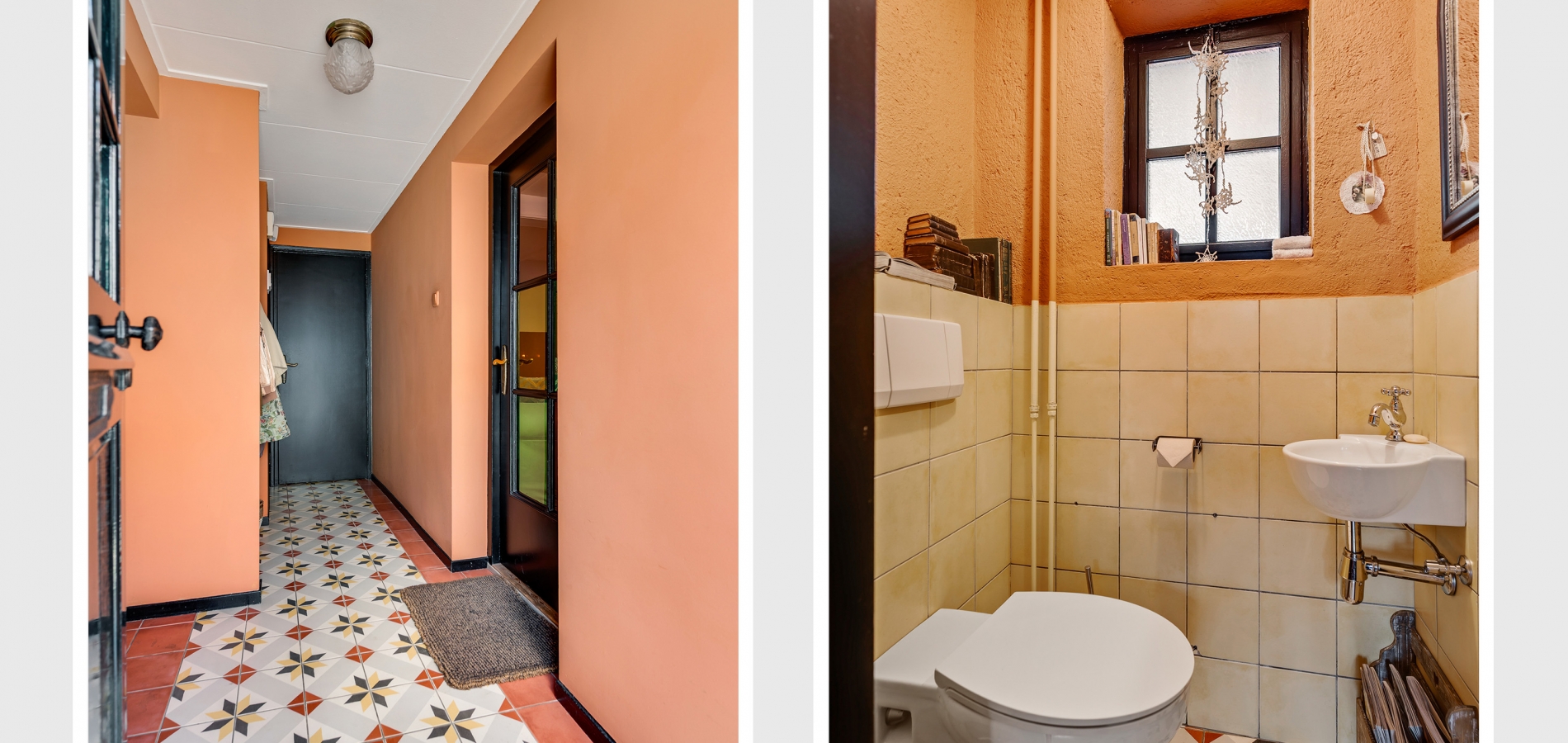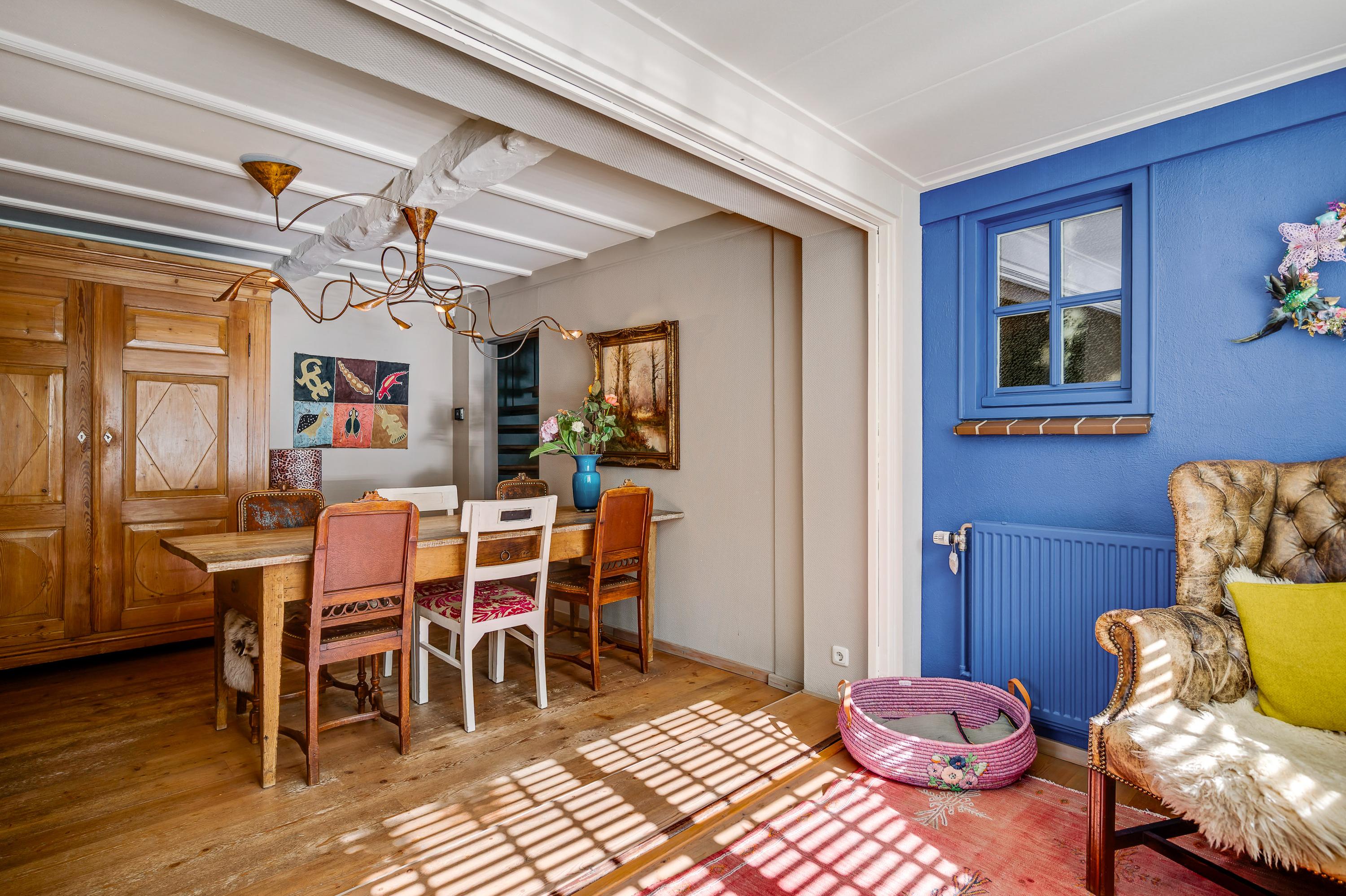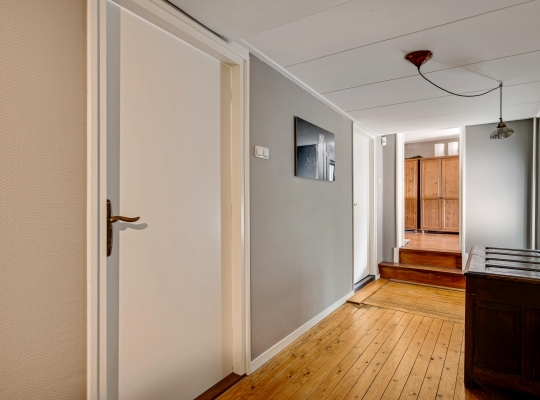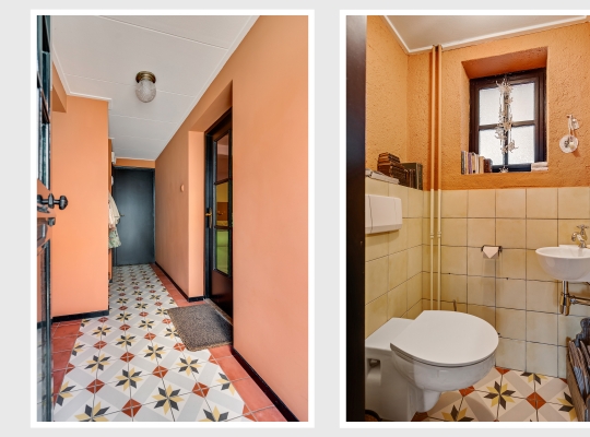 In de fraaie hal, naast de meterkast, is de garderobenis en recht voor u is de toiletruimte, waar oude en nieuwe elementen zijn gecombineerd. De gestucte muren in de hal zijn in een gedurfde, smaakvolle kleur geschilderd en de tegelvloer met patroon geeft de hal een fraaie uitstraling.