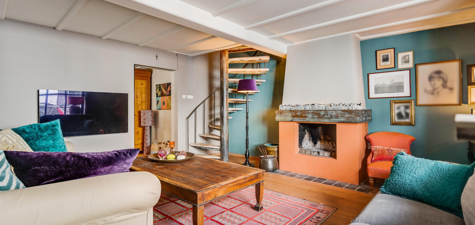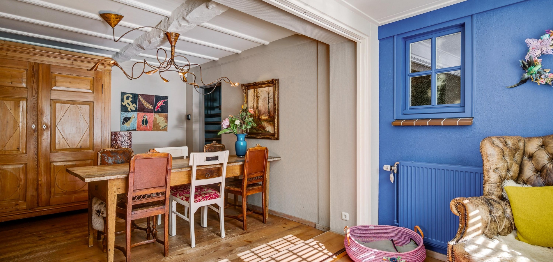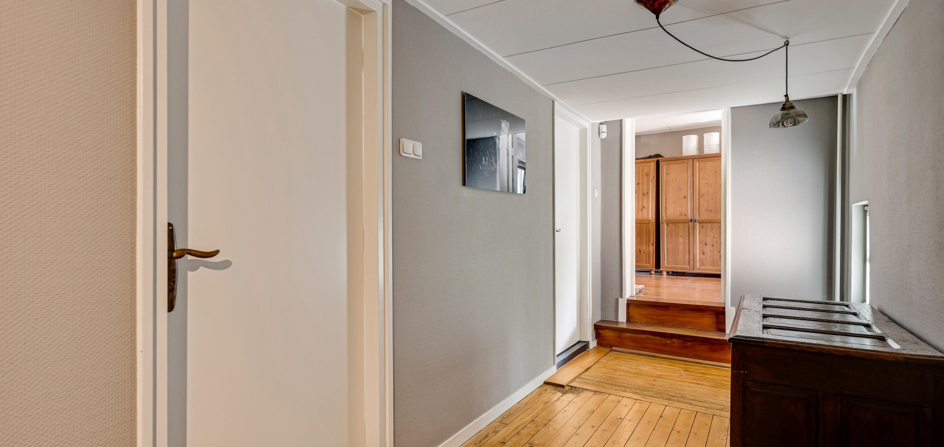 In de fraaie hal, naast de meterkast, is de garderobenis en recht voor u is de toiletruimte, waar oude en nieuwe elementen zijn gecombineerd. De gestucte muren in de hal zijn in een gedurfde, smaakvolle kleur geschilderd en de tegelvloer met patroon geeft de hal een fraaie uitstraling.