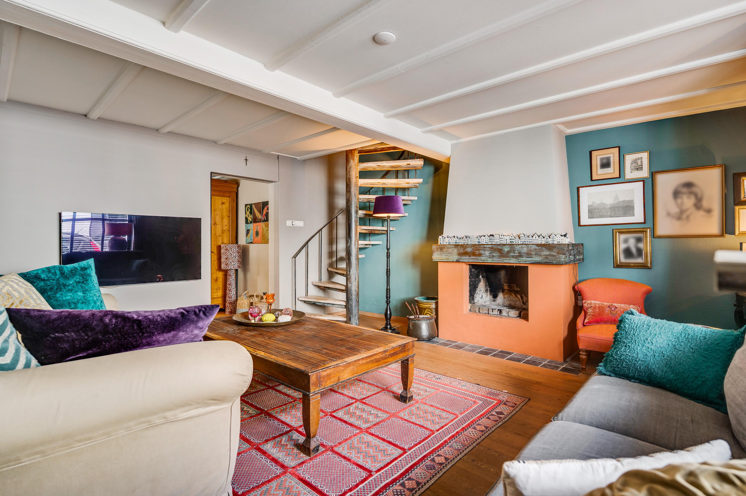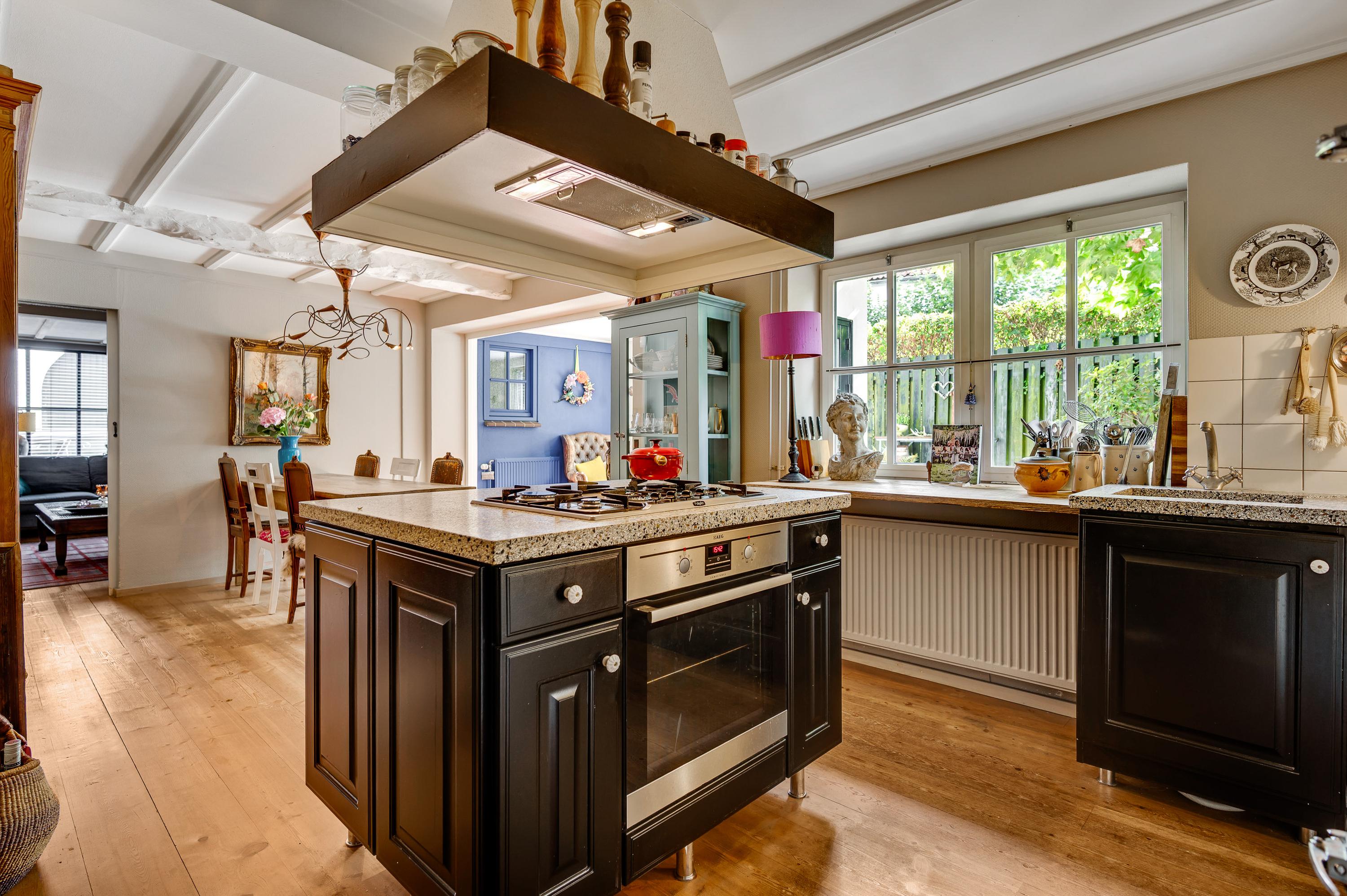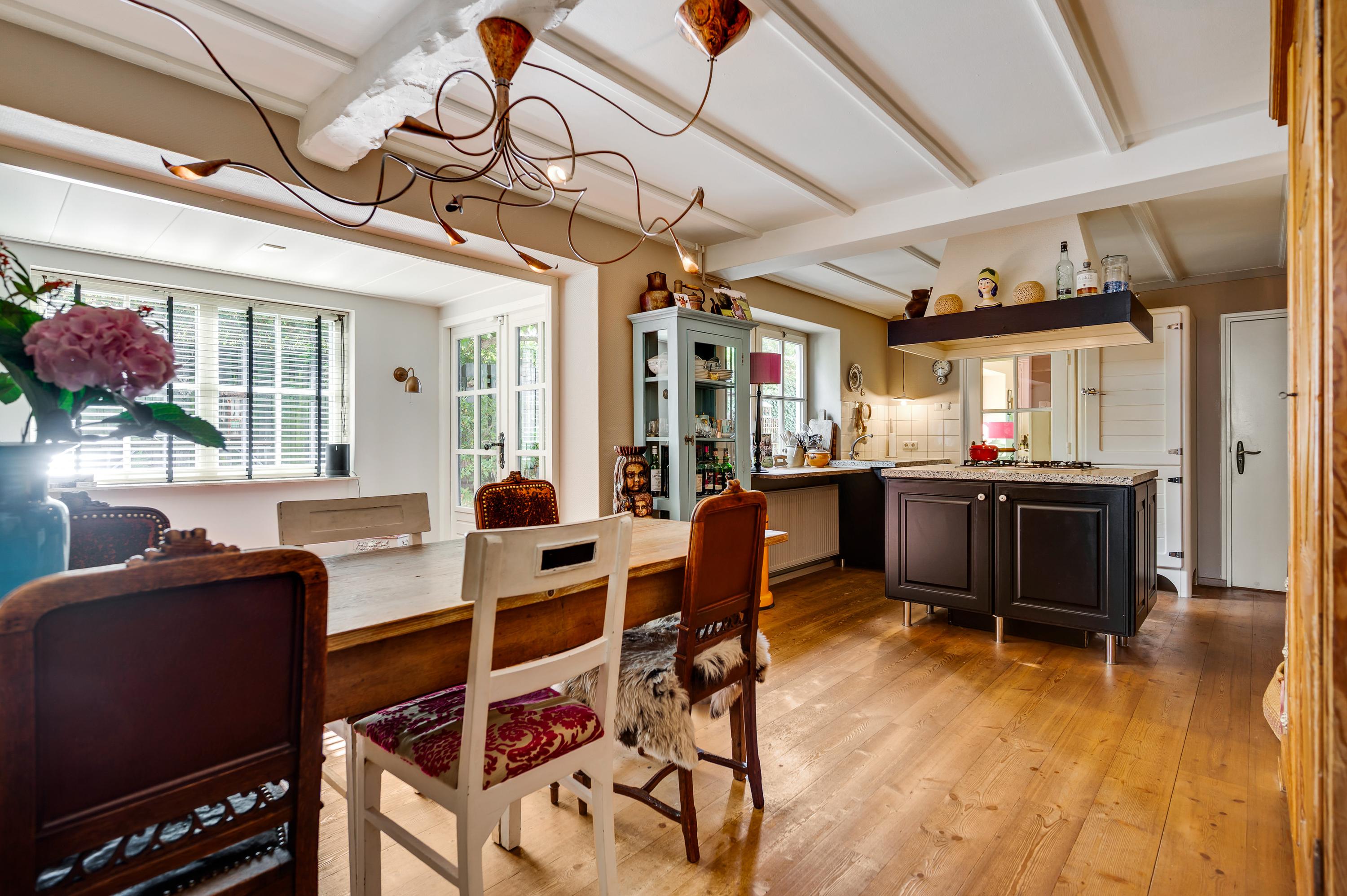 Rechts van de hal is de woonkamer (circa 4,92 x 5,22) met een open haard, een houten vloer met karakter en een prachtige trap naar de eerste verdieping. Deze fraaie ruimte kunt u geheel als zitkamer inrichten, met mooi uitzicht naar de Pieterstraat. Naast de trap is een doorgang naar de woonkeuken, inclusief het lichte zitgedeelte aan de tuinzijde. Er is genoeg plek voor een grote eettafel en de keukenopstelling met kookeiland heeft een stijlvol granito aanrechtblad.