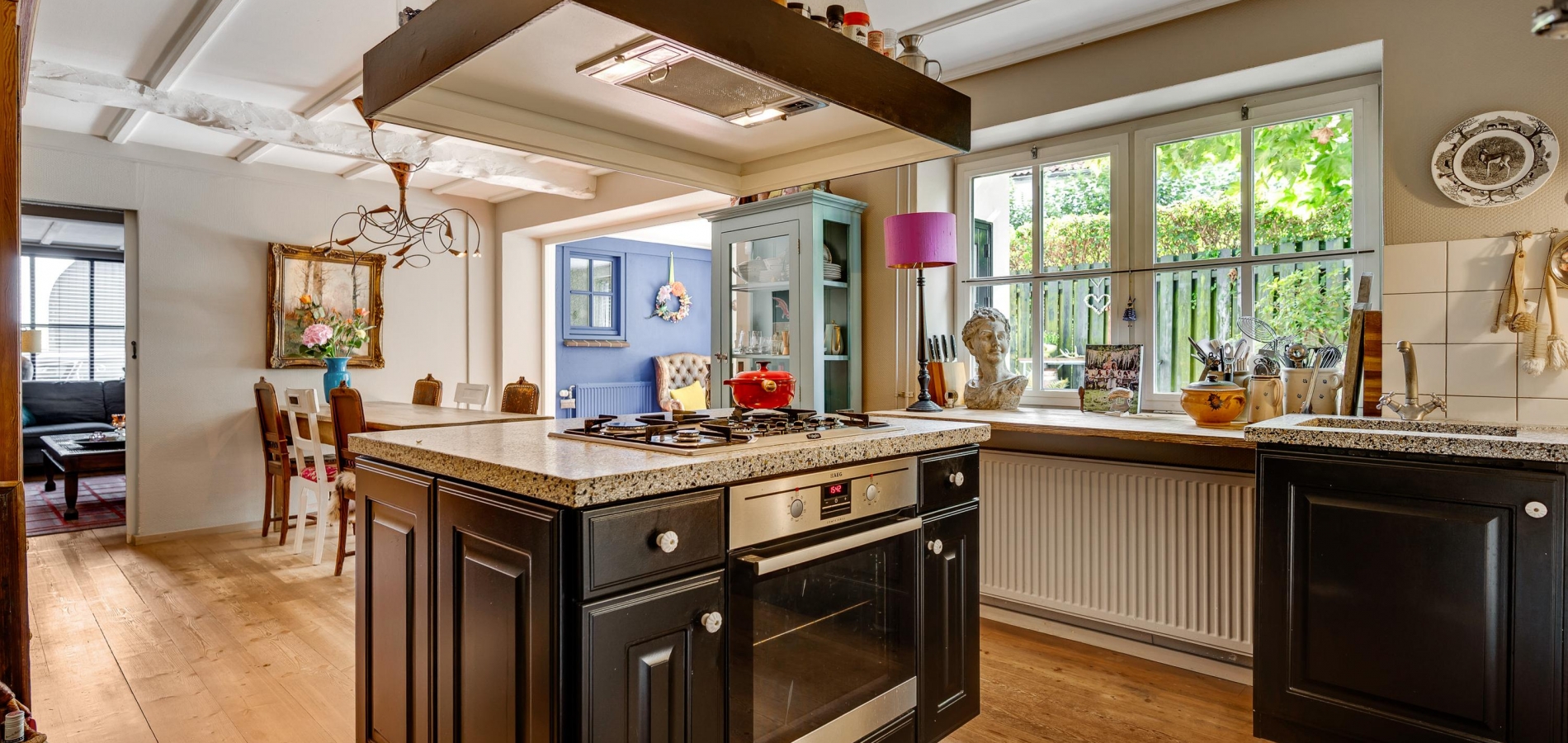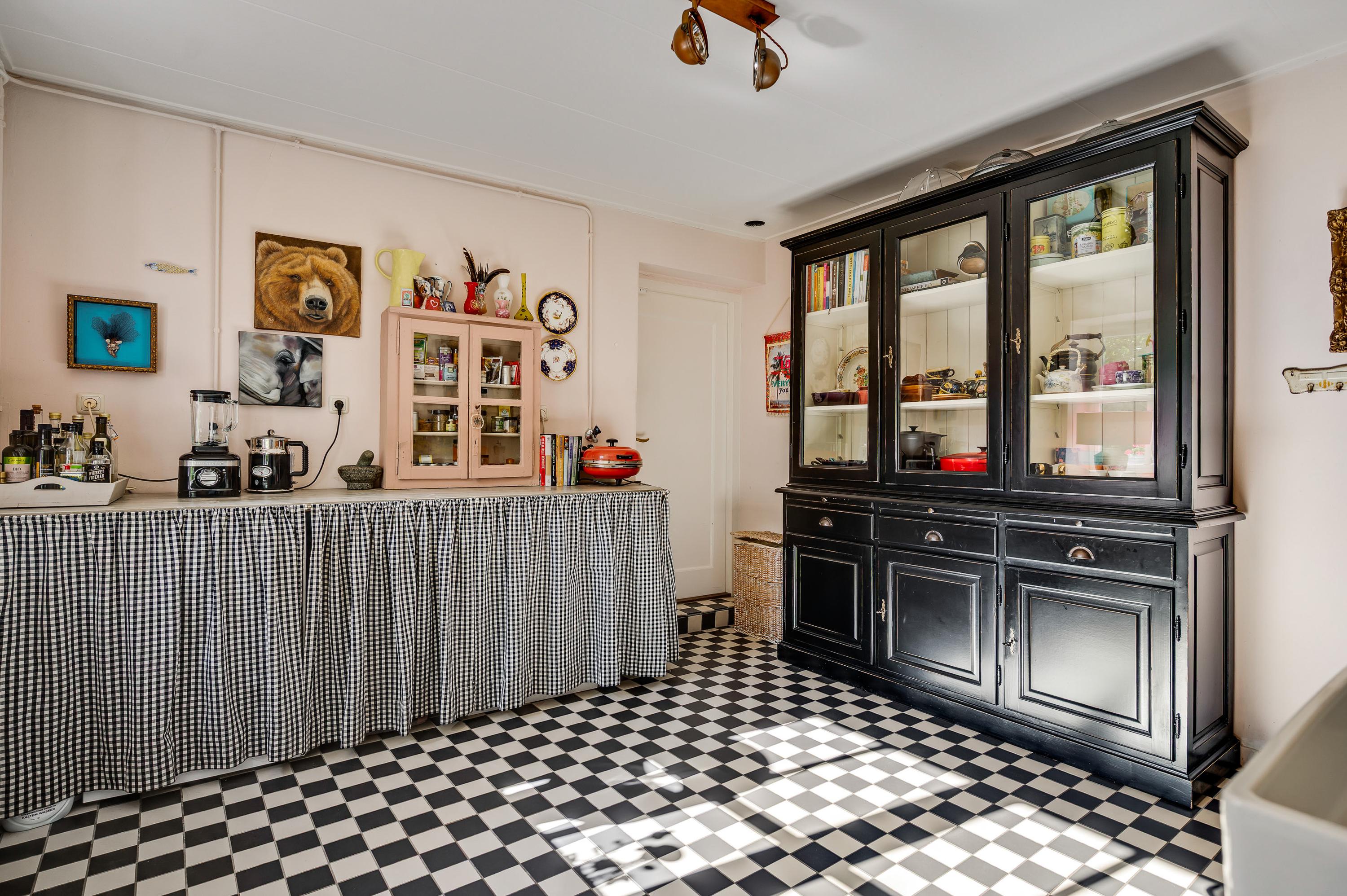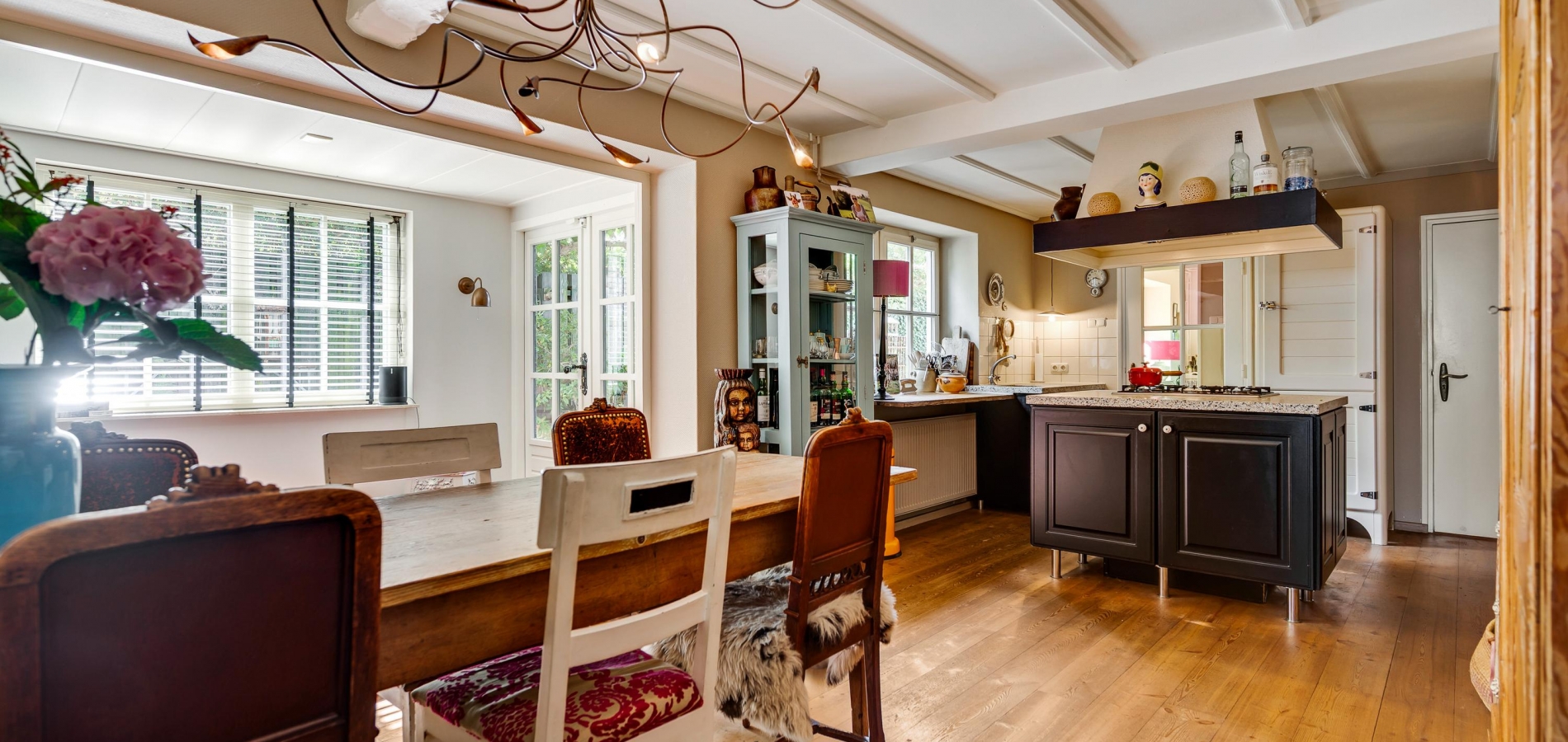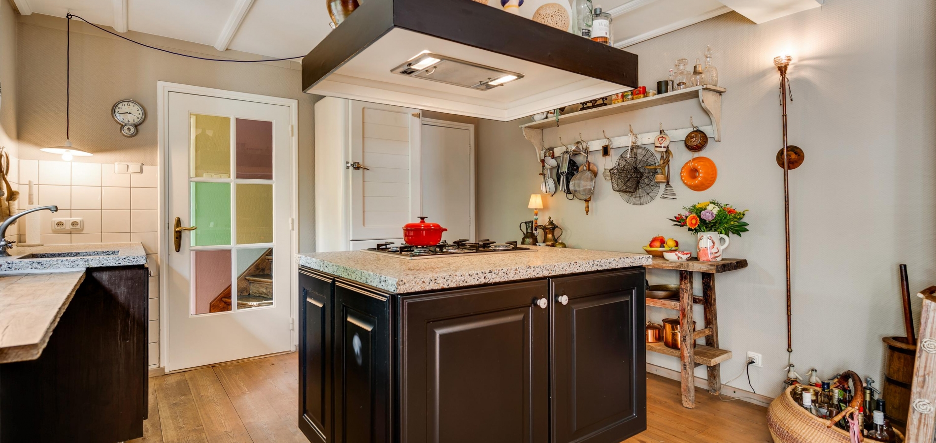 Rechts van de hal is de woonkamer (circa 4,92 x 5,22) met een open haard, een houten vloer met karakter en een prachtige trap naar de eerste verdieping. Deze fraaie ruimte kunt u geheel als zitkamer inrichten, met mooi uitzicht naar de Pieterstraat. Naast de trap is een doorgang naar de woonkeuken, inclusief het lichte zitgedeelte aan de tuinzijde. Er is genoeg plek voor een grote eettafel en de keukenopstelling met kookeiland heeft een stijlvol granito aanrechtblad.