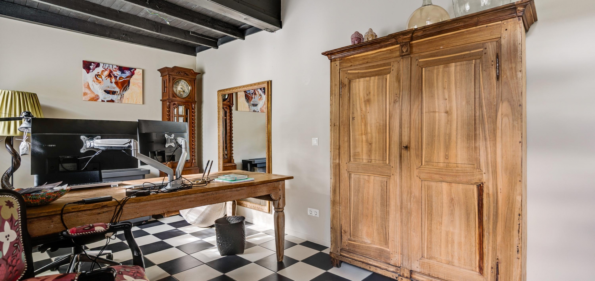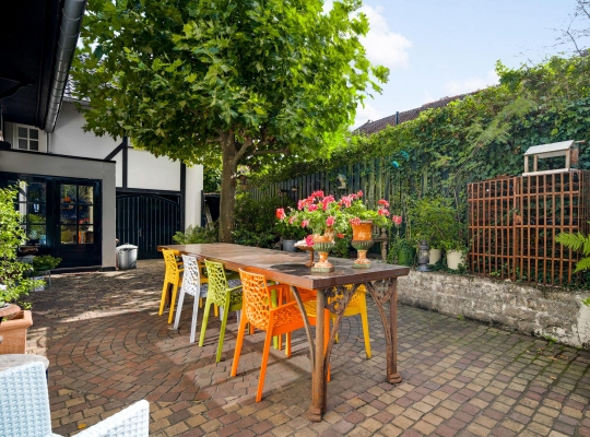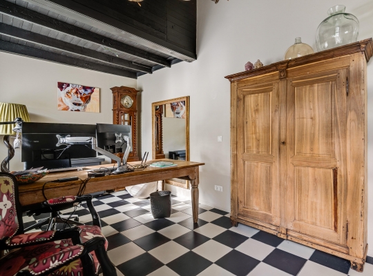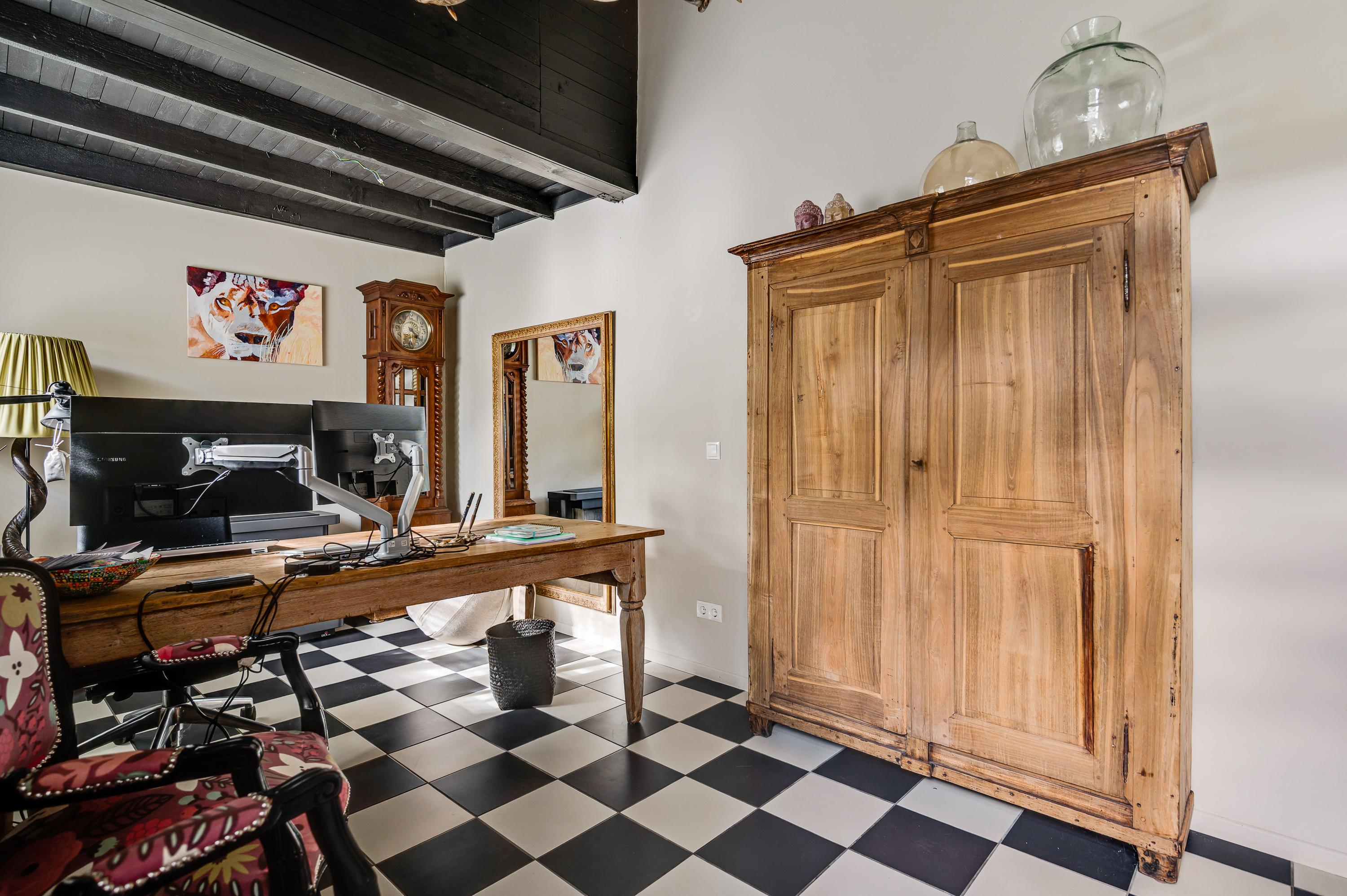 Een tweede hal verbindt de keuken met de tuin en de bijkeuken. Dit is een verrassende ruimte met veel lichtinval, een grote wastafel en een wit-zwart geblokte vloer. Vanuit hier heeft u toegang tot een kantoorruimte (circa 5,42 x 2,39), met een aangename hoogte en een directe toegang tot de tuin.