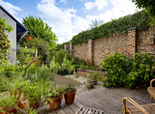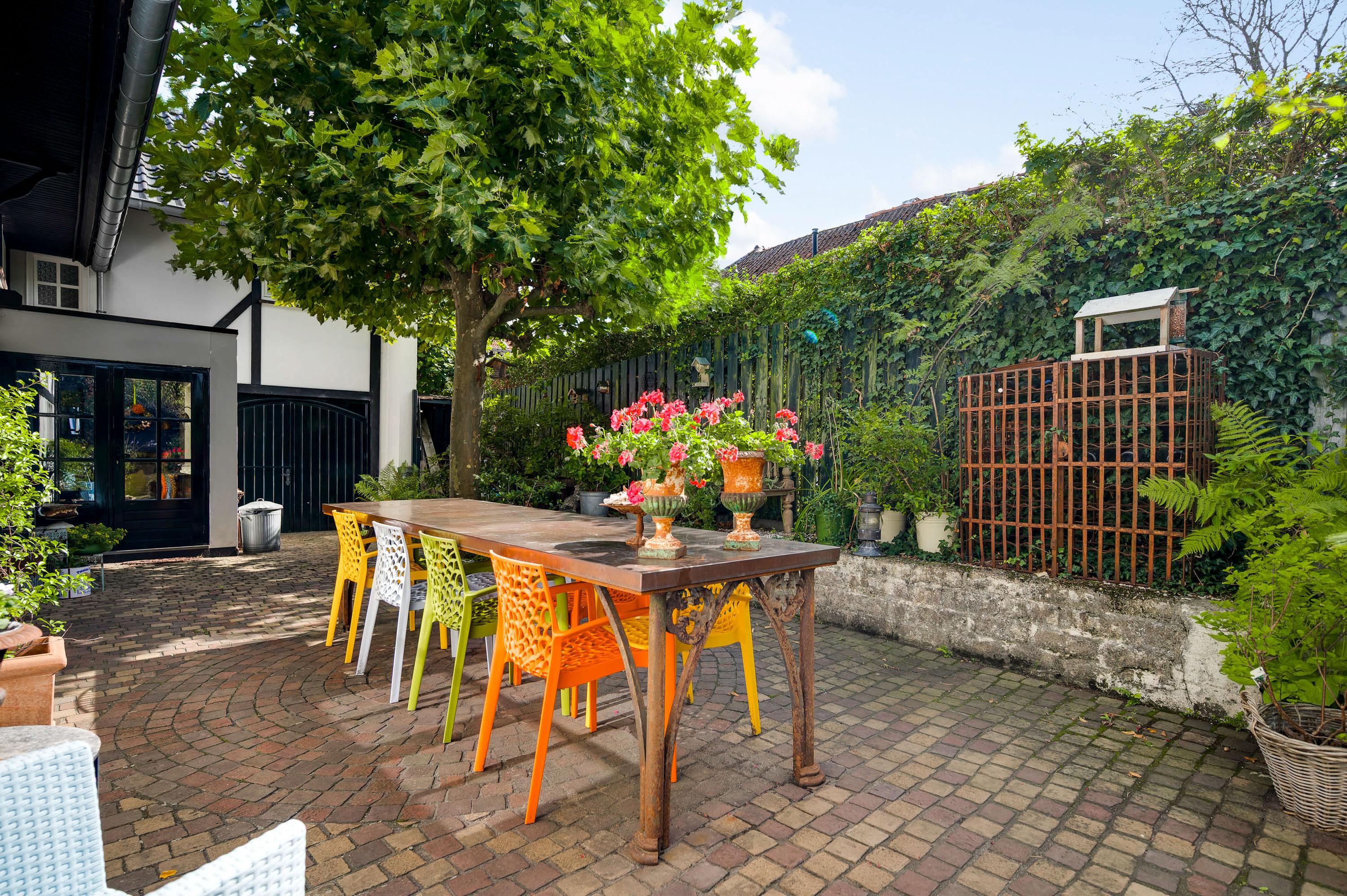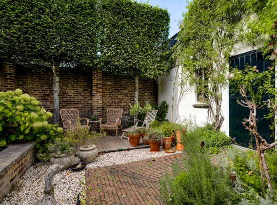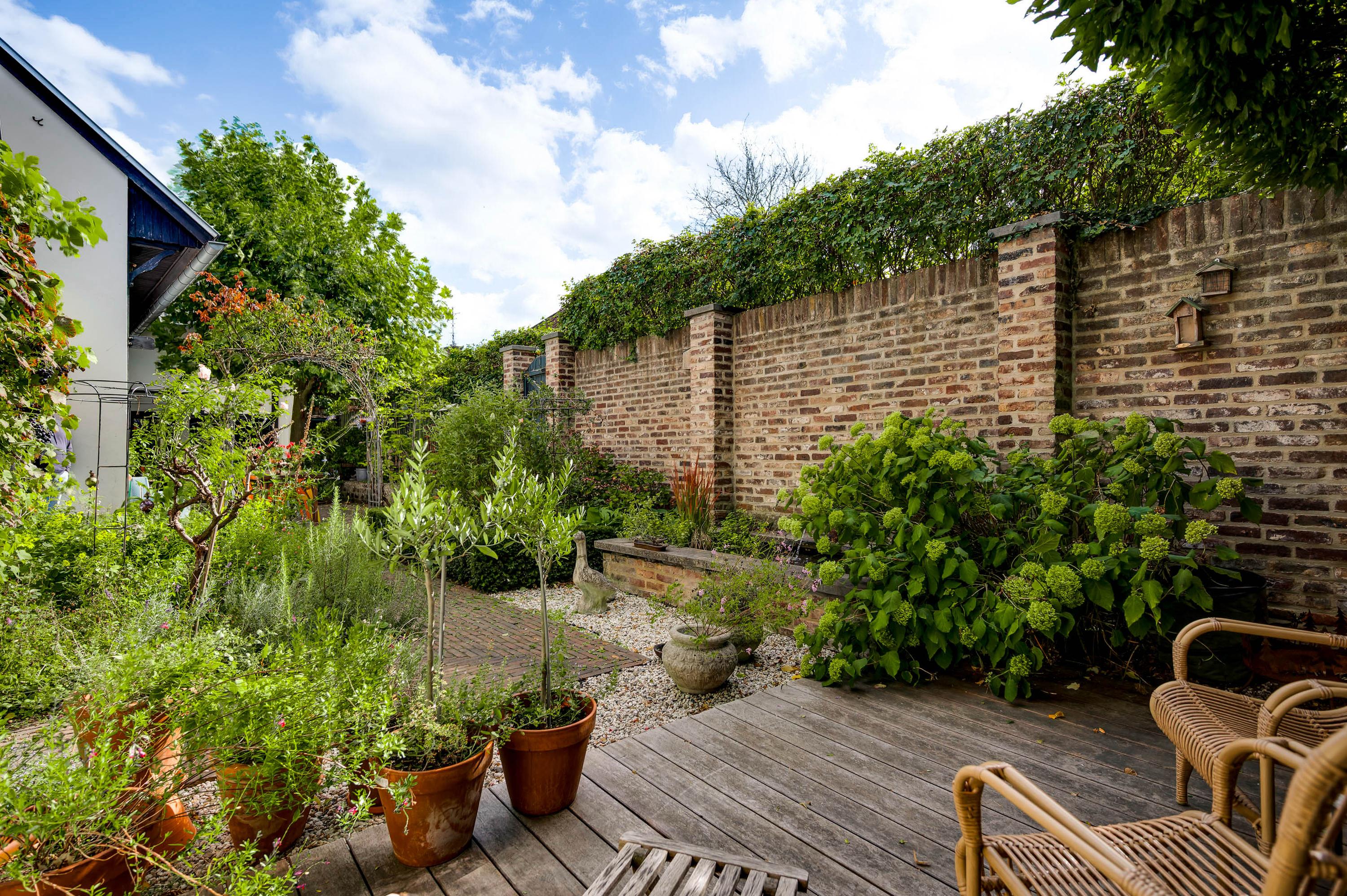 De meer dan 22 meter lange tuin is een oase van groen, boordevol sfeer en met veel privacy. Gemetselde tuinmuren en houten schuttingen vormen samen een mooie erfafscheiding, en er is een poort naar de openbare weg, die tevens toegang biedt tot de garage. Het terras is een heerlijke plek om te borrelen en eten, samen en met vrienden of familie. In het achterste deel van de tuin, bij de vijver, zijn een tweede terras en een berging (circa 4,38 x 2,39) met vliering. Een onderdoorgang, met dubbele deuren aan de tuin- en straatzijde, is een praktische ruimte voor de fietsen en andere spullen.