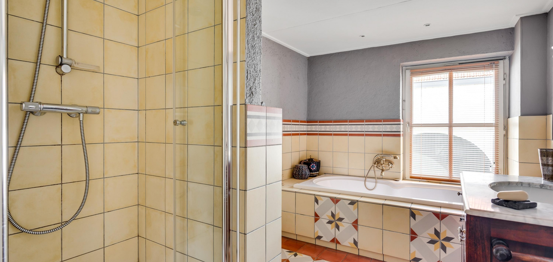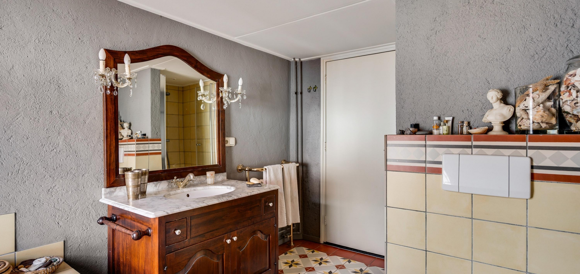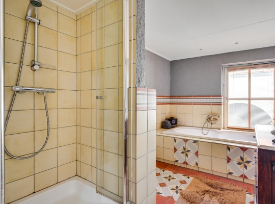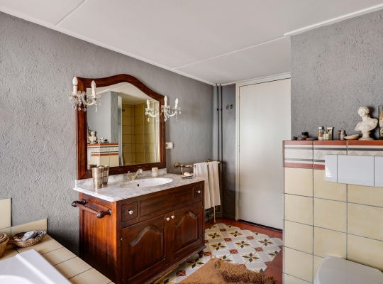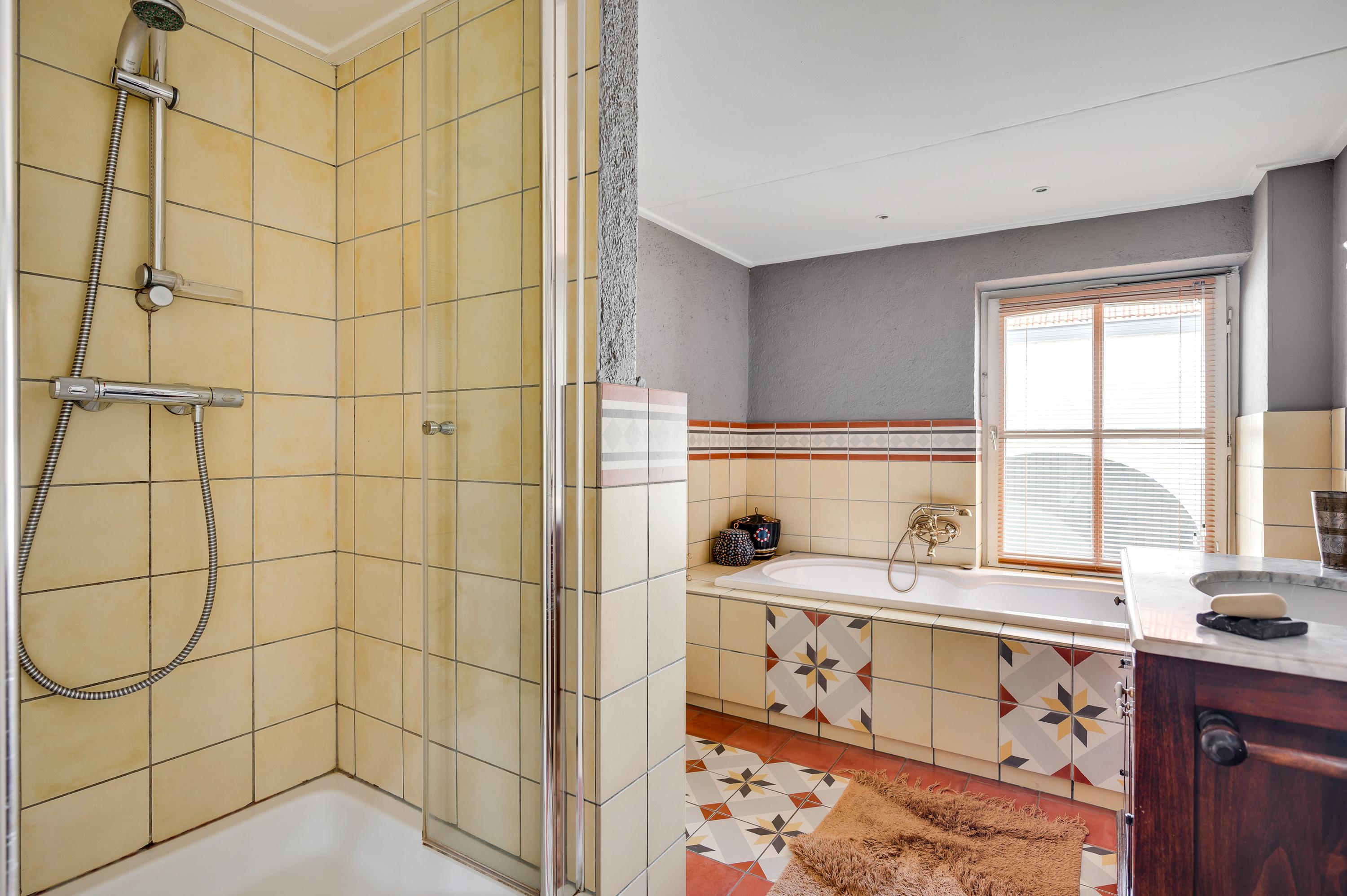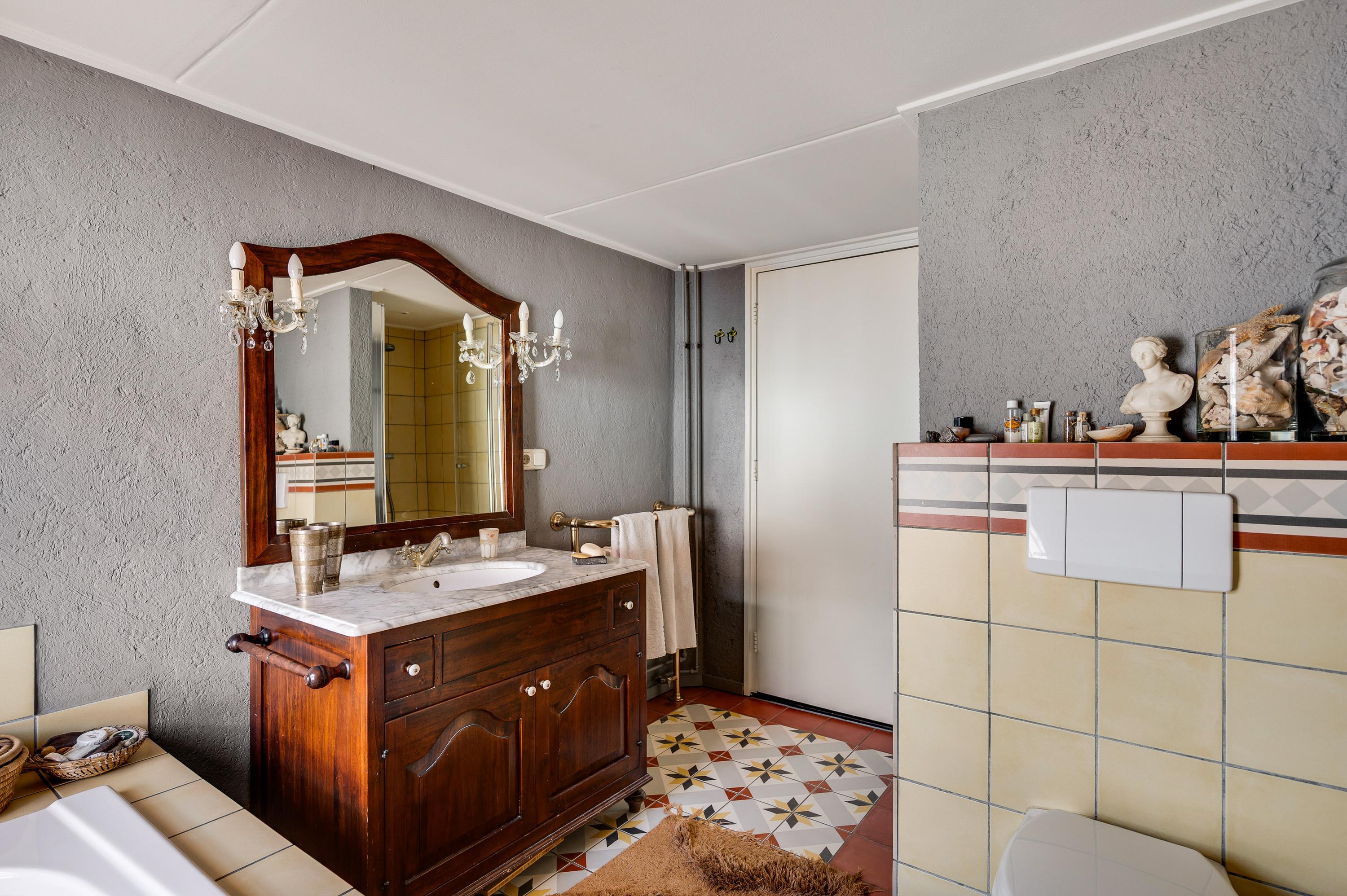 Aan de voorzijde, boven de entree, is de badkamer (circa 3,28 x 2,38) met tegelvloer in een herkenbare, klassieke stijl. Bij het raam staat het ligbad en de rest van de badkamer is ingedeeld met een douche, toilet en een houten wastafelmeubel met een marmeren blad.