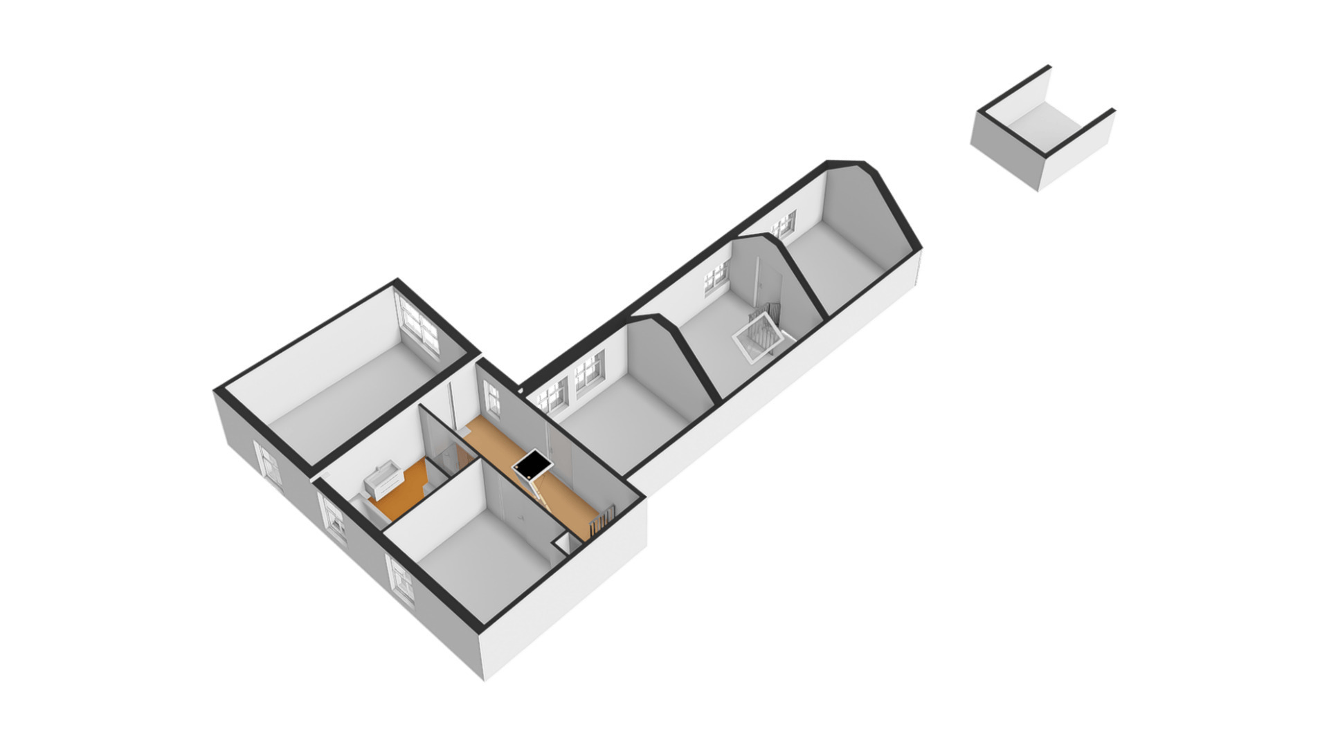 In de tweede hal, in de aanbouw, is een trap naar een werkkamer, met een hoge nok en lichtinval aan twee zijden. Deze multifunctionele kamer, eventueel te gebruiken als extra slaapkamer, geeft toegang tot slaapkamer I met uitzicht naar de tuin.