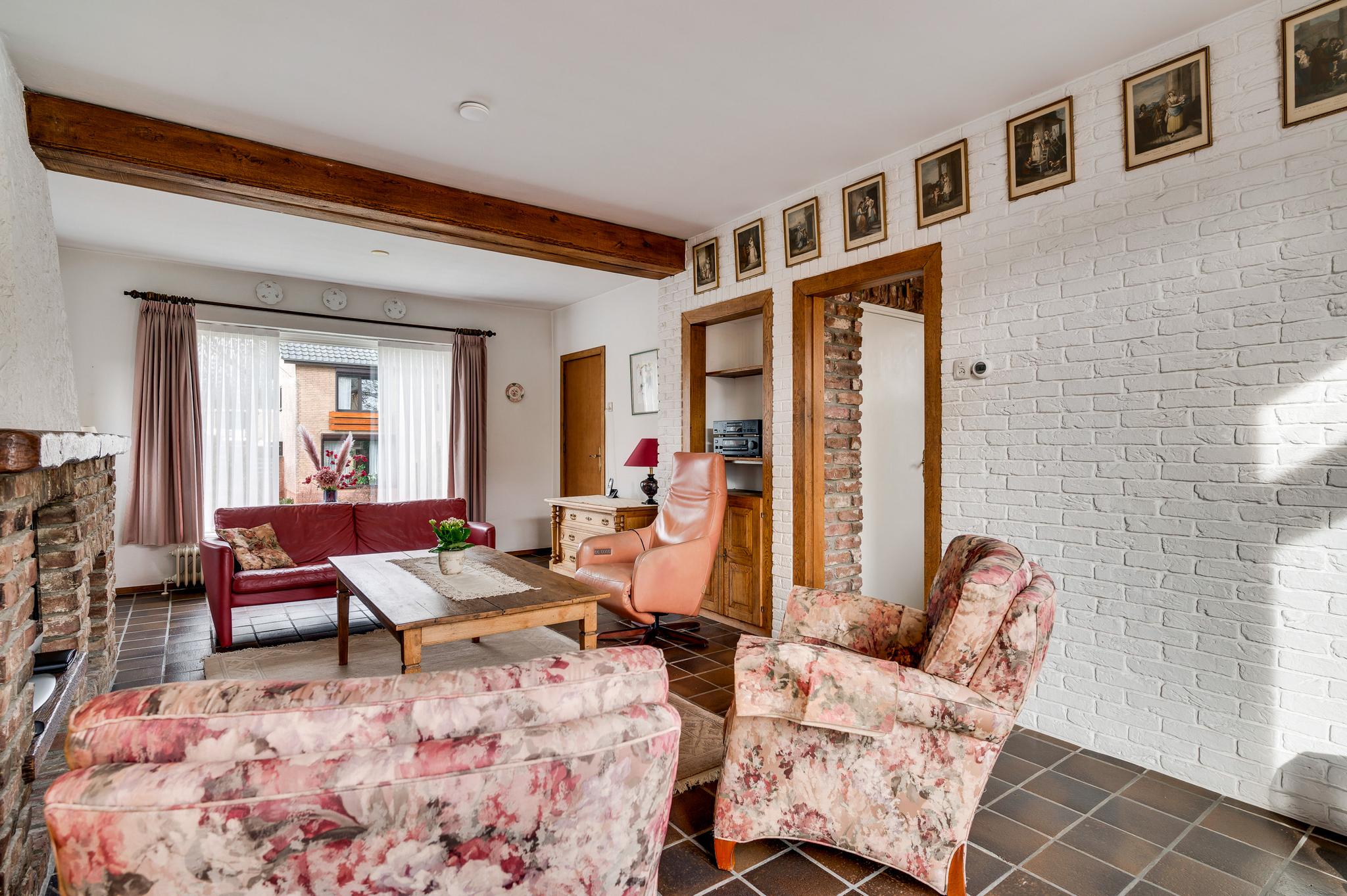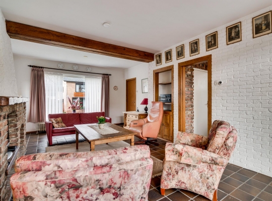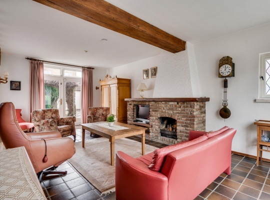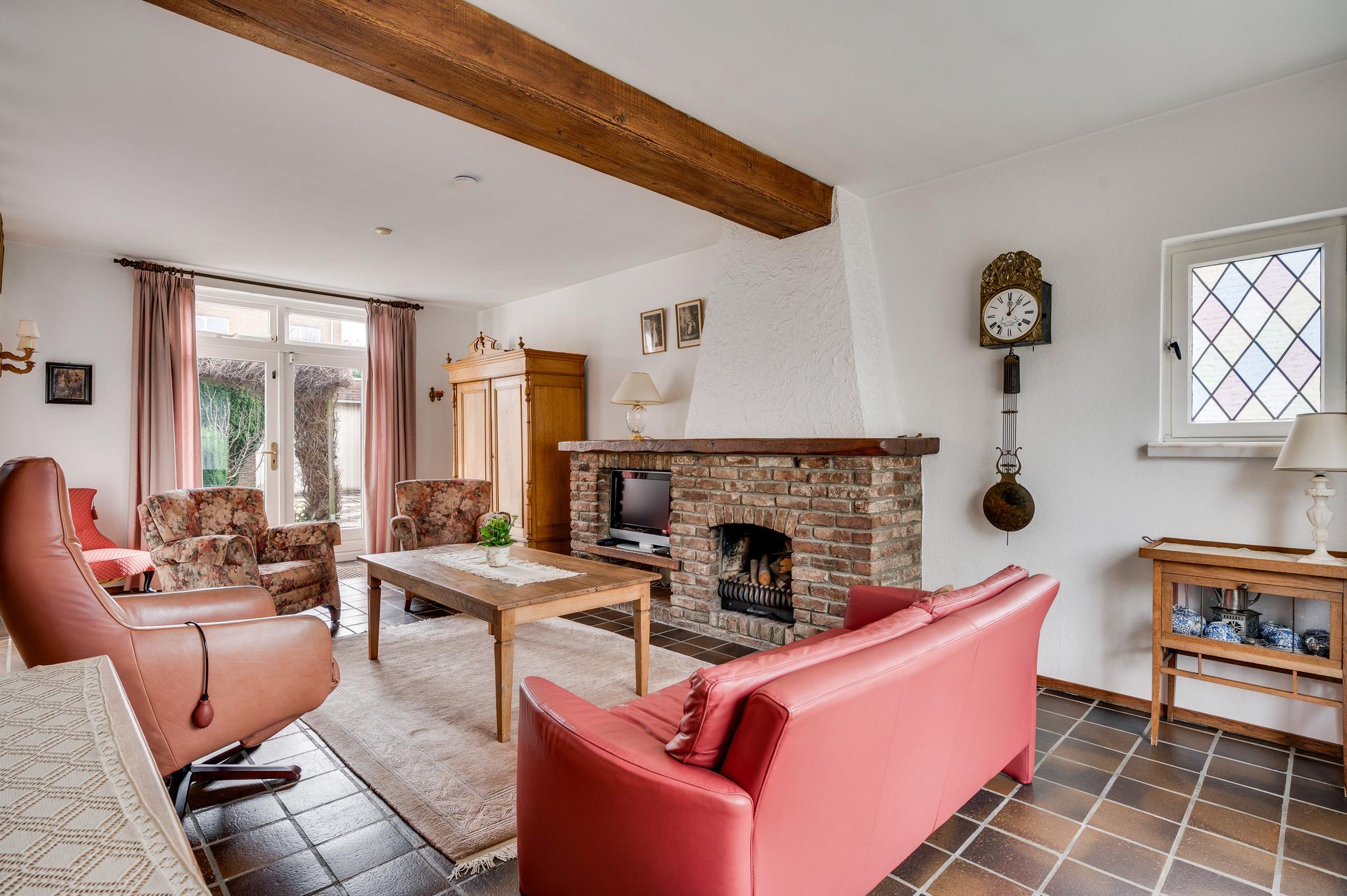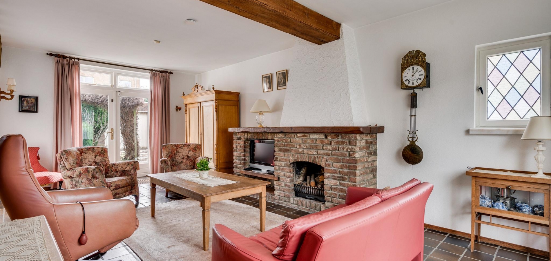 Rechts in de hal is een deur naar de woonkamer (4,01/3,62 x 7,15) met een kleurrijk glas in loodraam, openslaande deuren en mooi uitzicht naar de straat. Deze gezellige leefruimte, met open haard en grote schouw, kan geheel als zitkamer worden ingericht.