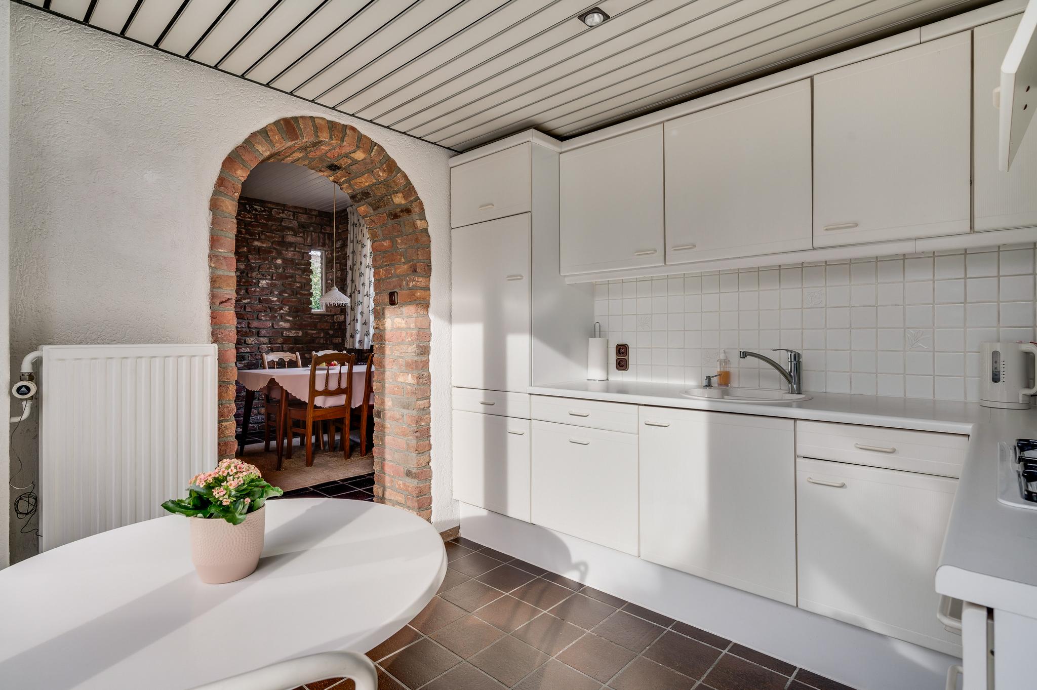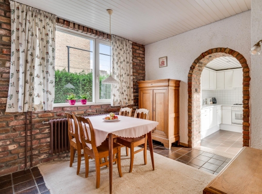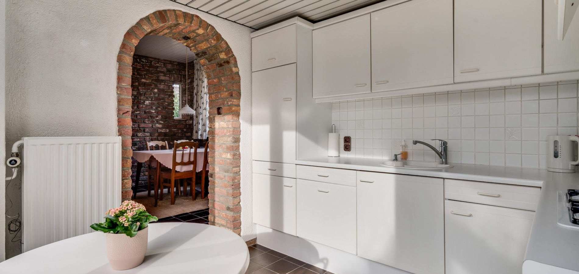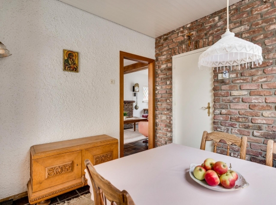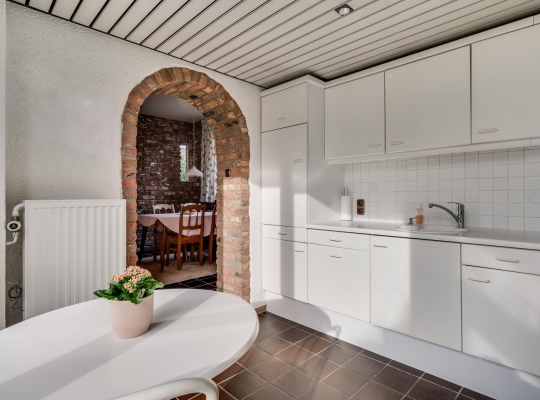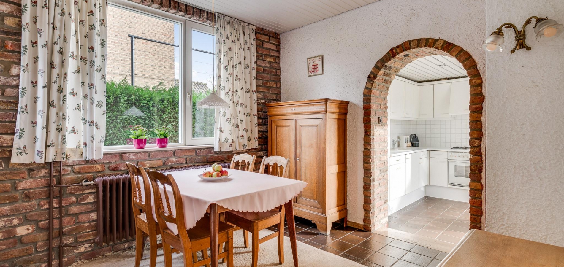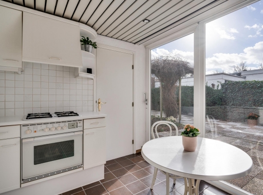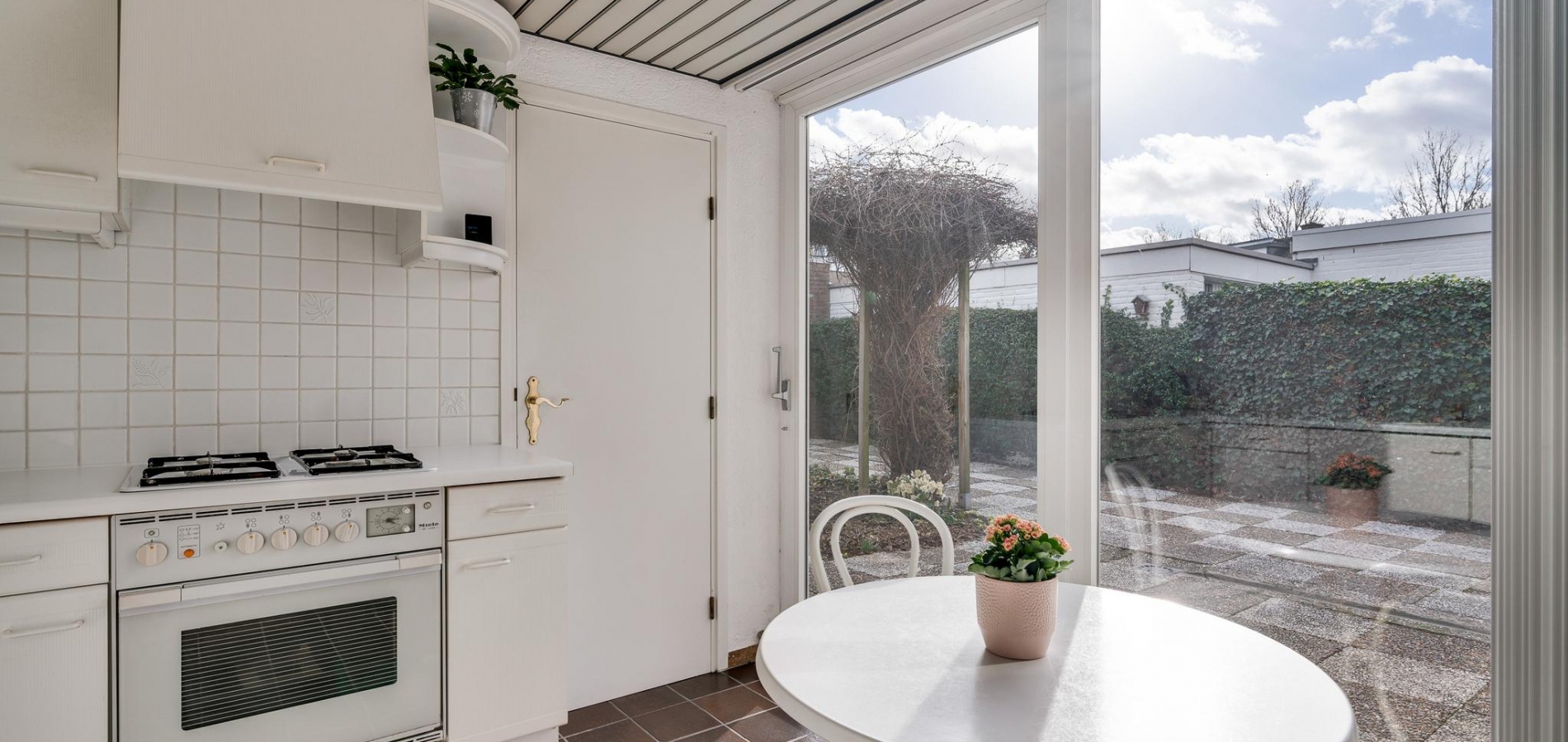 Vanuit de hal en woonkamer is de eetkamer (3,24 x 2,98) te bereiken, die grenst aan de keuken (2,90 x 2,86) met schuifpui naar het terras. De lichte hoekopstelling is voorzien van een gaskookplaat, afzuigkap, oven en een koelkast.