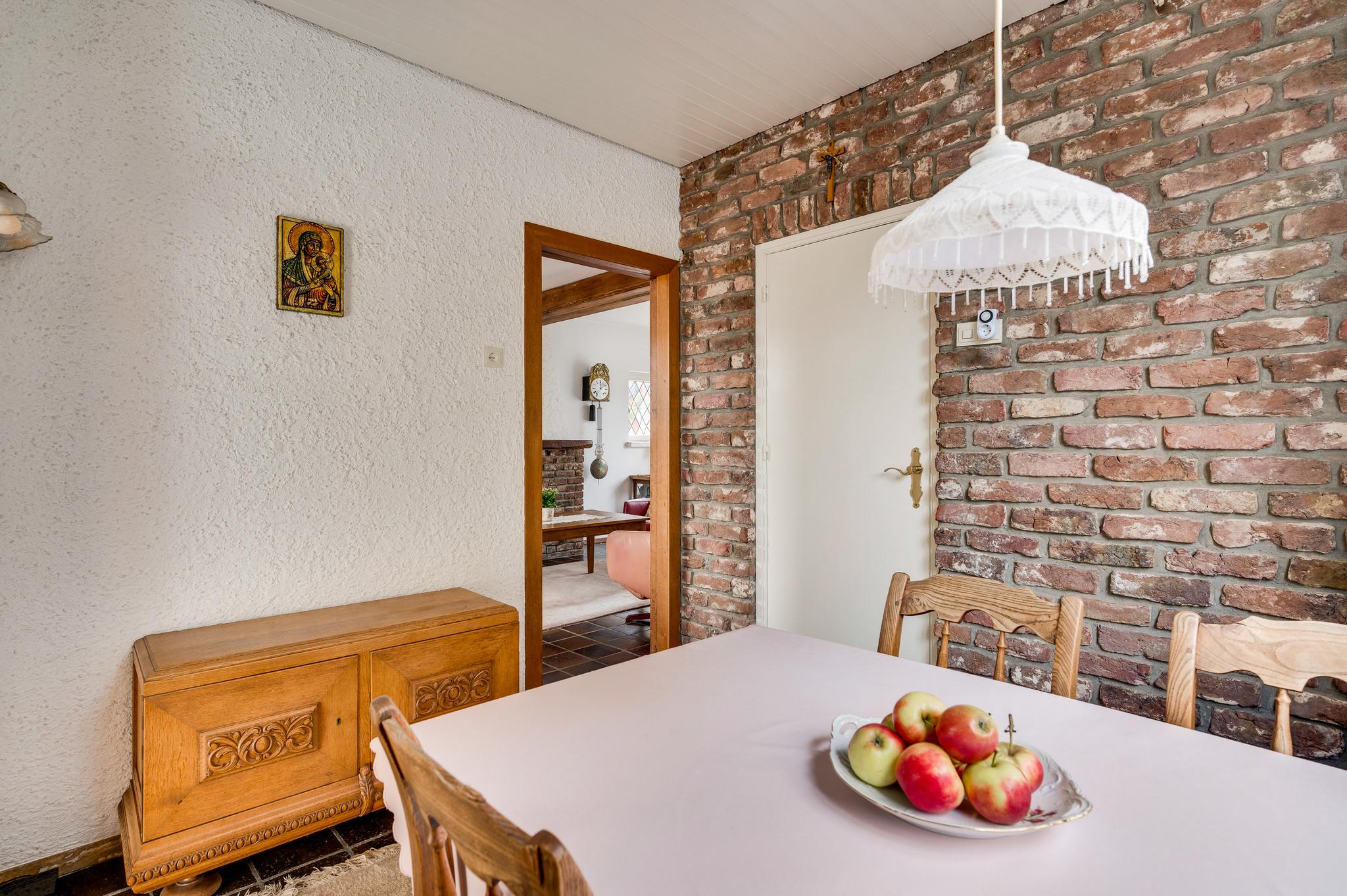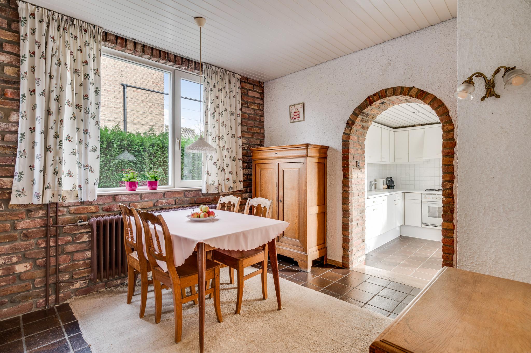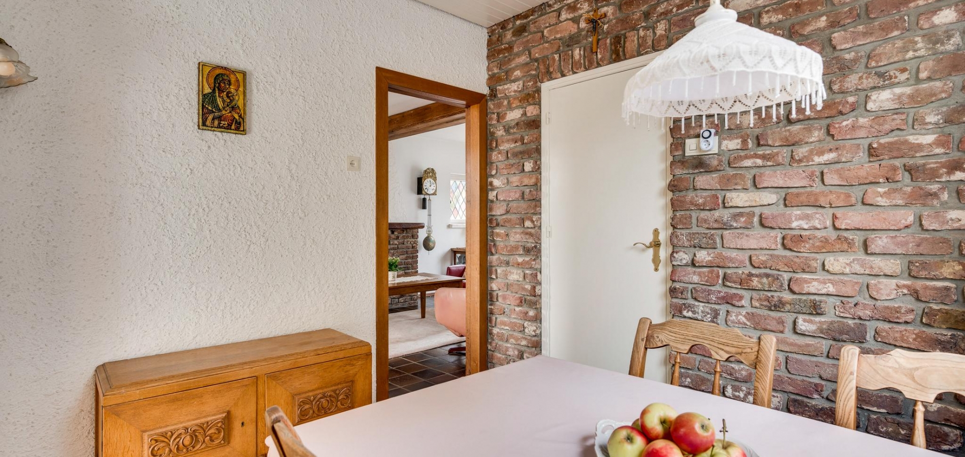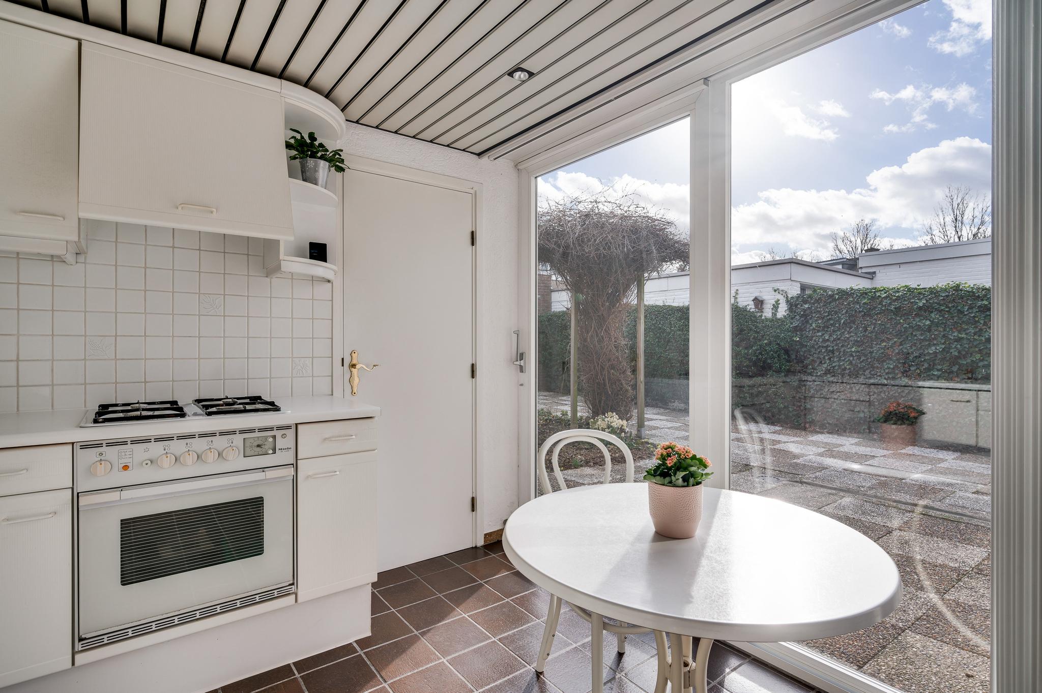 Vanuit de hal en woonkamer is de eetkamer (3,24 x 2,98) te bereiken, die grenst aan de keuken (2,90 x 2,86) met schuifpui naar het terras. De lichte hoekopstelling is voorzien van een gaskookplaat, afzuigkap, oven en een koelkast.