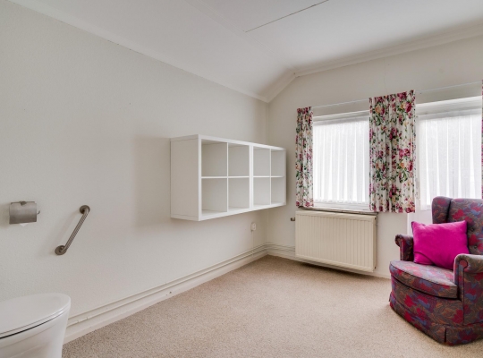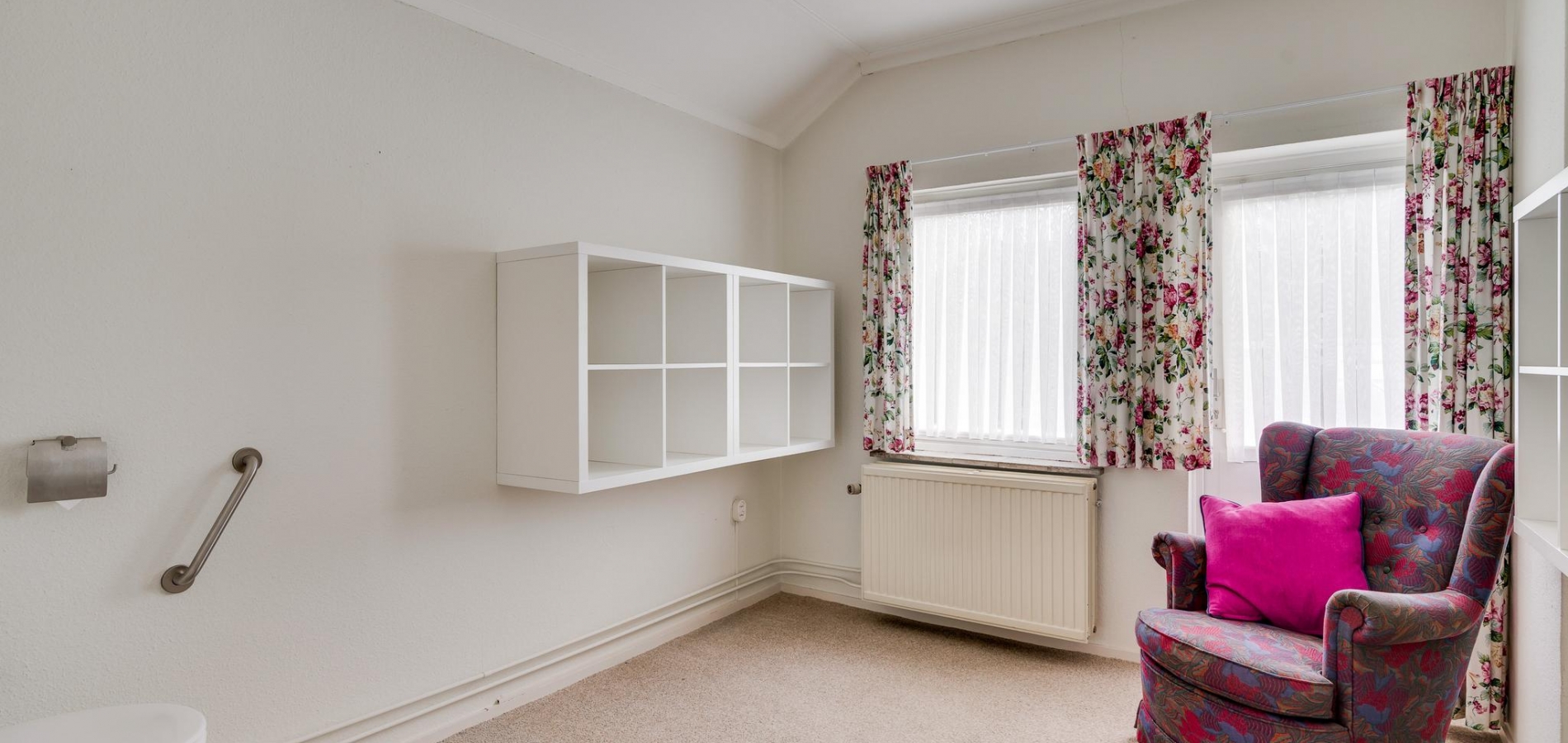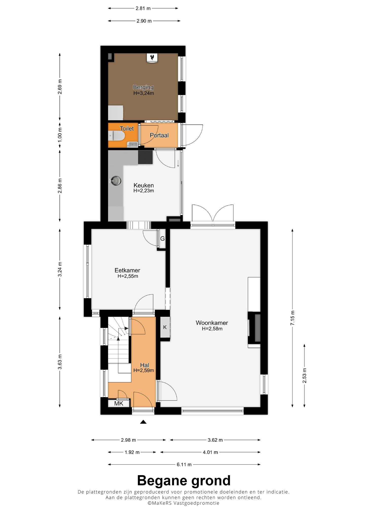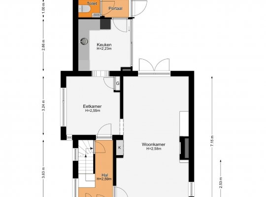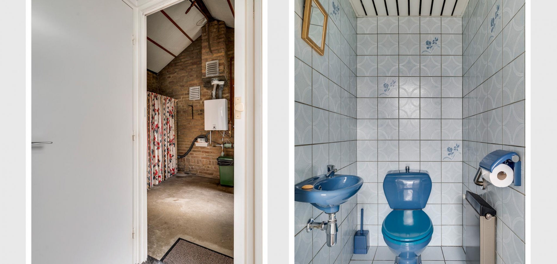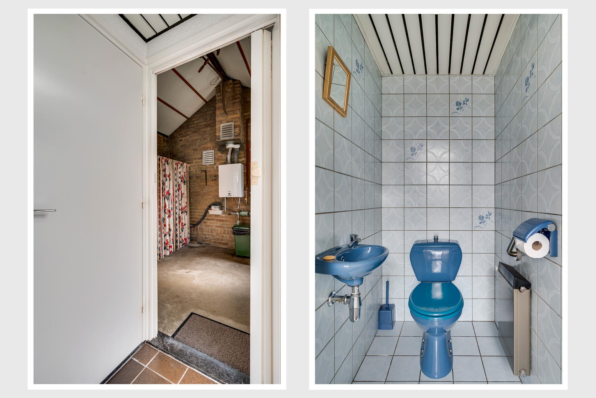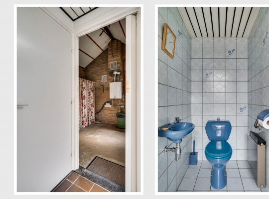 In het verlengde van de keuken is een portaal met de toiletruimte en een bijkeuken/berging (2,81 x 2,69). In deze ruimte, met zicht tot in de nok, is de opstelling van de HR-ketel (Remeha Avanta, eigendom).