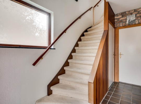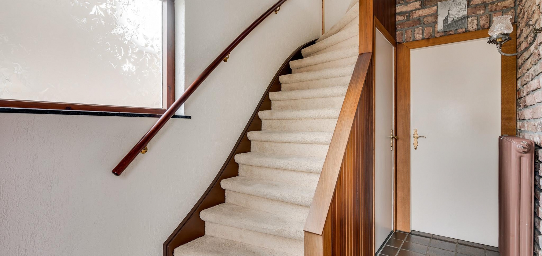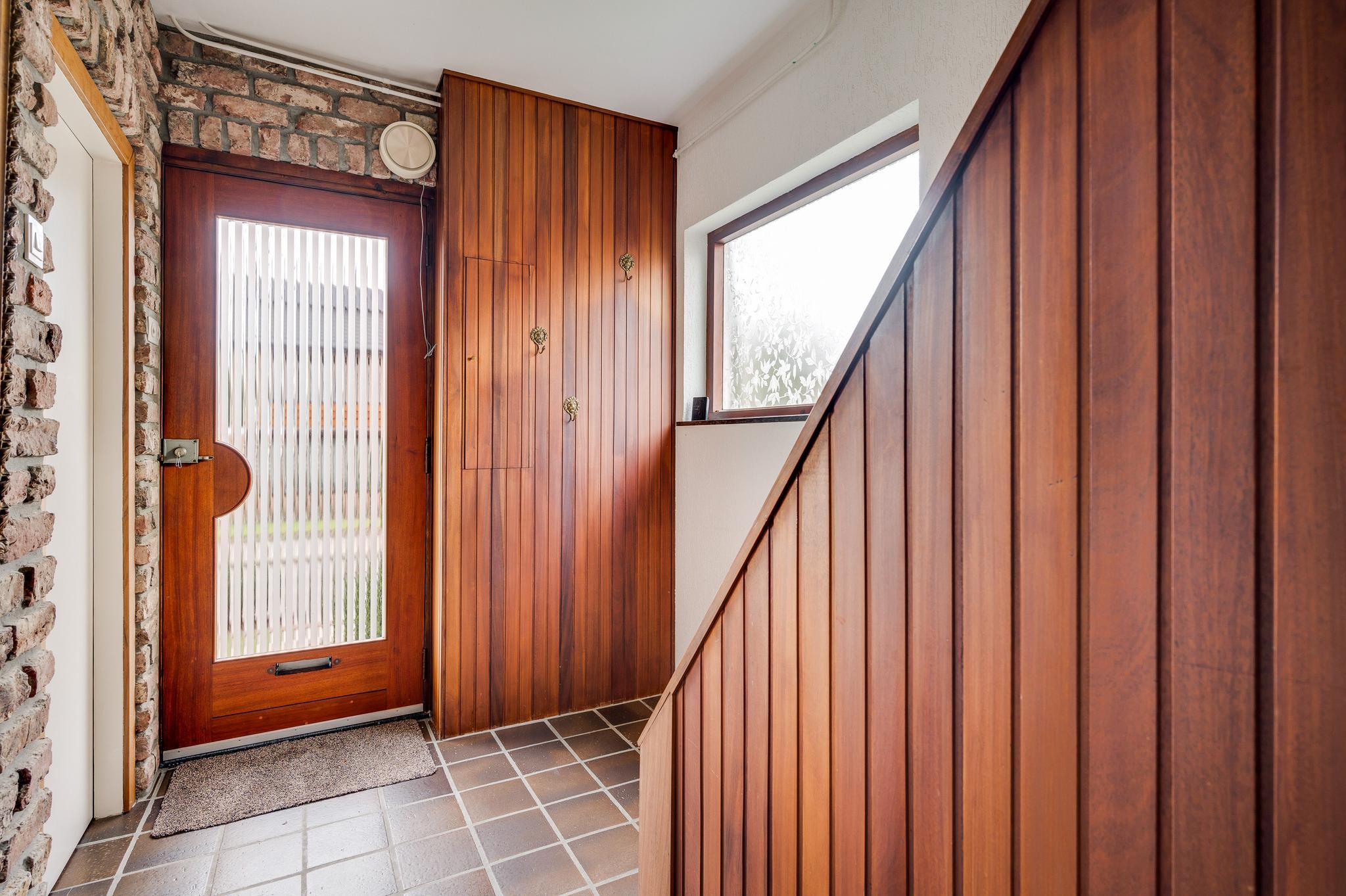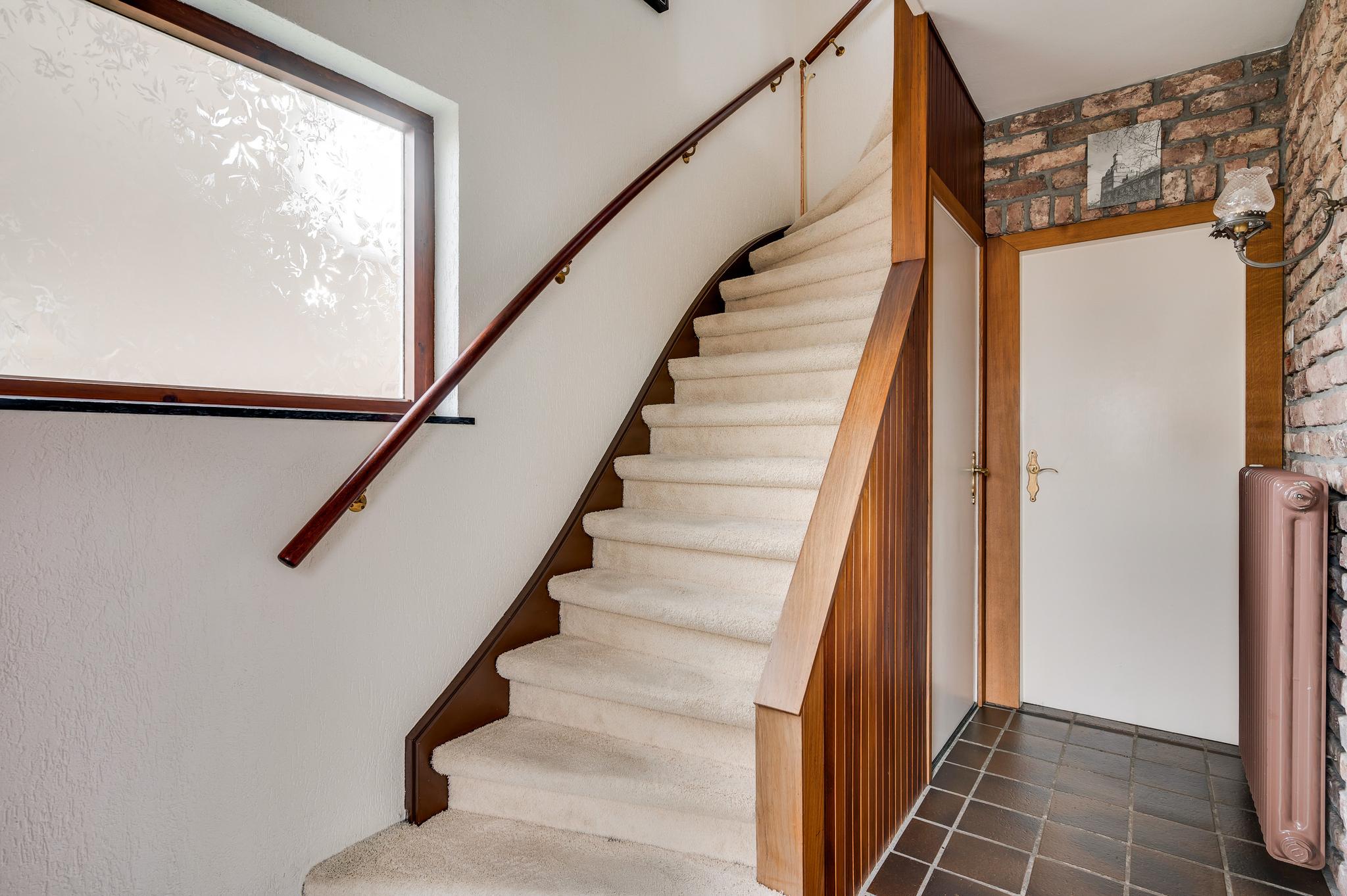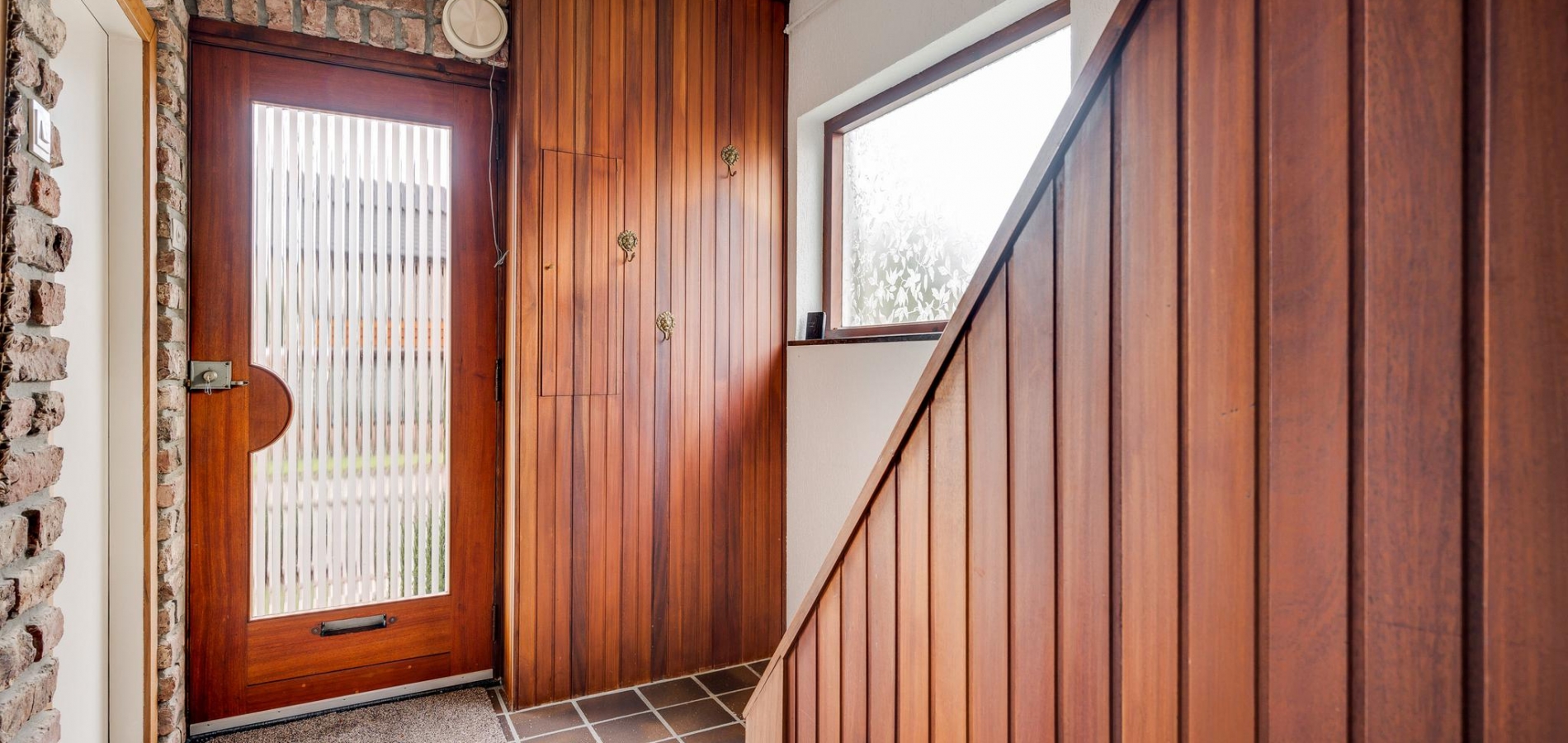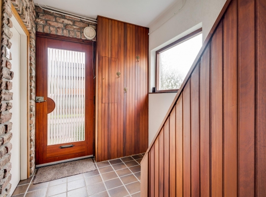 De overdekte entree met metselwerk en originele voordeur heeft een fraaie uitstraling. In de hal met groot zijraam ziet u de met tapijt beklede trapopgang, de meterkast en deels schoonmetselwerk.