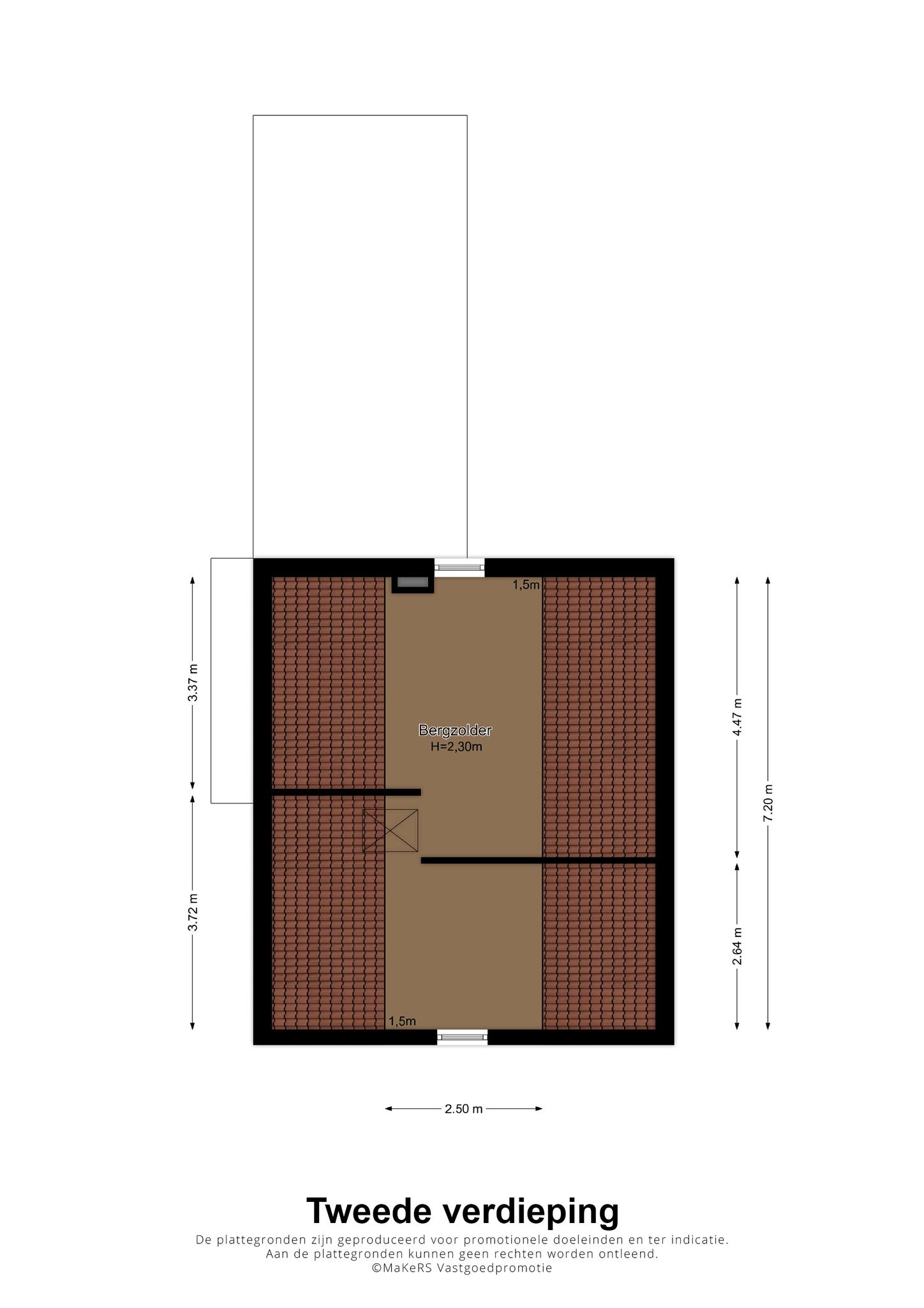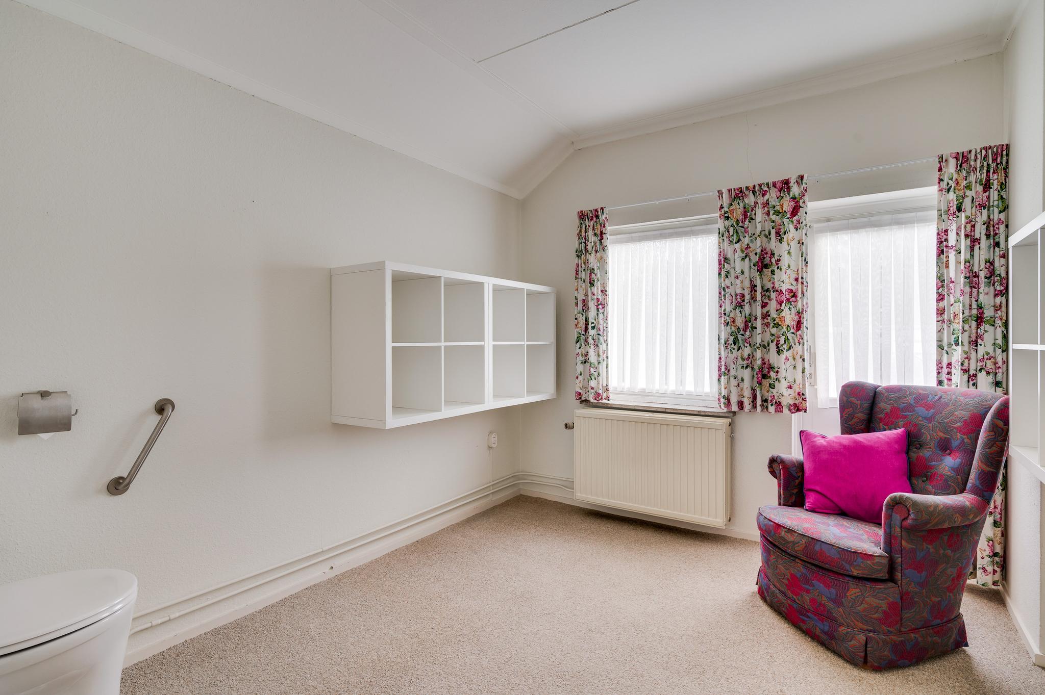 Een luik met trap geeft toegang tot de zolder met een vloeroppervlakte van circa 6,00 x 7,20 en een nokhoogte van 2,30 meter. Na plaatsing van een vaste trap, een dakraam, isolatie en afwerking is het mogelijk om hier een of twee extra kamers te realiseren.