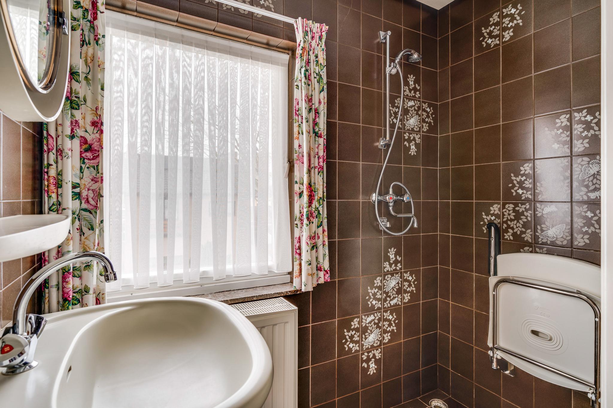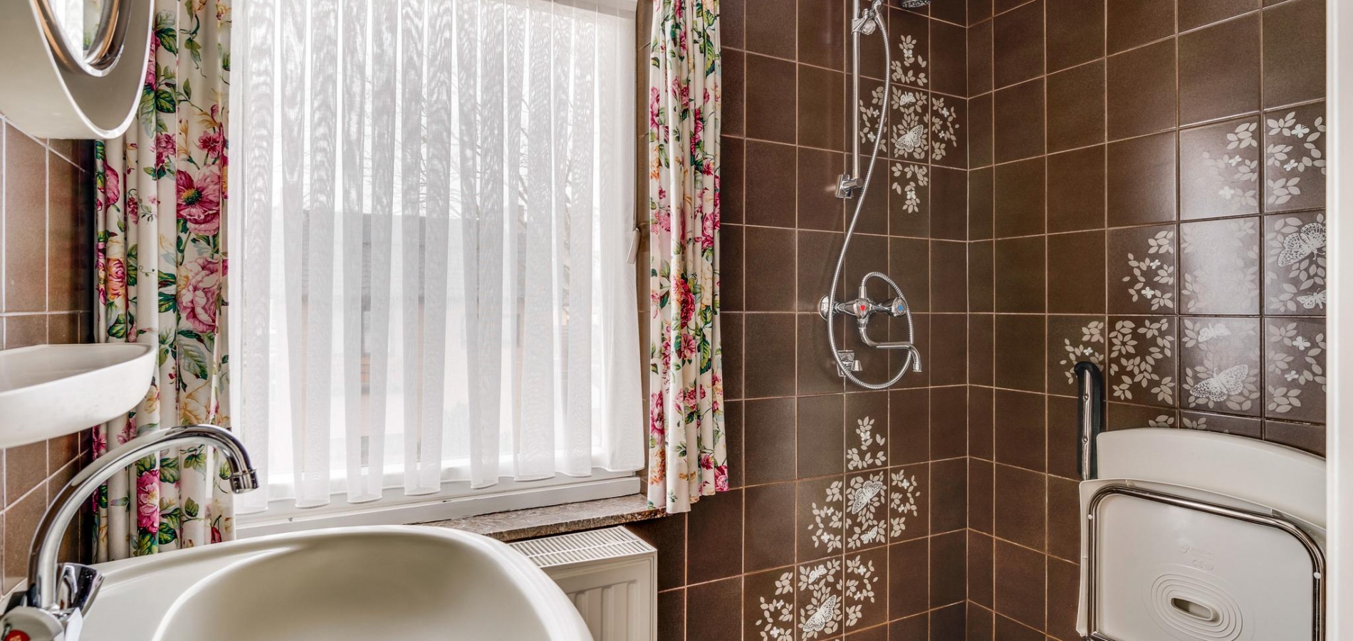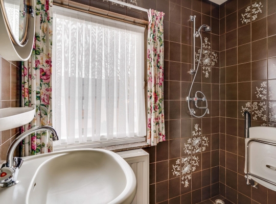 De doucheruimte (1,93 x 1,14) met wastafel, originele wandtegels en groot raam biedt, net als de rest van het huis, ruimte om naar eigen smaak te vernieuwen.