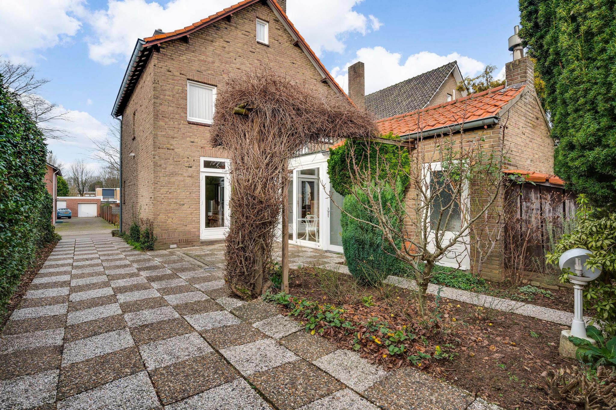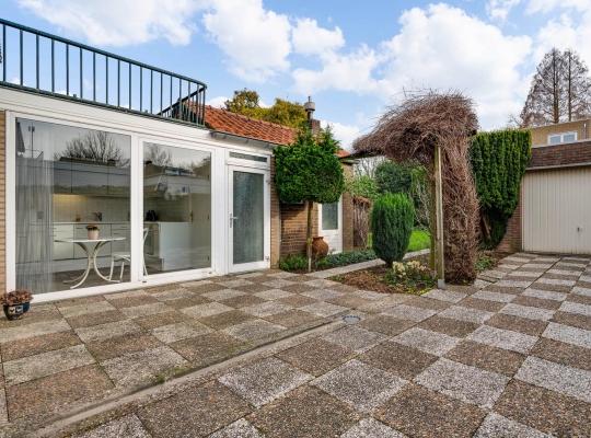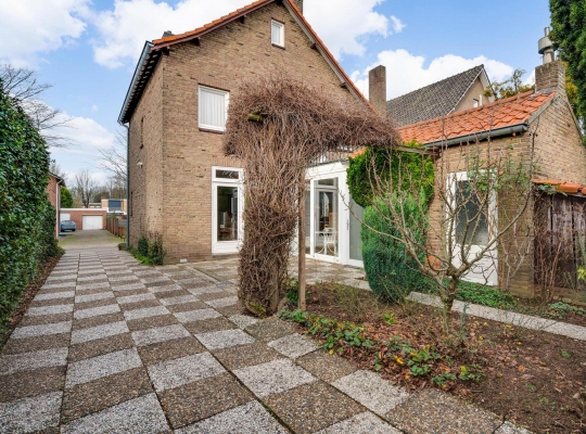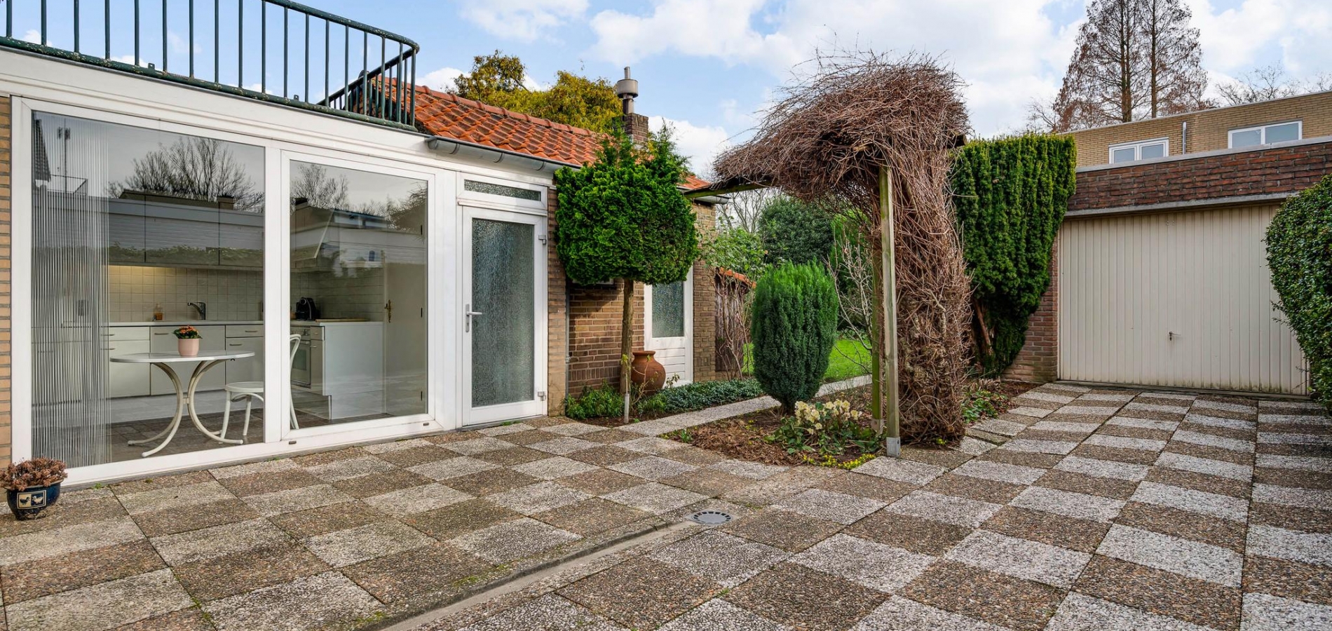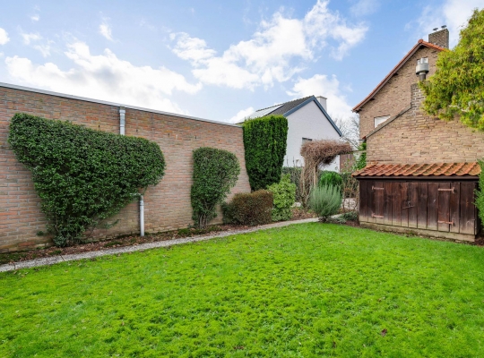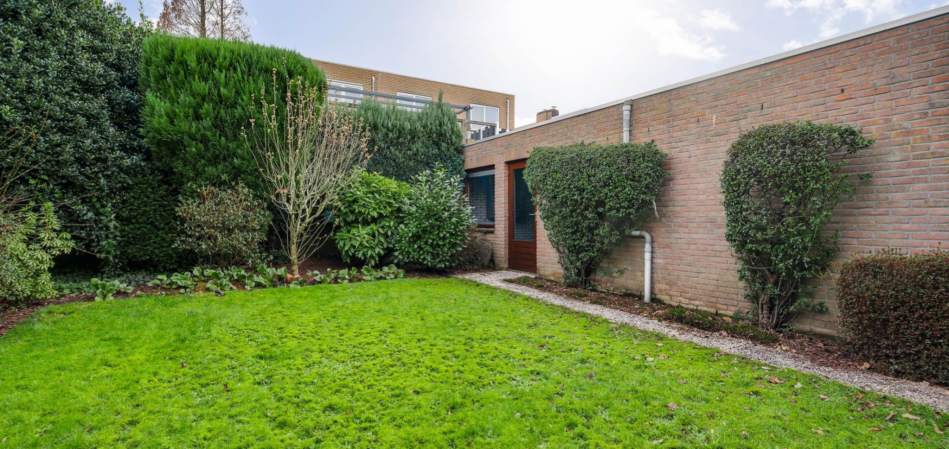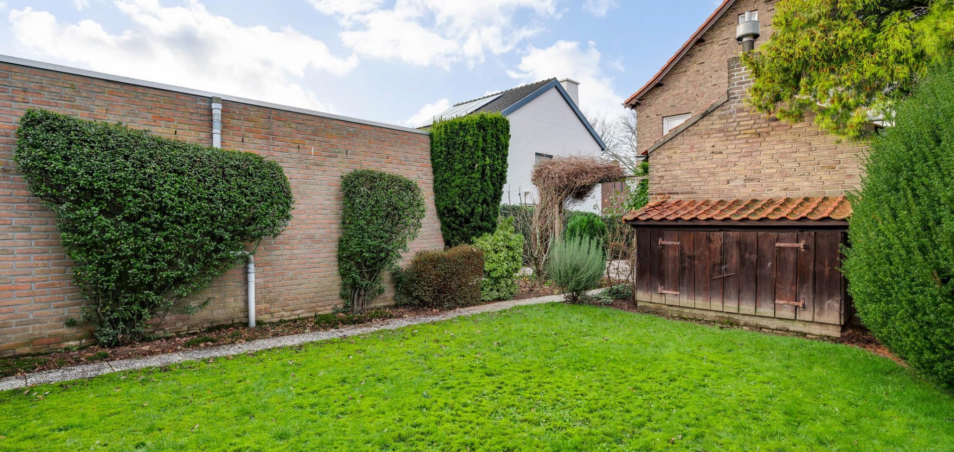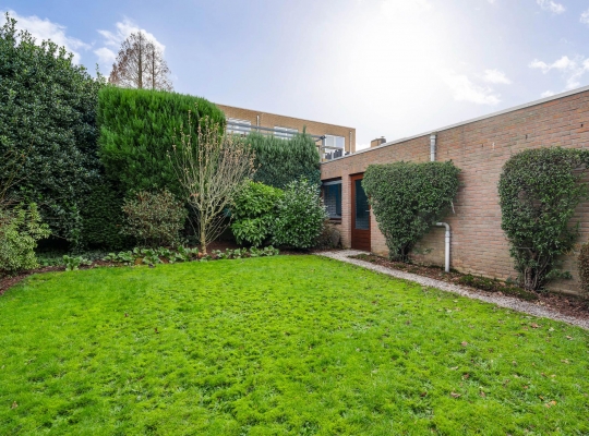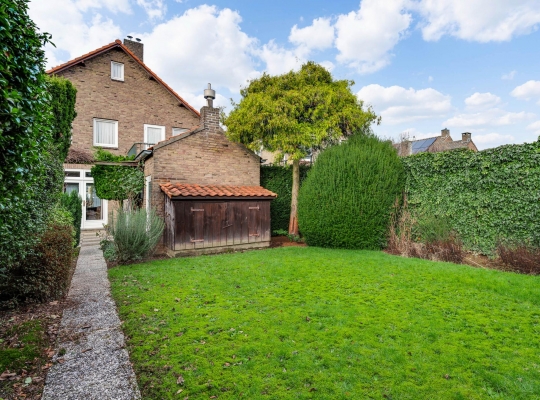 Deze karakteristieke woning wordt aan drie zijden omringd door een goed onderhouden siertuin met gras en gevarieerde beplanting. Aan de rechterzijde is een diepe oprit voor meerdere auto’s, die leidt naar de achtertuin en de garage. Dankzij de diepte van de achtertuin, gesitueerd op het zuidoosten, heeft de hele dag de mogelijkheid om in de zon te zitten.