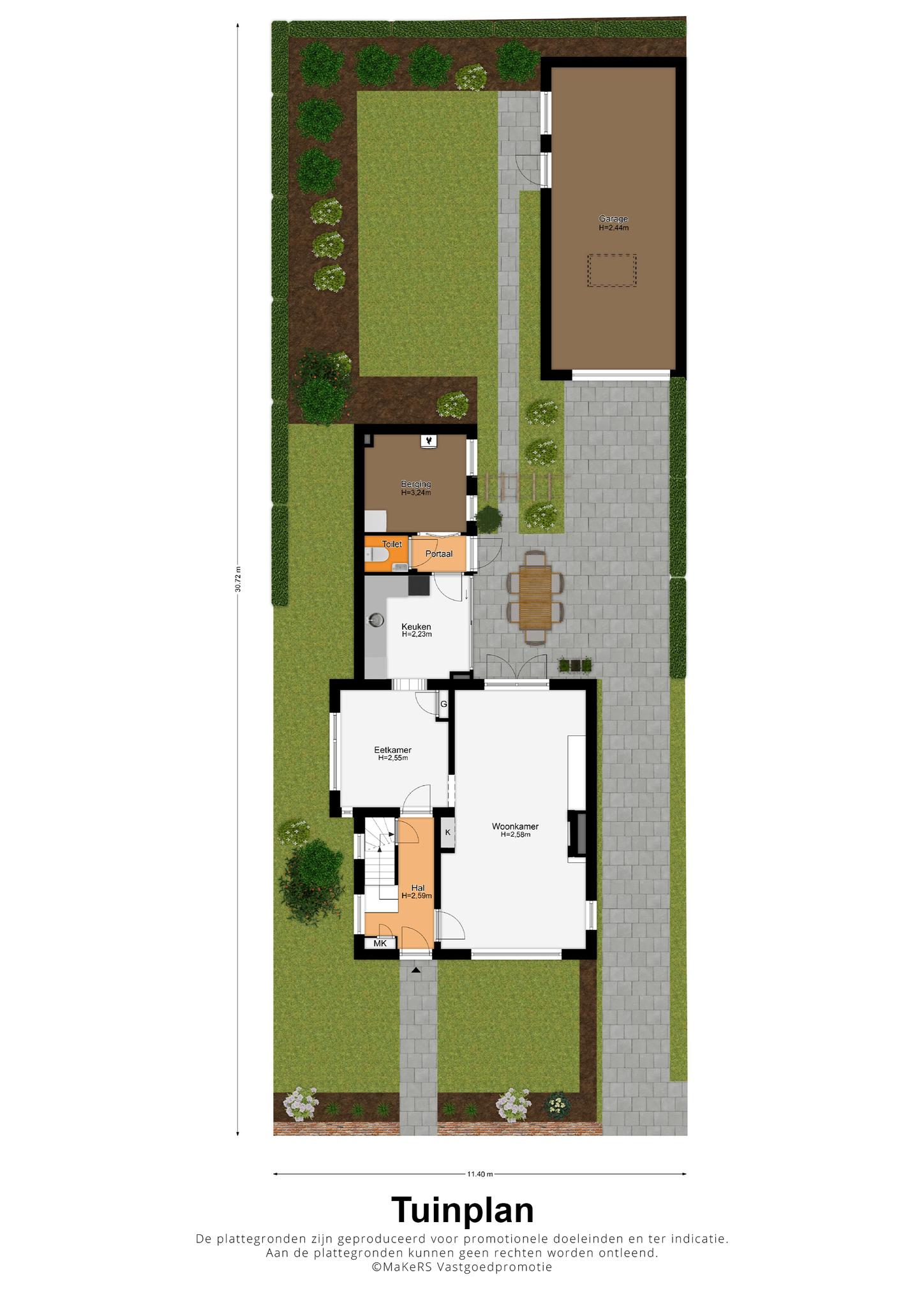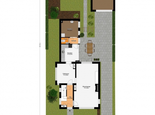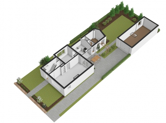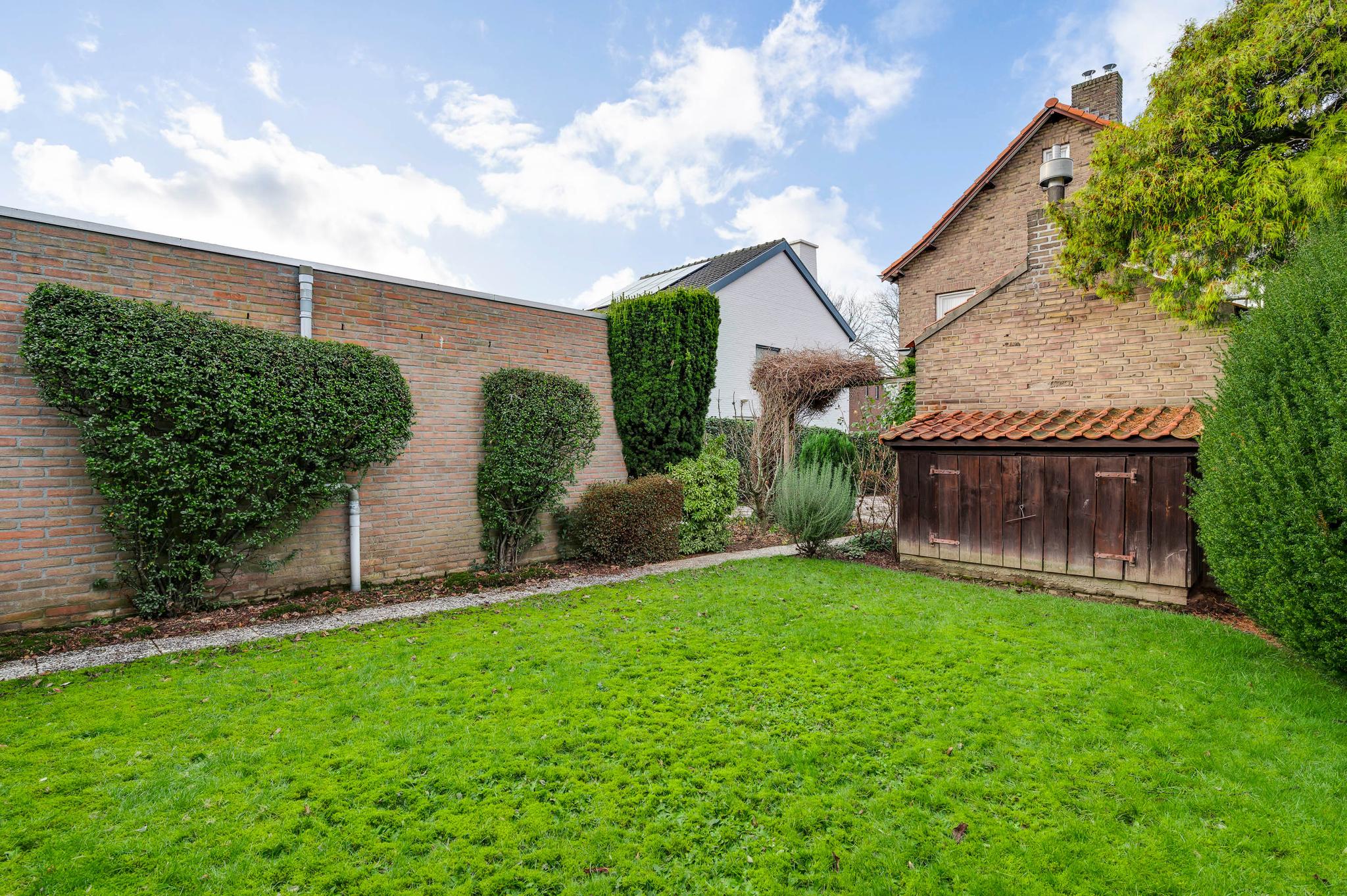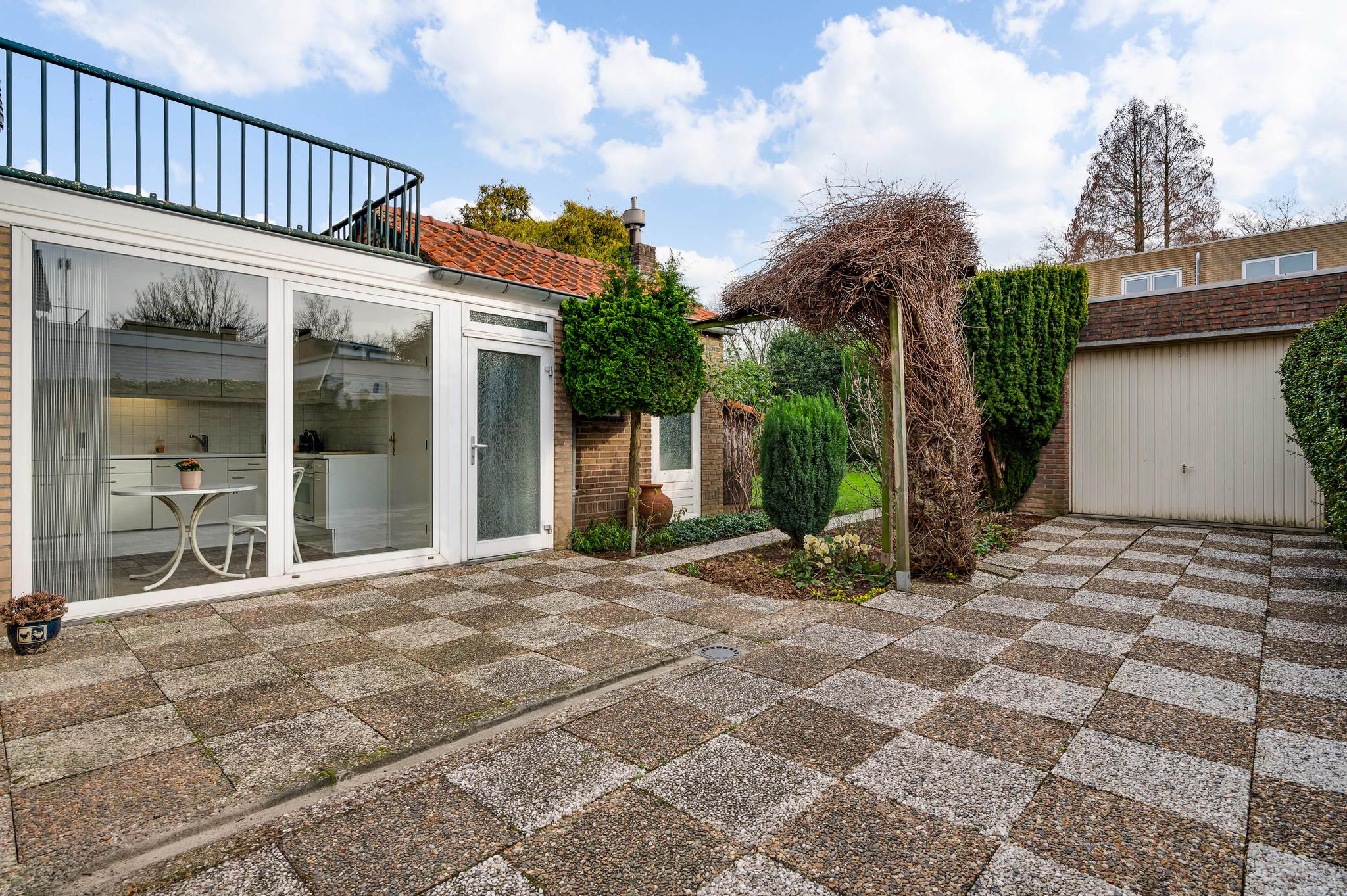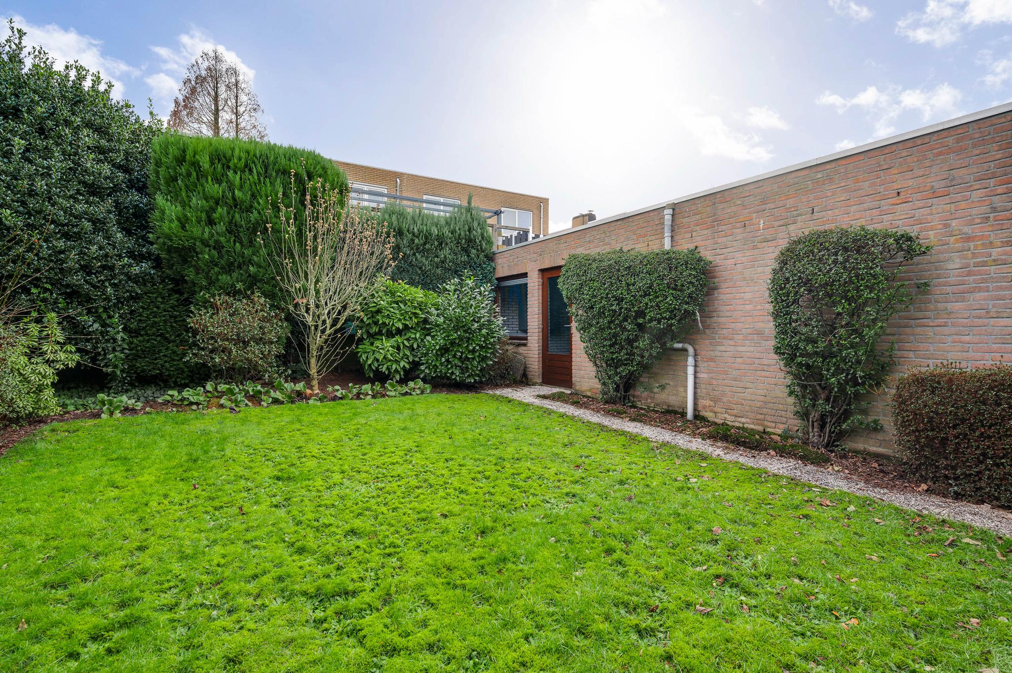 Deze karakteristieke woning wordt aan drie zijden omringd door een goed onderhouden siertuin met gras en gevarieerde beplanting. Aan de rechterzijde is een diepe oprit voor meerdere auto’s, die leidt naar de achtertuin en de garage. Dankzij de diepte van de achtertuin, gesitueerd op het zuidoosten, heeft de hele dag de mogelijkheid om in de zon te zitten.