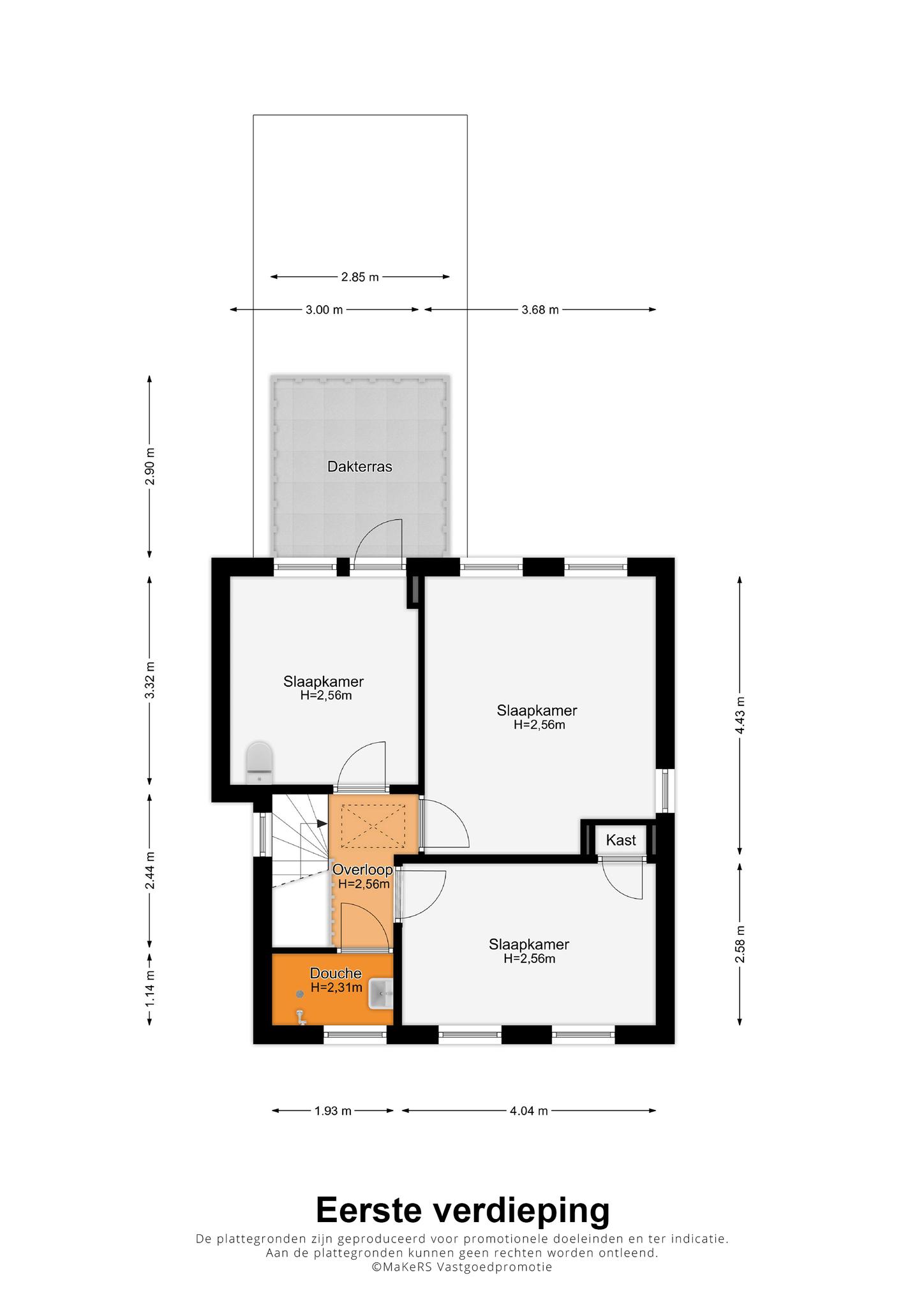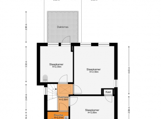 Het zijraam zorgt voor veel lichtinval op de overloop en bij de trapopgang. Aan de overloop grenzen drie slaapkamers en de doucheruimte. Slaapkamer I (4,04 x 2,58) met inbouwkast bevindt zich aan de voorzijde en slaapkamer II (3,22 x 2,85) met toilet grenst aan het dakterras. Slaapkamer III (4,43 x 3,68) is een ruime hoofdslaapkamer met lichtinval aan twee zijden.