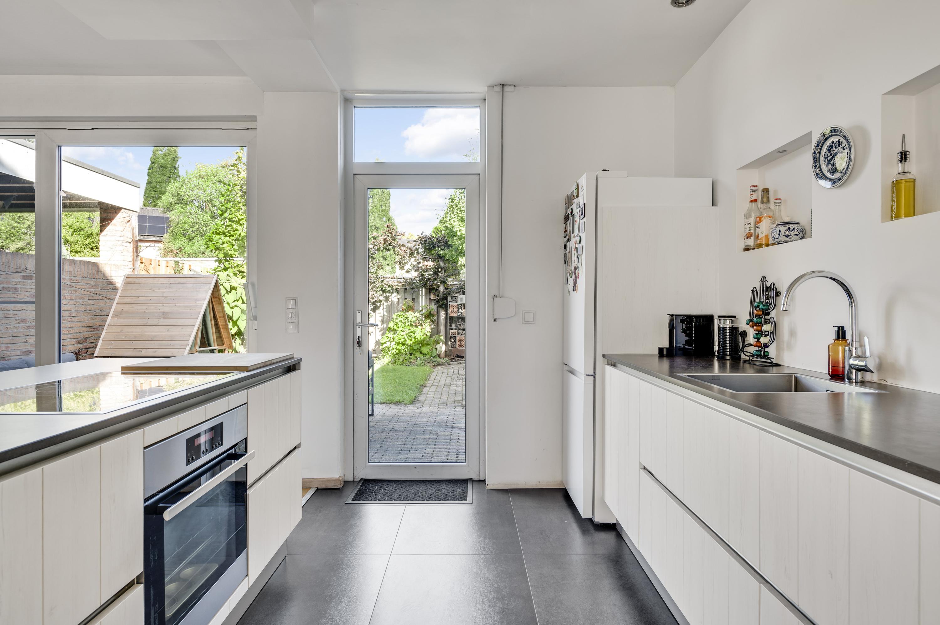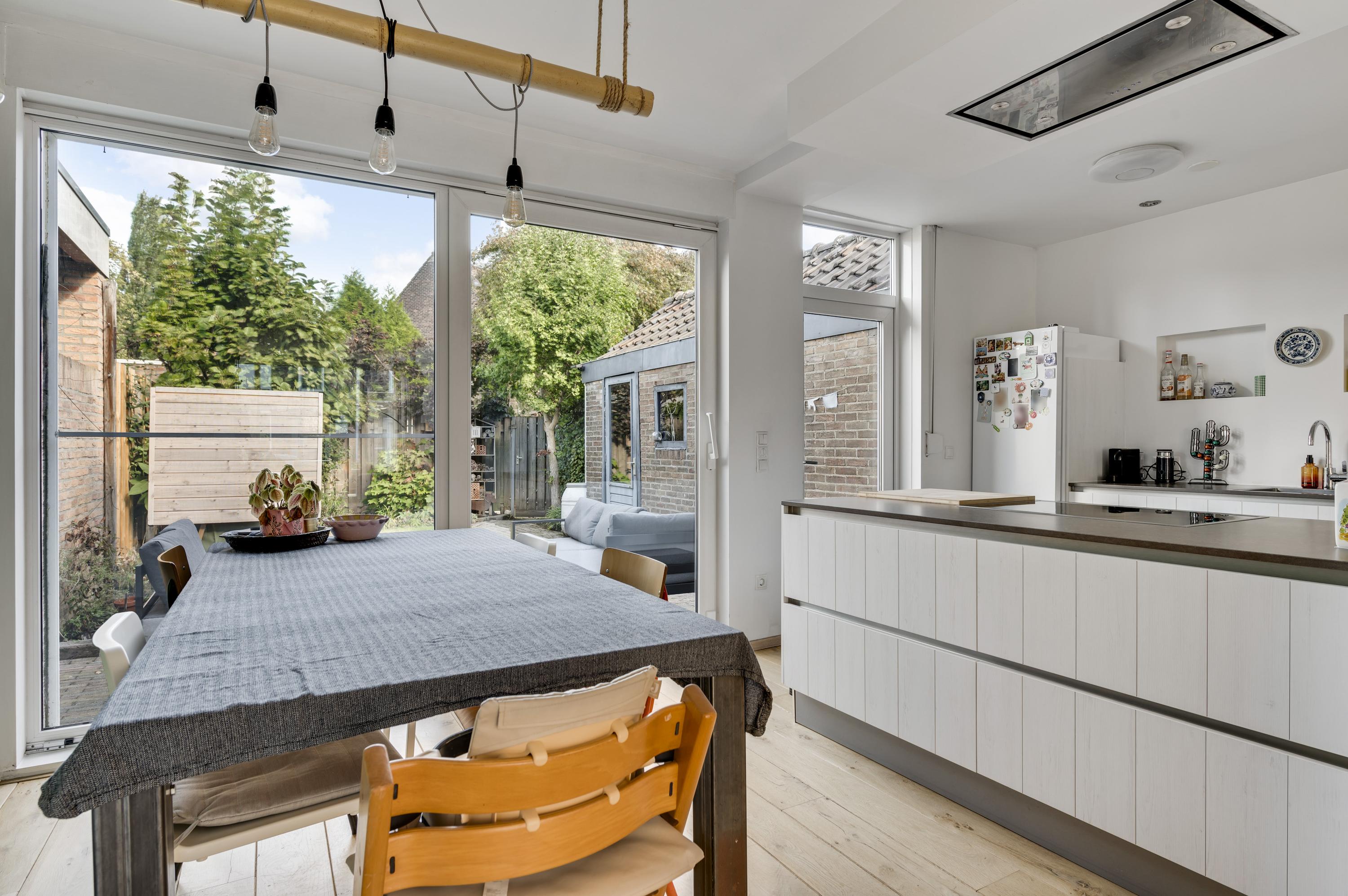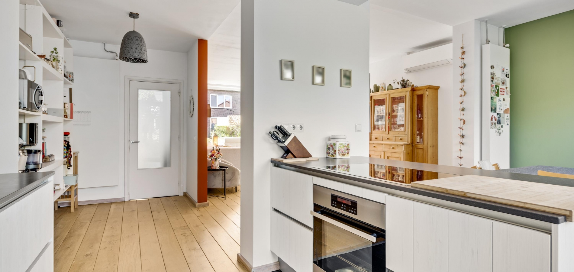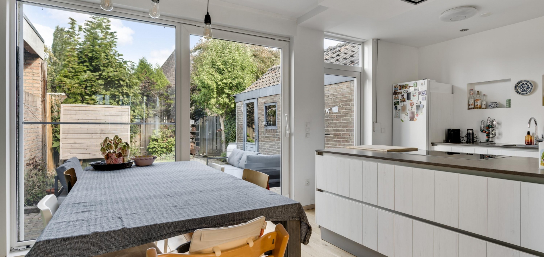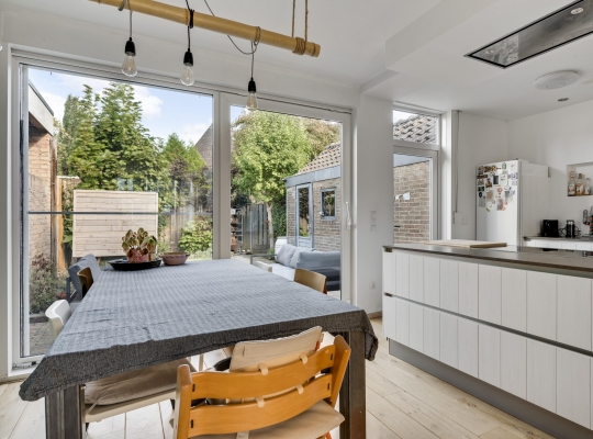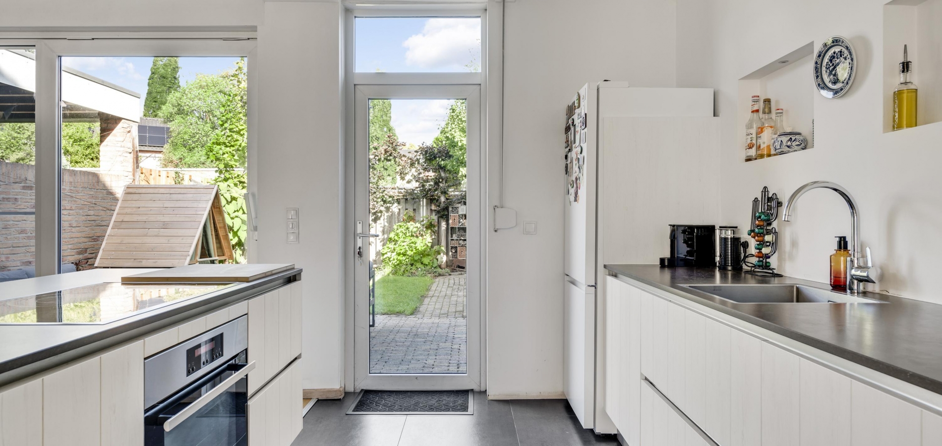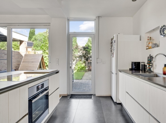 Over de hele breedte is de woning aan de achterzijde uitgebouwd, met een prachtige woonkeuken (circa 5,70 x 2,76) als resultaat. Een grote schuifpui bij het eetgedeelte geeft, net als de deur in de keuken, toegang tot de tuin. De keukenopstelling, met een kookeiland, is voorzien van een keramische kookplaat, afzuiging in het plafond, een oven en een vaatwasser.
