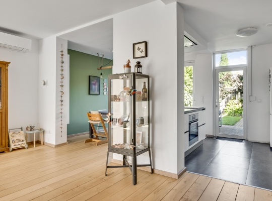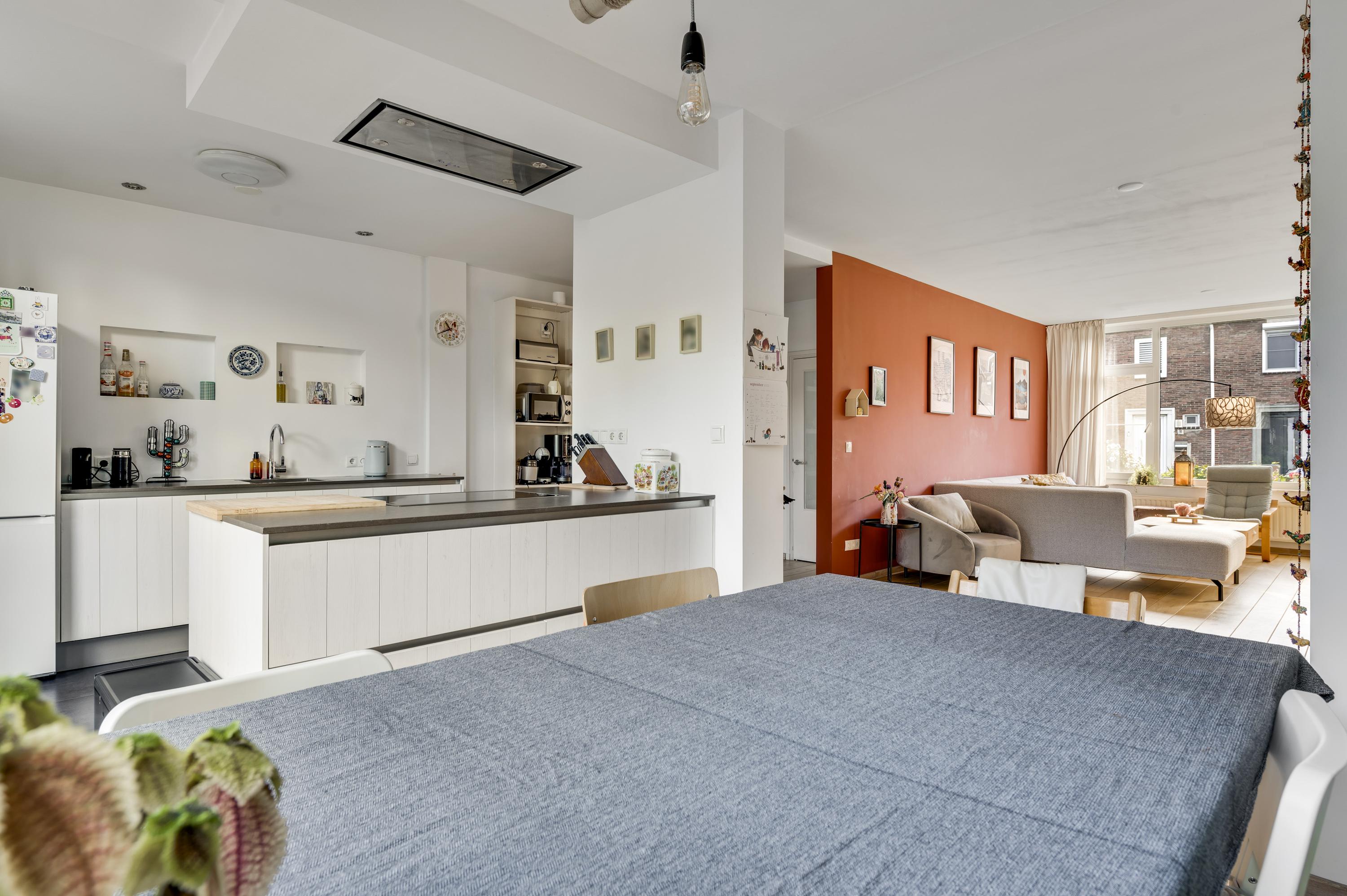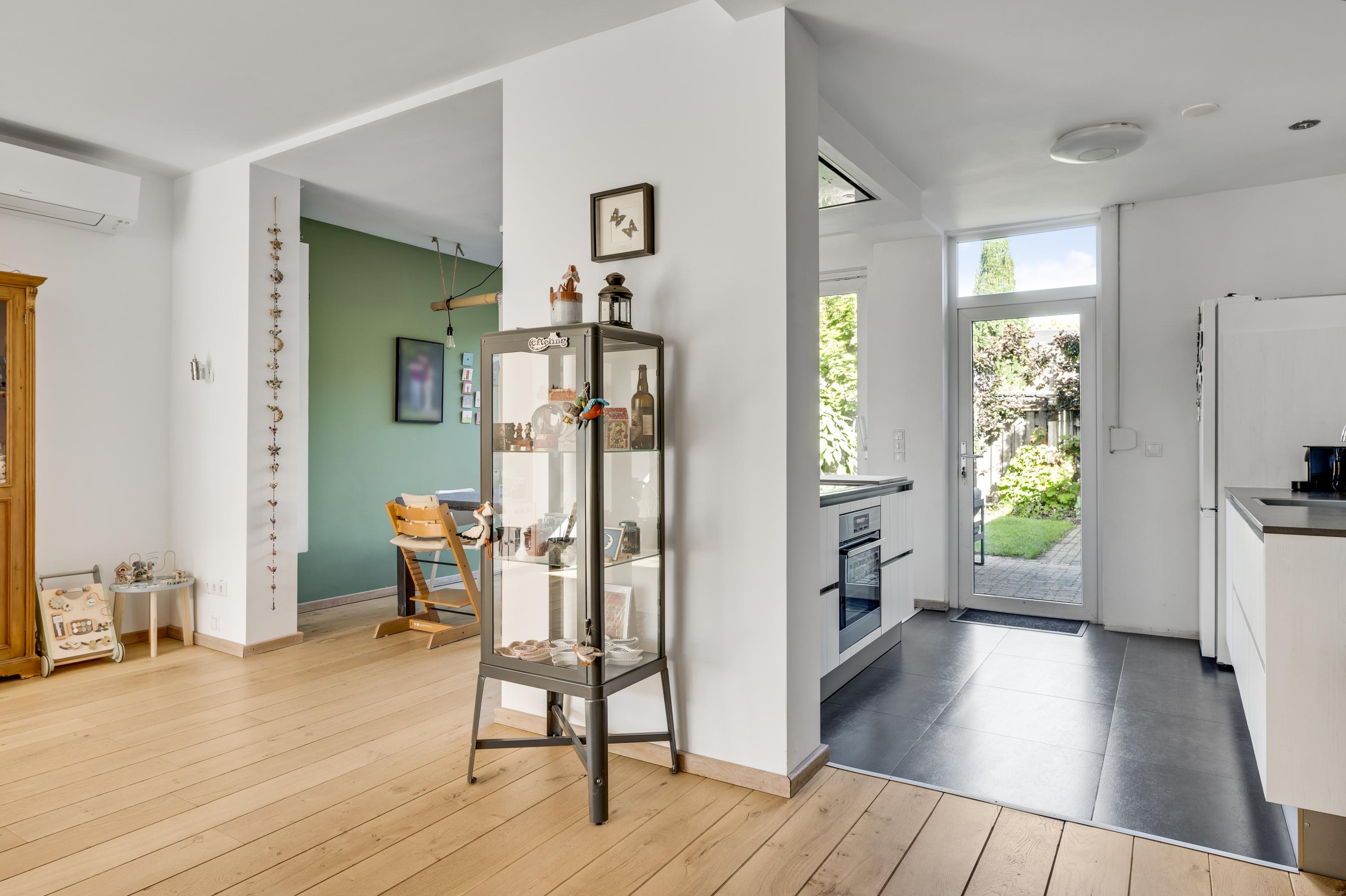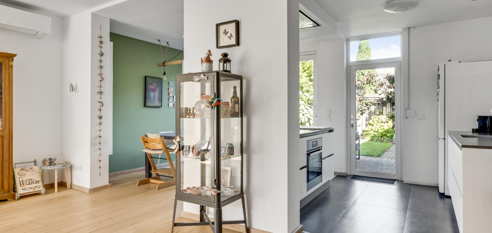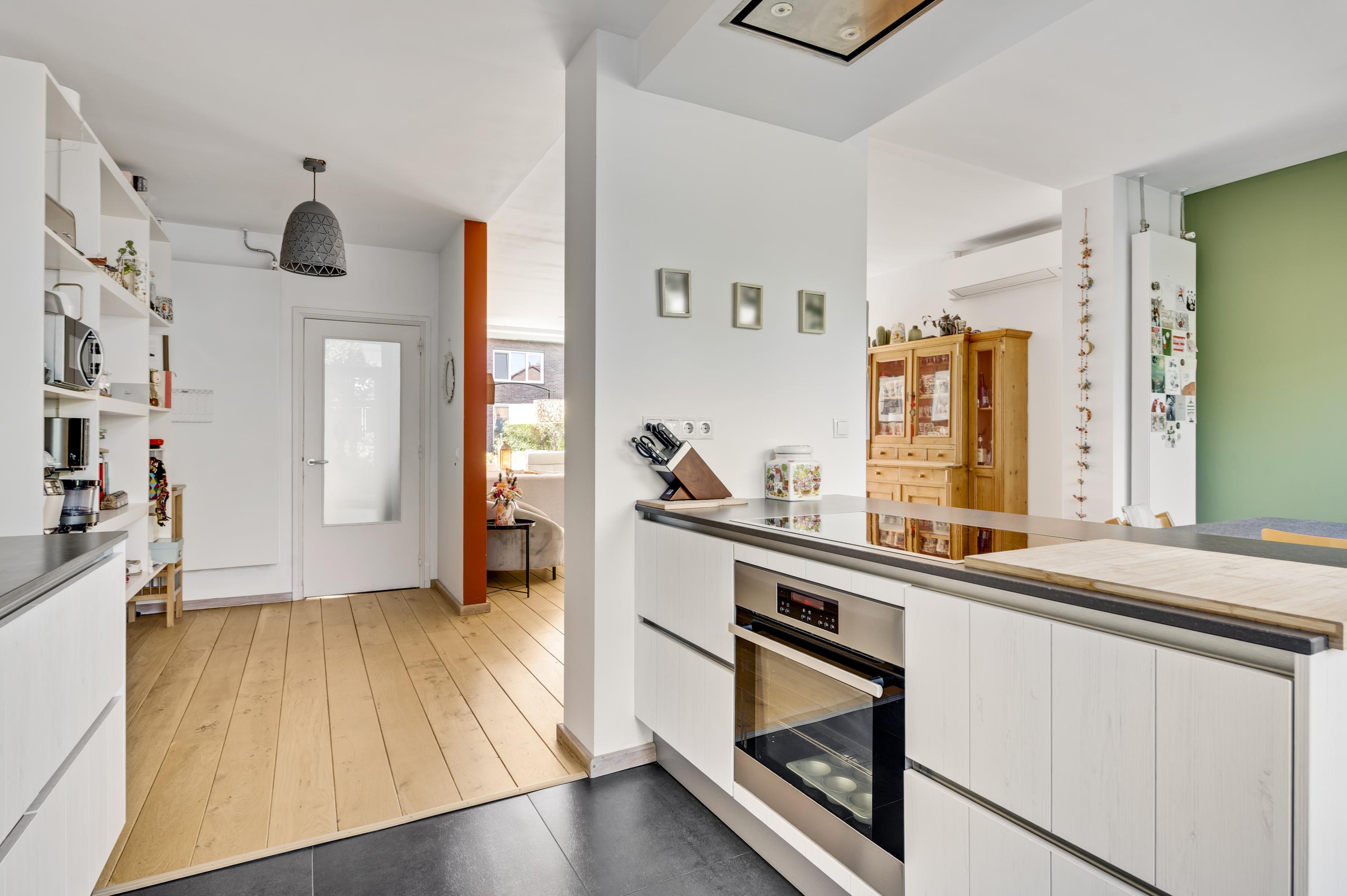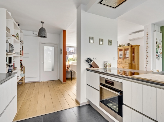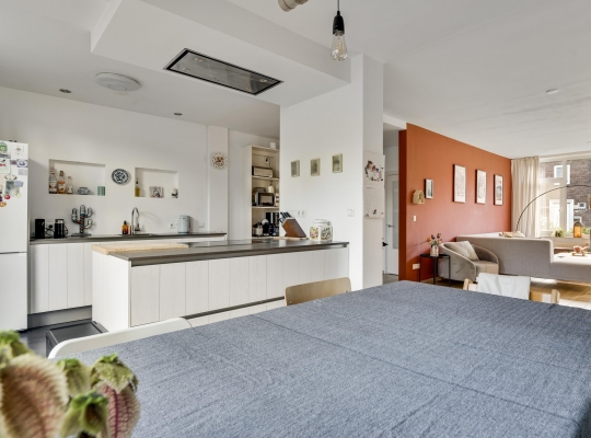 Over de hele breedte is de woning aan de achterzijde uitgebouwd, met een prachtige woonkeuken (circa 5,70 x 2,76) als resultaat. Een grote schuifpui bij het eetgedeelte geeft, net als de deur in de keuken, toegang tot de tuin. De keukenopstelling, met een kookeiland, is voorzien van een keramische kookplaat, afzuiging in het plafond, een oven en een vaatwasser.