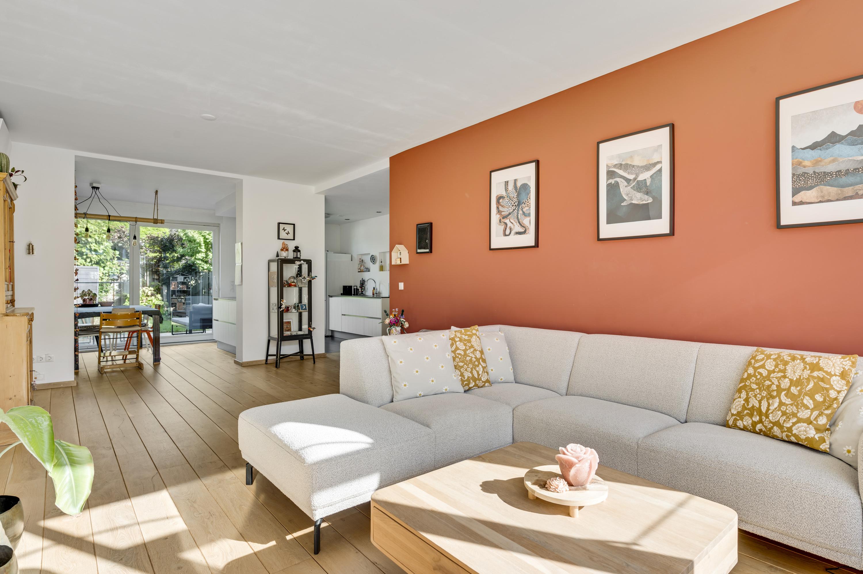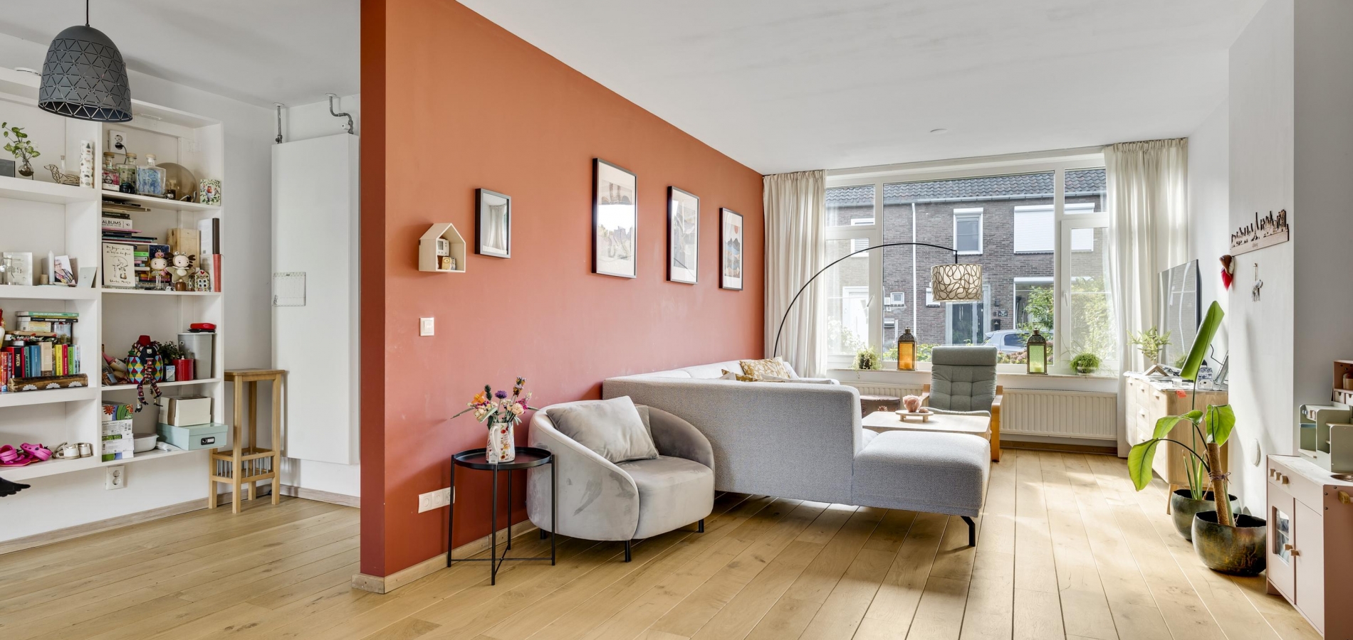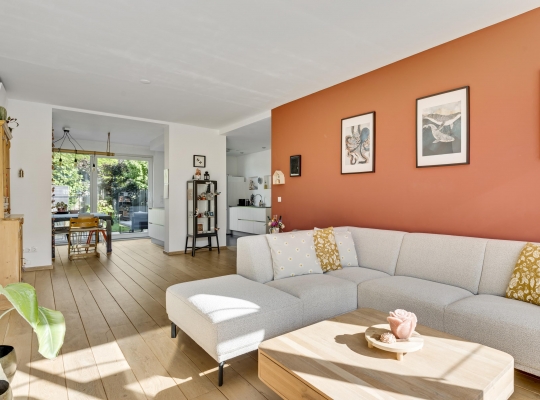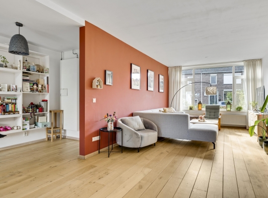 Vanuit de hal heeft u toegang tot de L-vormige woonkamer van circa 33 m2, met een ruim zitgedeelte aan de voorzijde en een fijne speelhoek op de plek waar vroeger de keuken was. Het plafond en de muren zijn gestuct, er ligt een houten vloer en door het grote raam aan de zuidkant valt veel licht naar binnen.