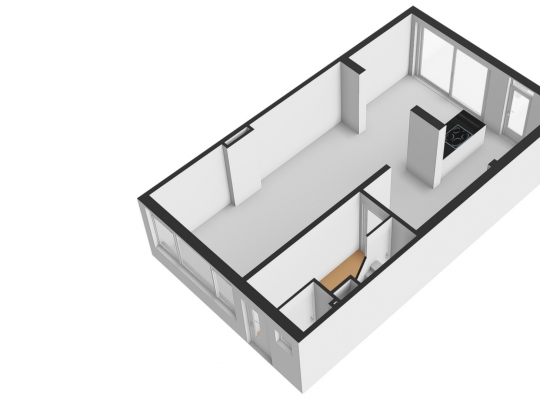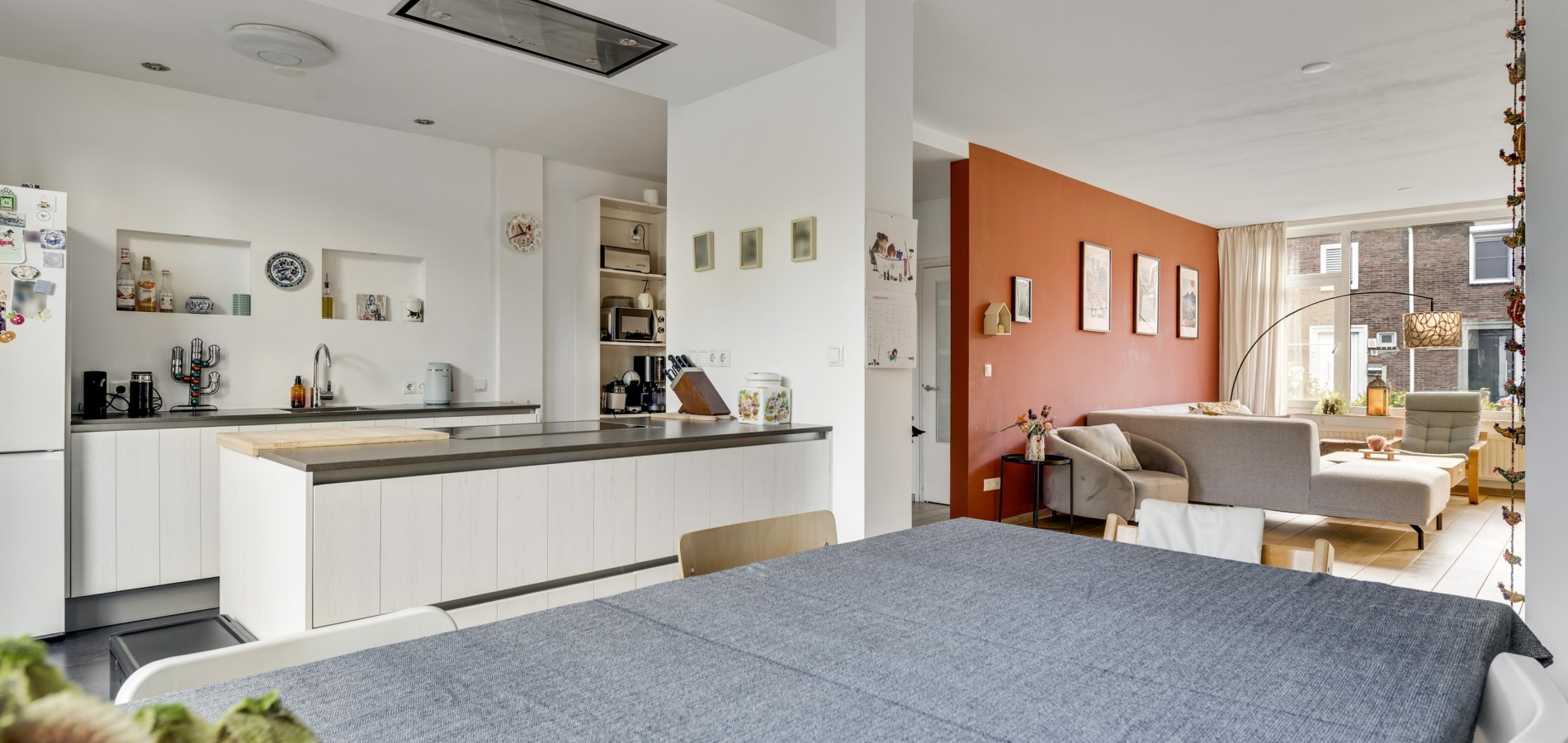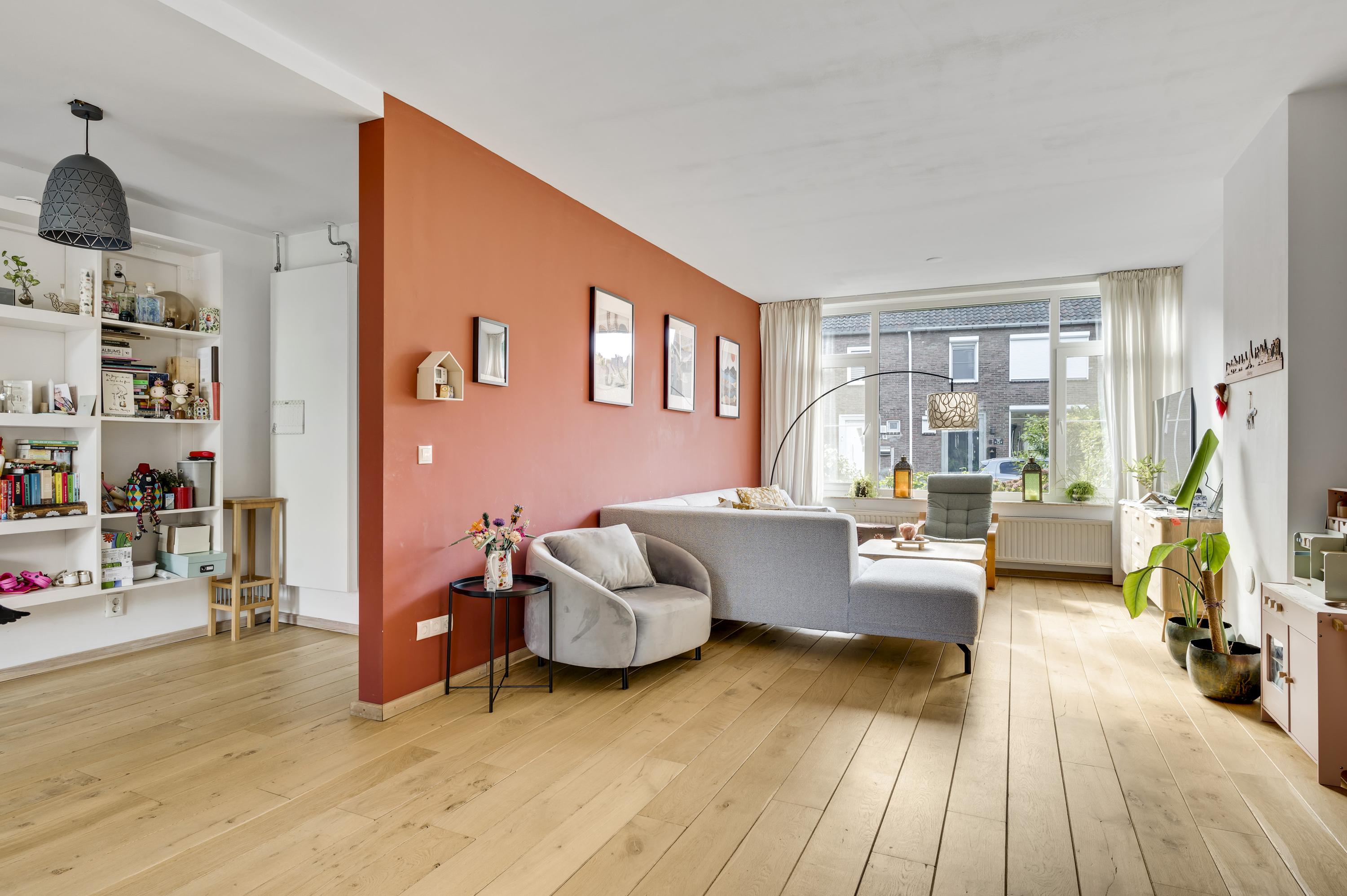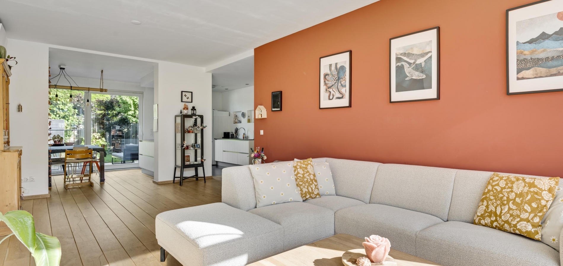 Vanuit de hal heeft u toegang tot de L-vormige woonkamer van circa 33 m2, met een ruim zitgedeelte aan de voorzijde en een fijne speelhoek op de plek waar vroeger de keuken was. Het plafond en de muren zijn gestuct, er ligt een houten vloer en door het grote raam aan de zuidkant valt veel licht naar binnen.