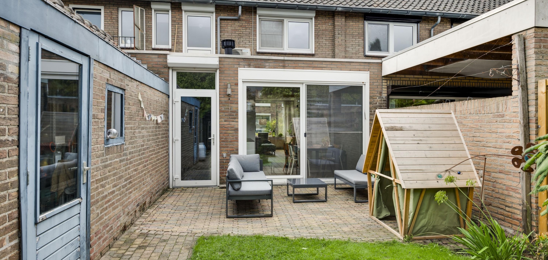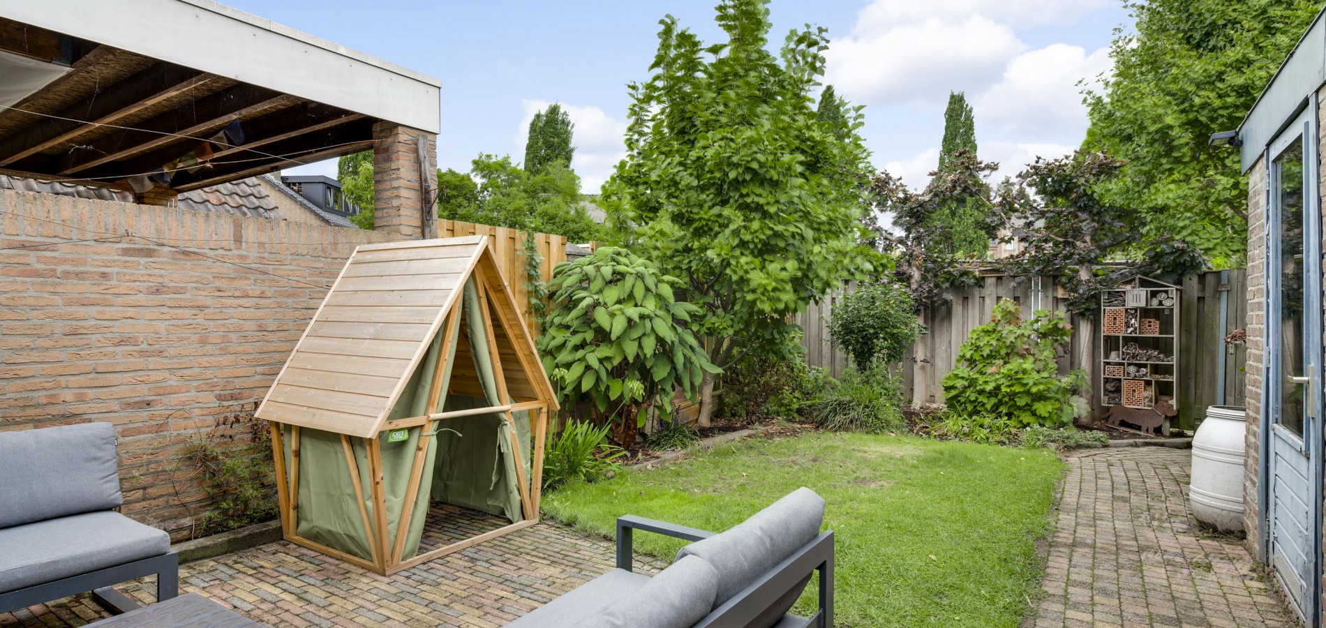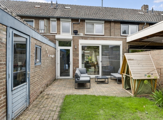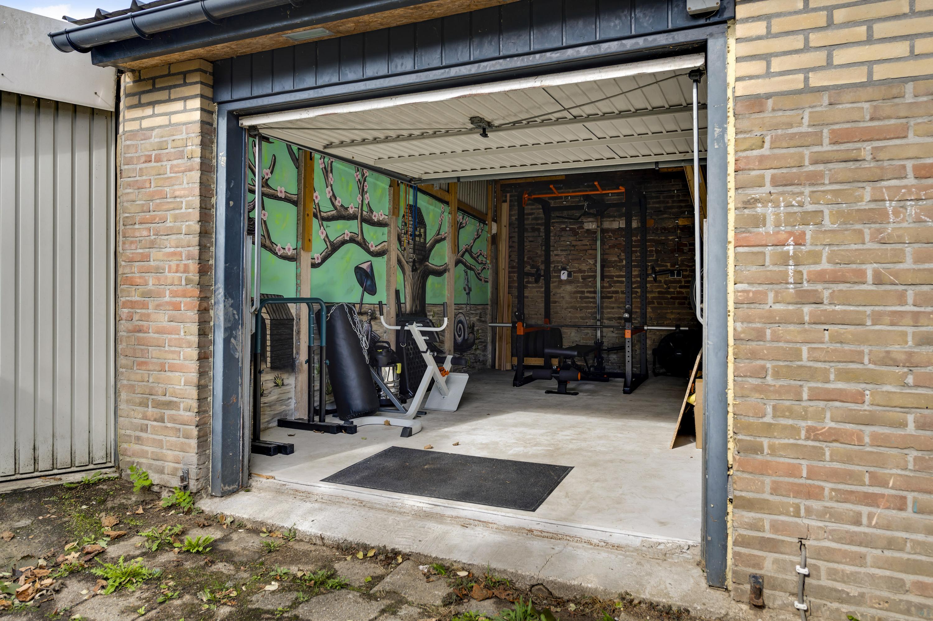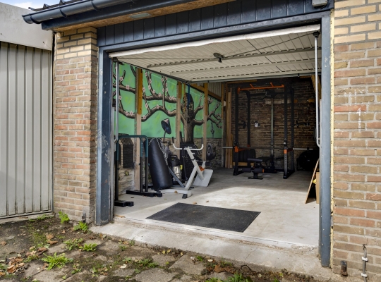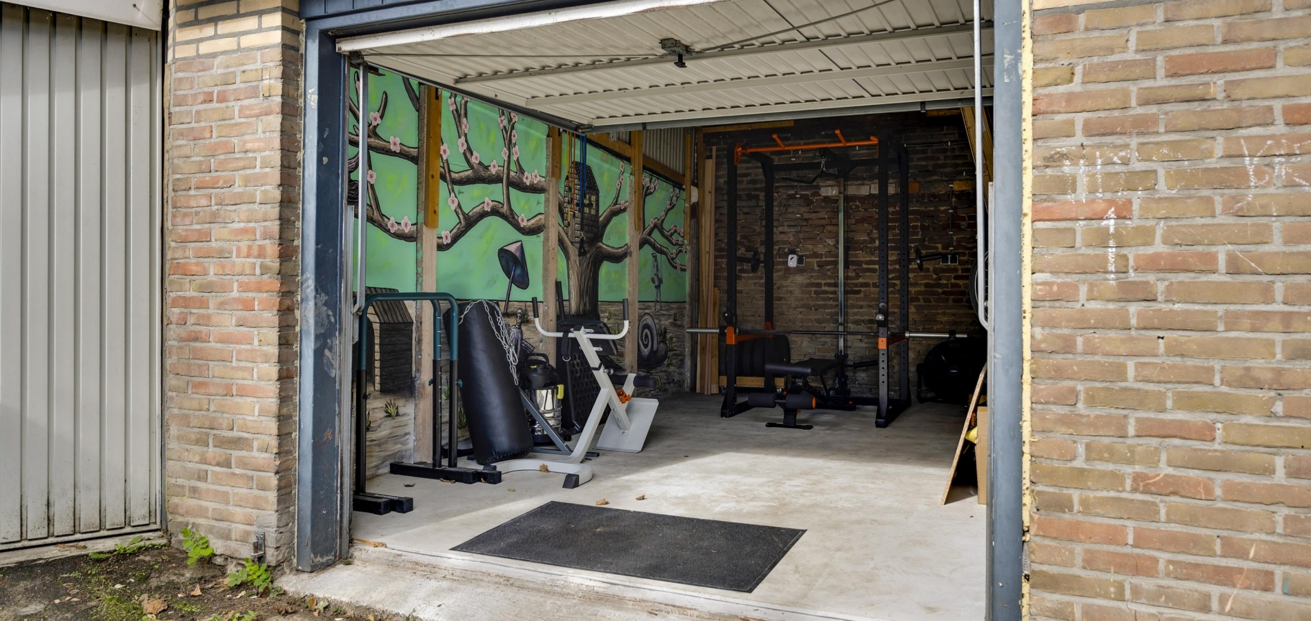 Deze instapklare woning heeft niet alleen een mooi aangelegde voortuin, maar ook een leuke achtertuin met een groot terras en een gazon. Rechts in de tuin staat een stenen berging (circa 2,65 x 2,42) en achter de poort is de garage (circa 5,50 x 3,34). Deze wordt nu als sportruimte gebruikt, maar is ook geschikt om de auto, motor en/of fietsen binnen te zetten.