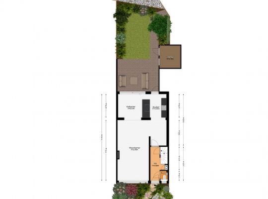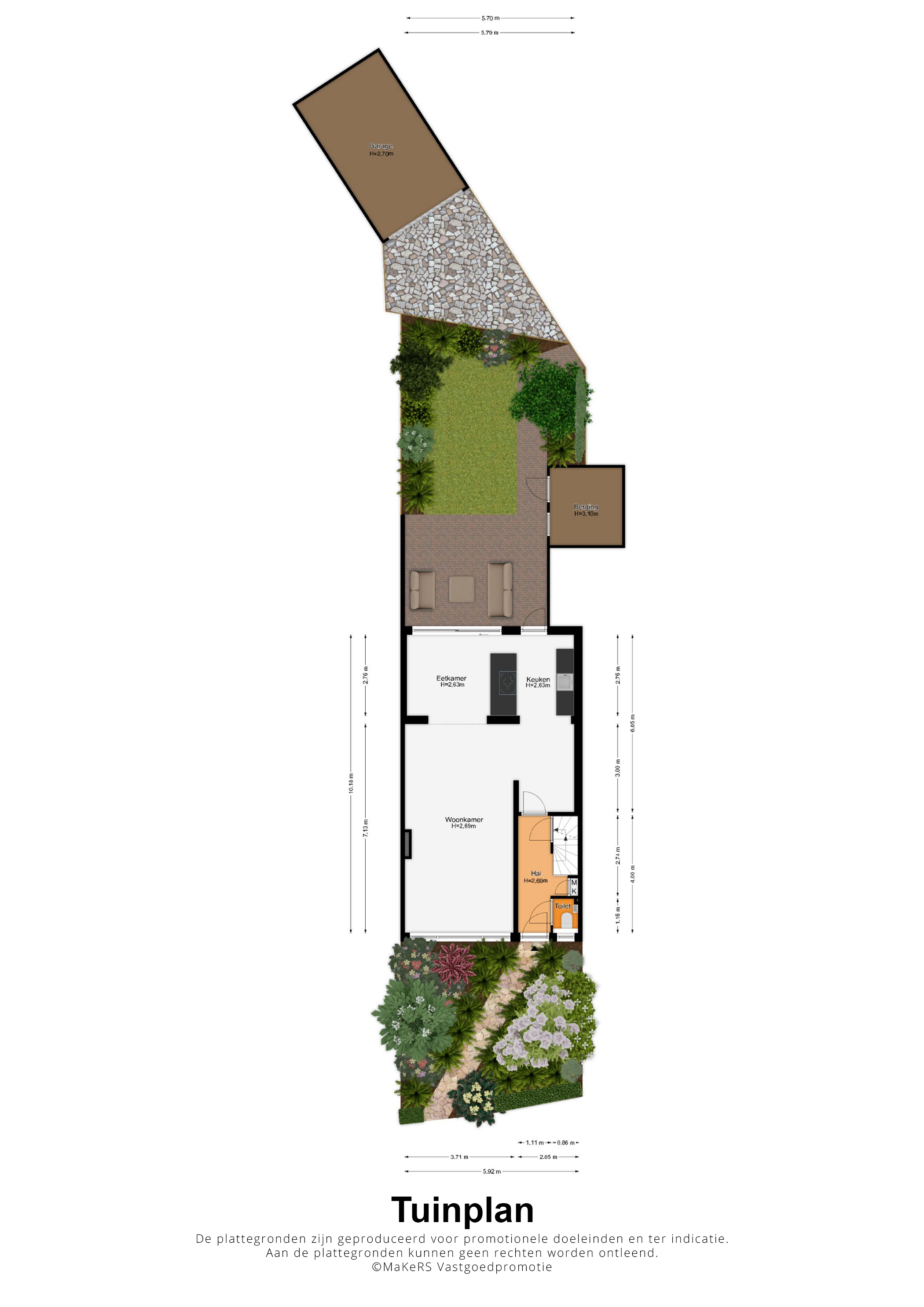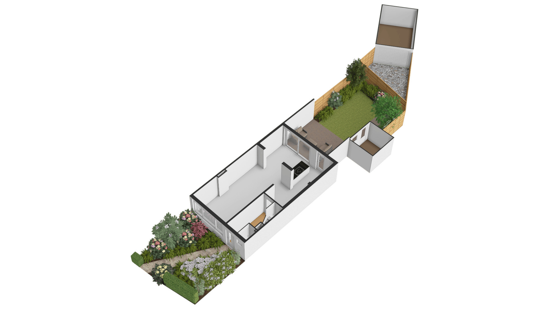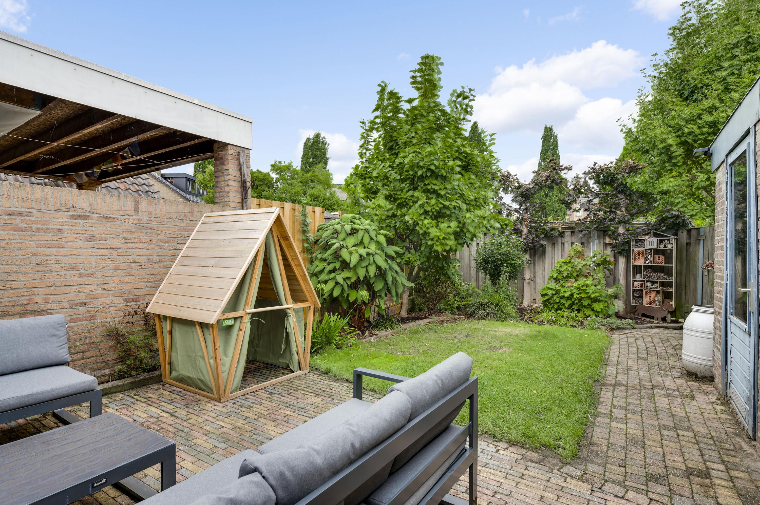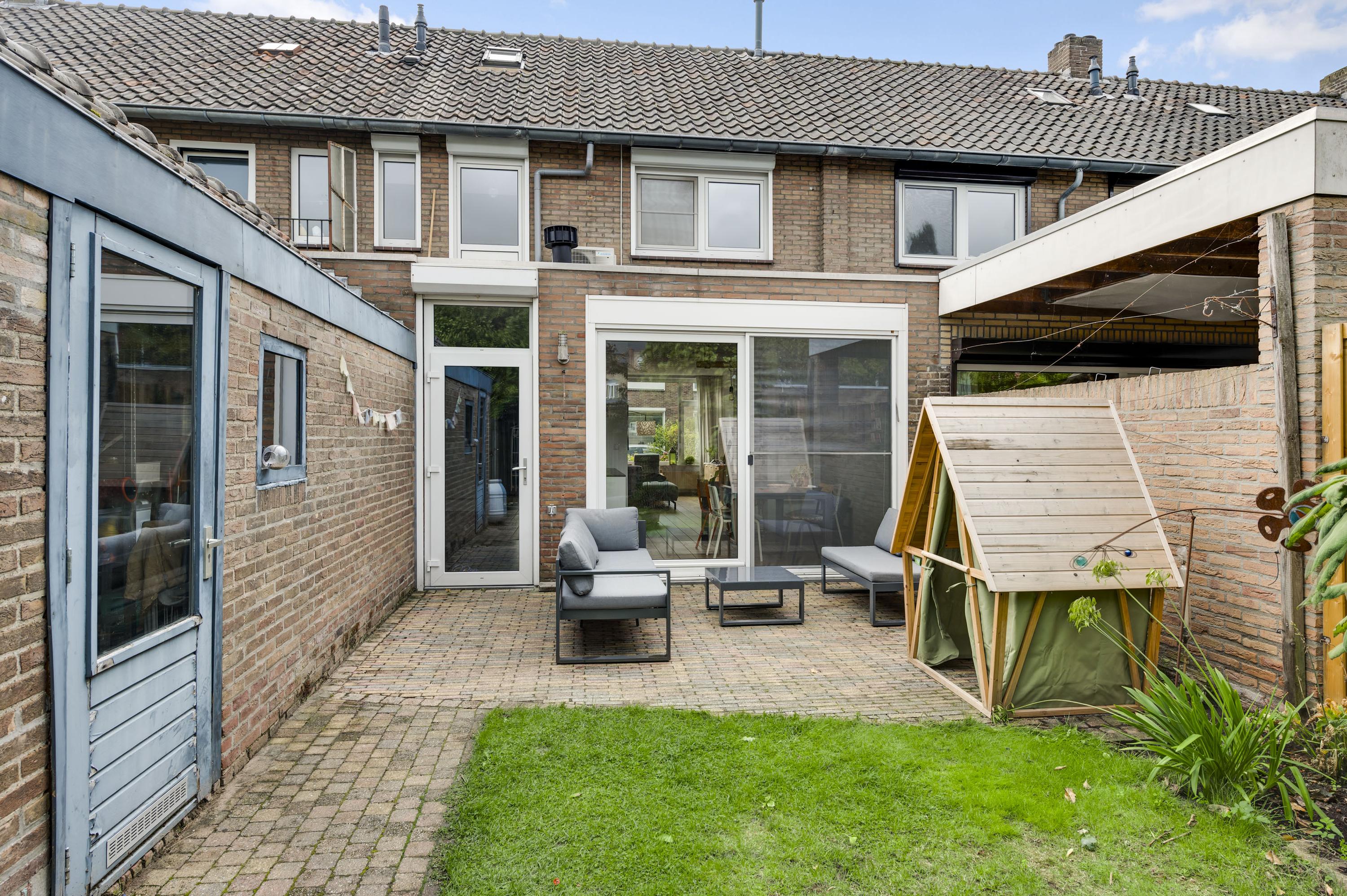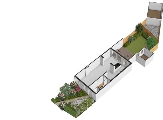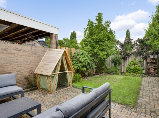 Deze instapklare woning heeft niet alleen een mooi aangelegde voortuin, maar ook een leuke achtertuin met een groot terras en een gazon. Rechts in de tuin staat een stenen berging (circa 2,65 x 2,42) en achter de poort is de garage (circa 5,50 x 3,34). Deze wordt nu als sportruimte gebruikt, maar is ook geschikt om de auto, motor en/of fietsen binnen te zetten.