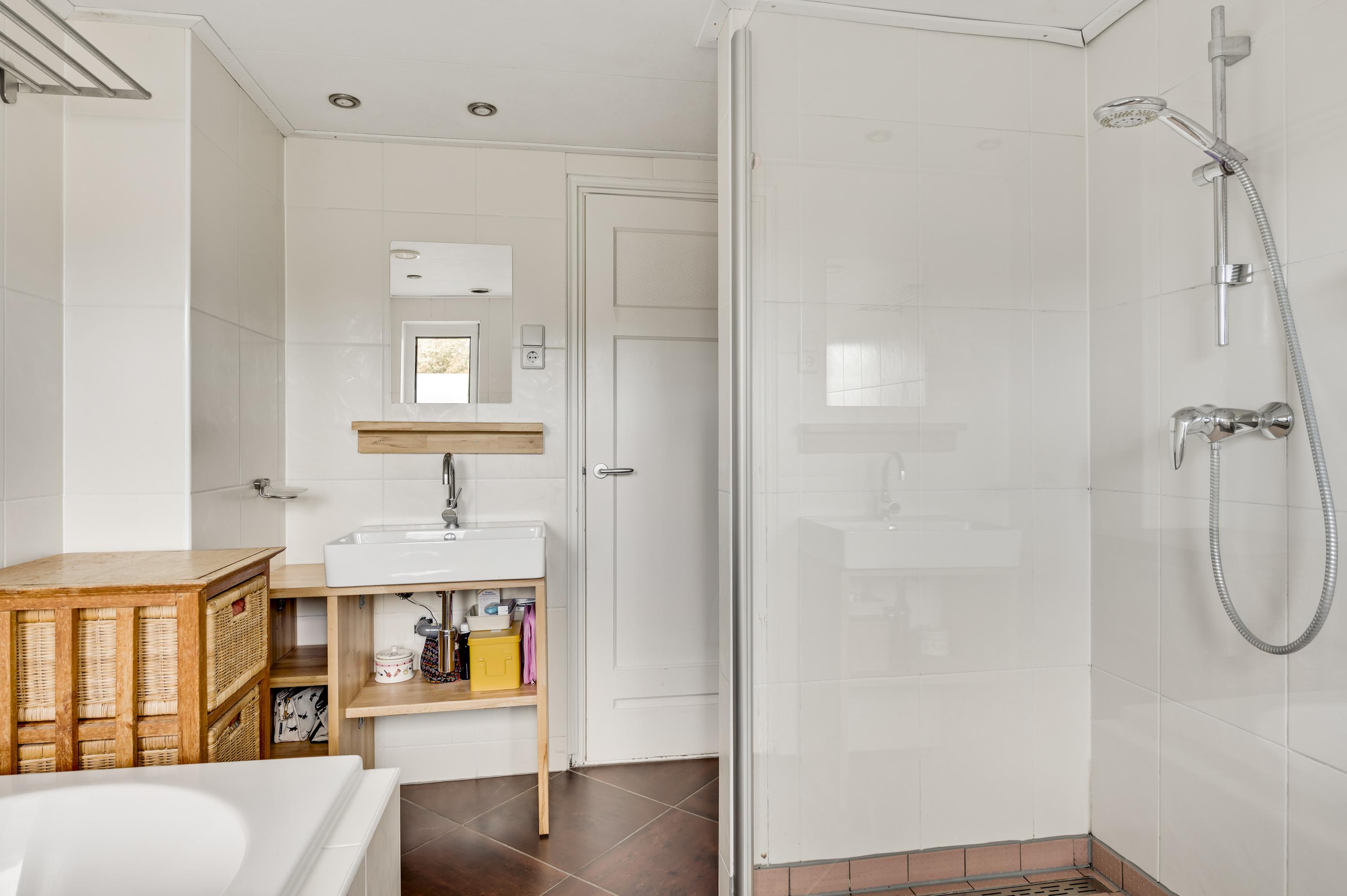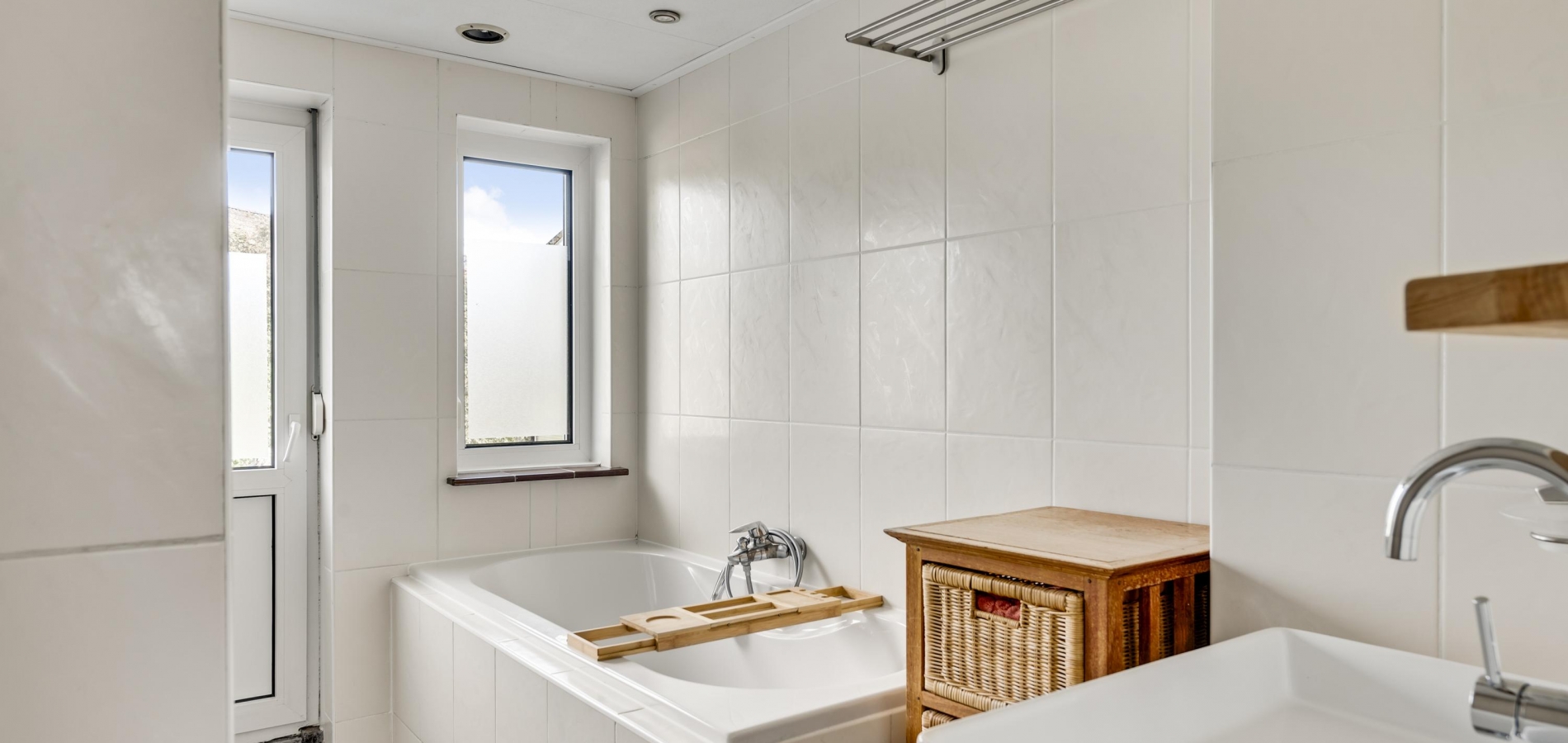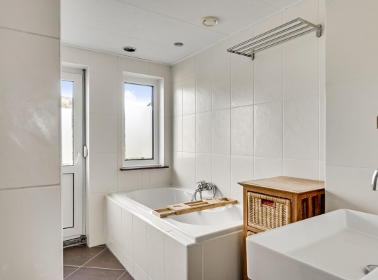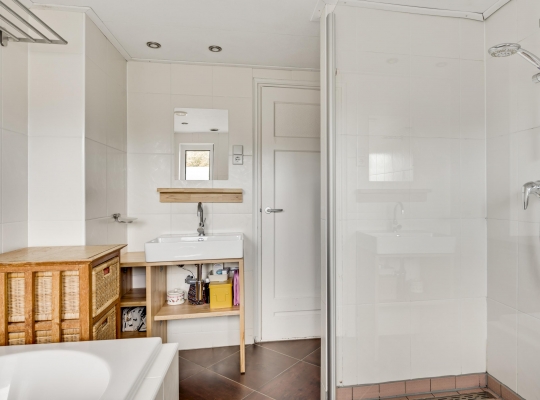 De ruime badkamer (circa 2,98 x 2,48) is ingedeeld met een ligbad, een ruime douche, vaste kast en een wastafel met meubel. Aan de andere kant van de overloop is de toilet-/wasruimte (circa 1,99 x 1,58 meter) met een spoelbak en een blad om de was op te vouwen.