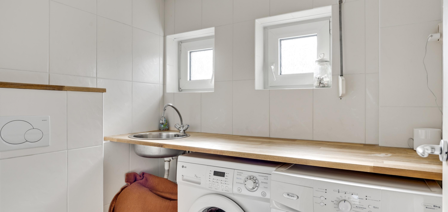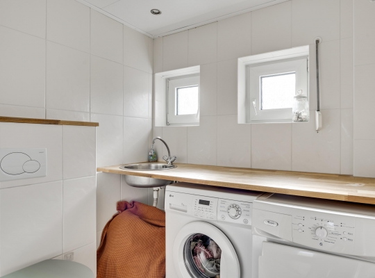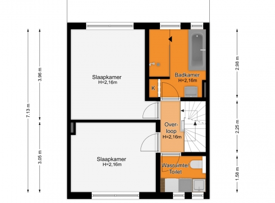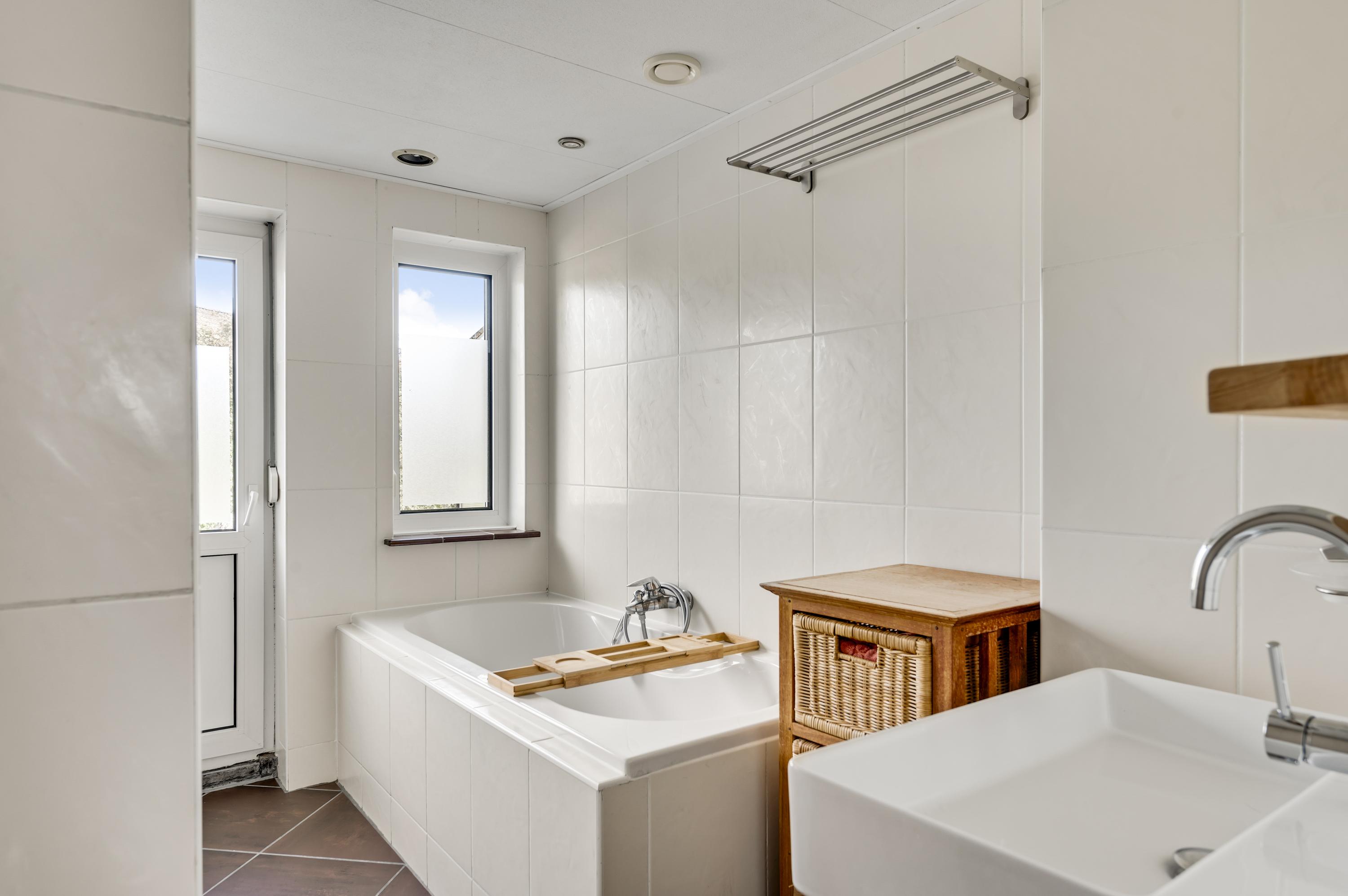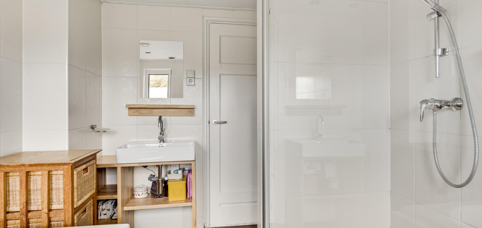 De ruime badkamer (circa 2,98 x 2,48) is ingedeeld met een ligbad, een ruime douche, vaste kast en een wastafel met meubel. Aan de andere kant van de overloop is de toilet-/wasruimte (circa 1,99 x 1,58 meter) met een spoelbak en een blad om de was op te vouwen.