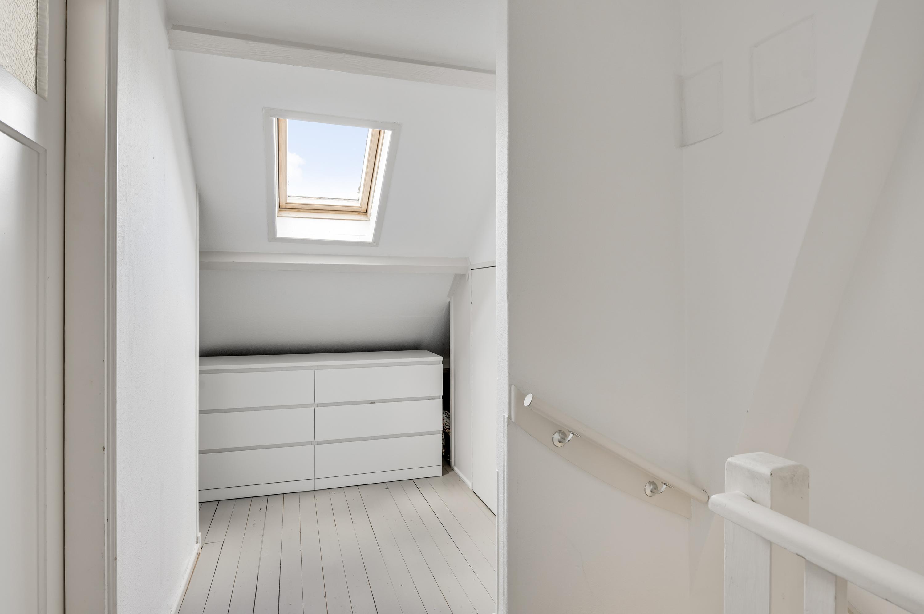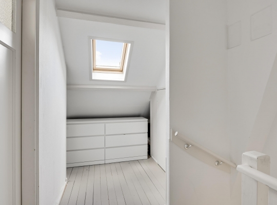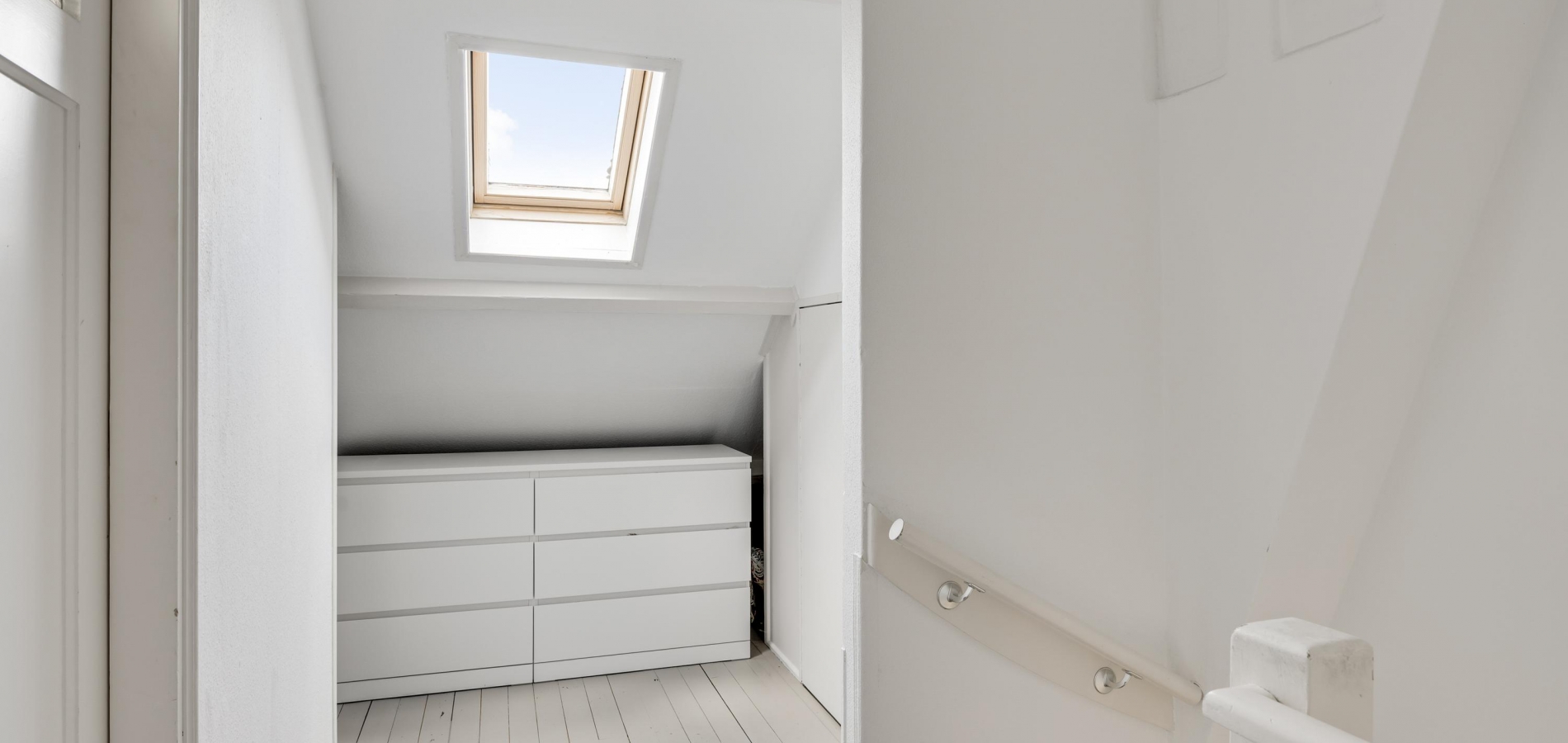 Een vaste trap geeft toegang tot een ruime overloop, met een dakraam en een berging in de schuinte van het dak. Ook hangt hier, uit het zicht, de HR-ketel (Atag, 2012, eigendom).
