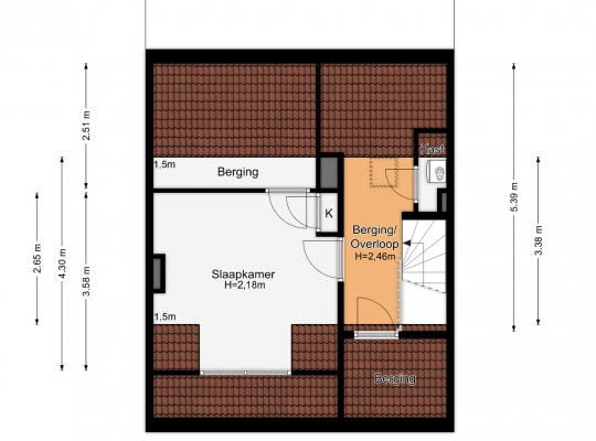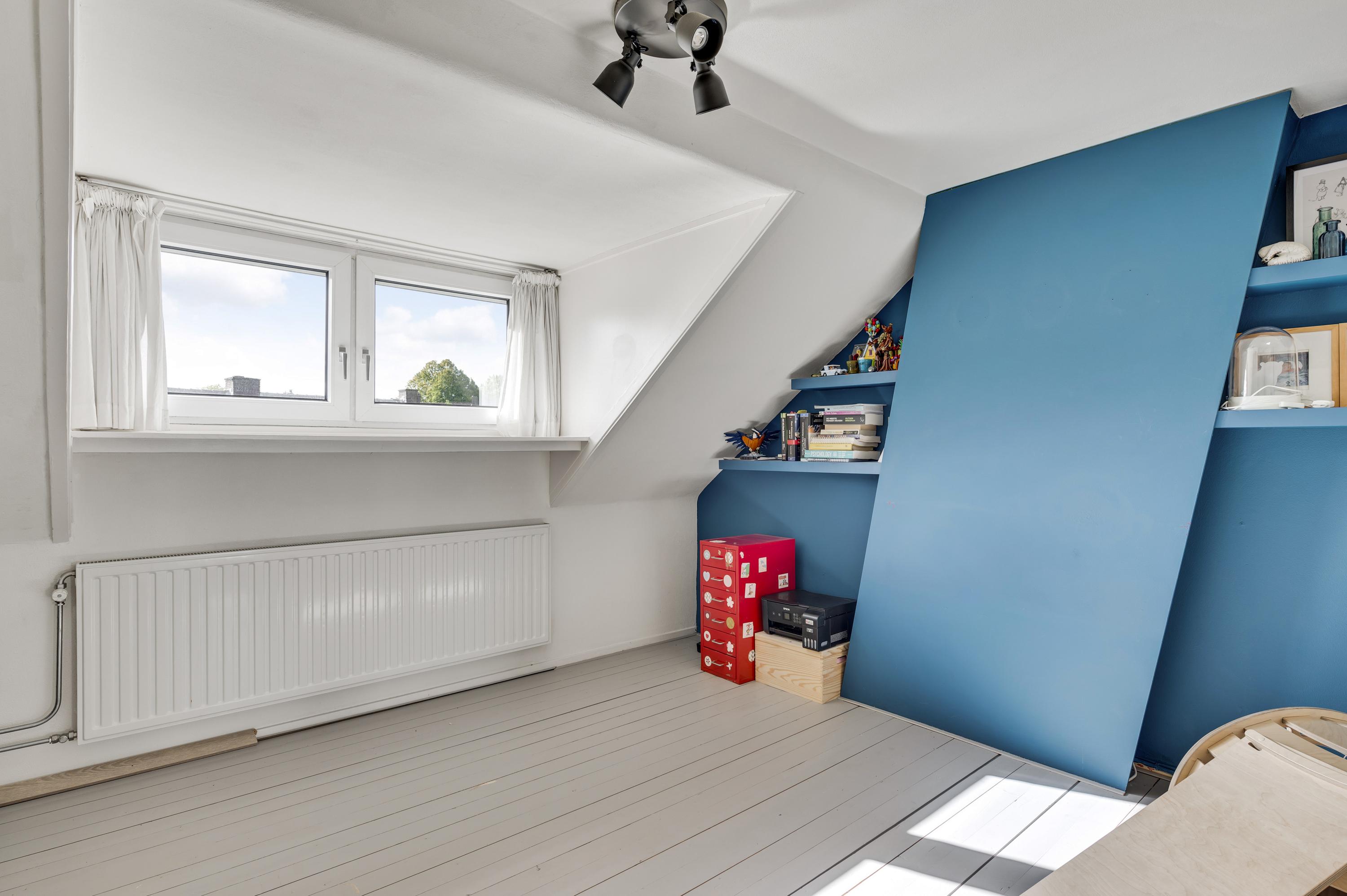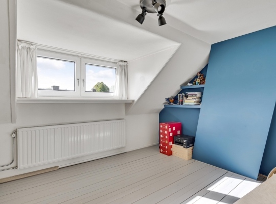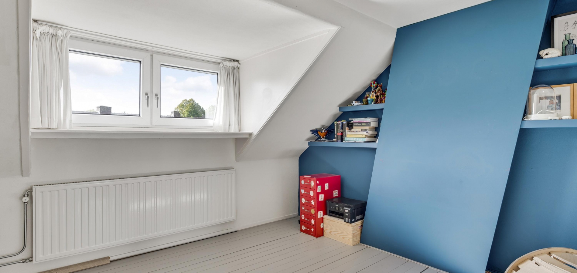 Slaapkamer III (circa 3,58 x 3,71) heeft een inbouwkast, vier blauw wandplanken en een diepe berging in het schuine dakvlak aan de achterzijde. Dankzij de dakkapel aan de voorzijde, met een kunststof kozijn en twee ramen, is deze kamer heel licht.