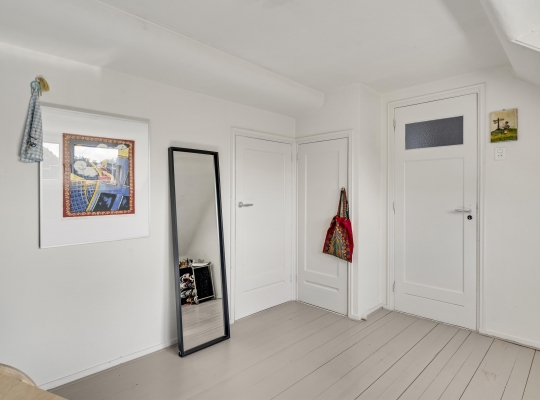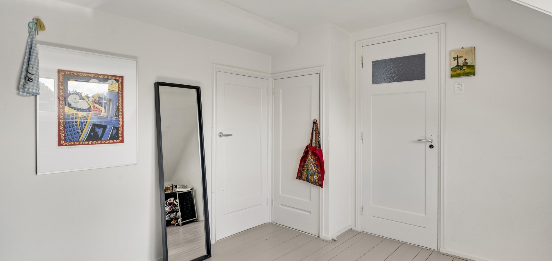 Niet alleen op de begane grond, maar ook op de overloop ligt een houten vloer die goed bij de paneeldeuren past. De indeling is gewijzigd, want een van de slaapkamers is verbouwd tot ruime badkamer en de doucheruimte is nu een toilet-/wasruimte.