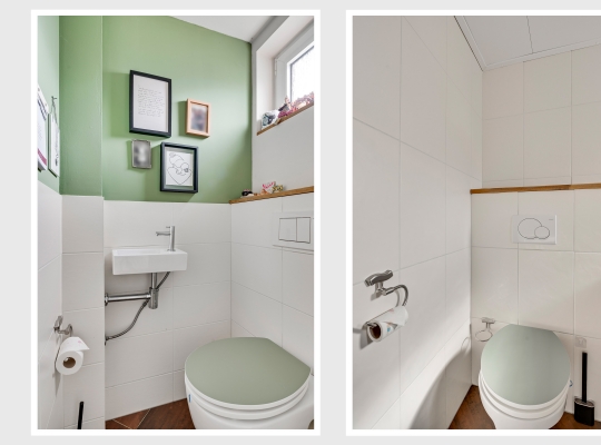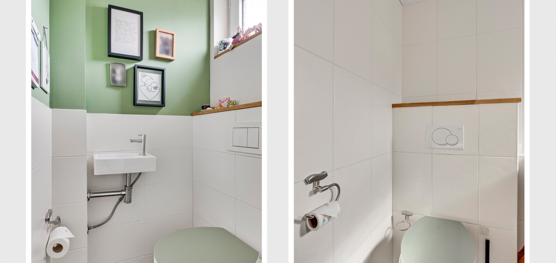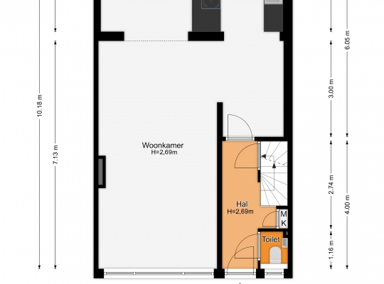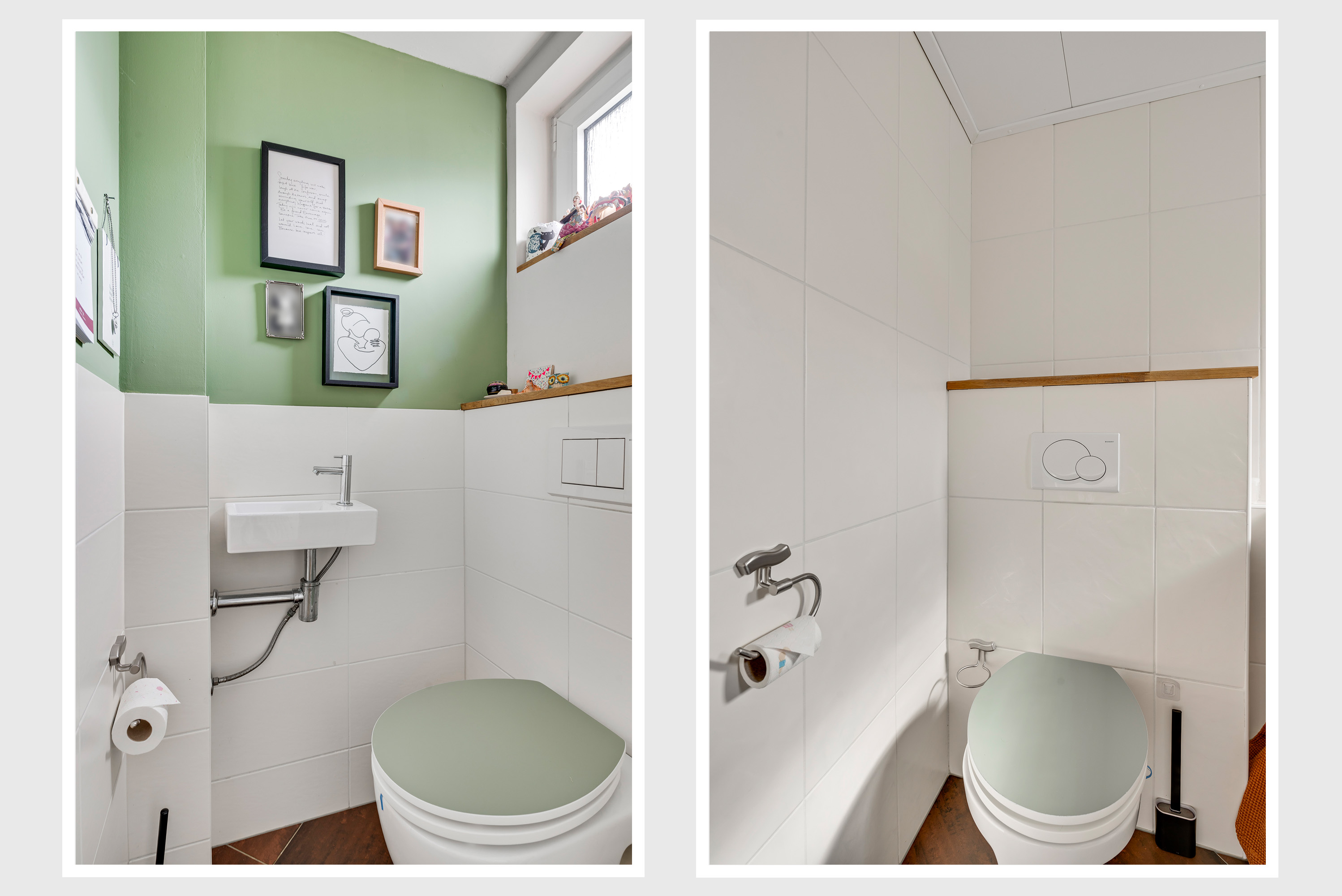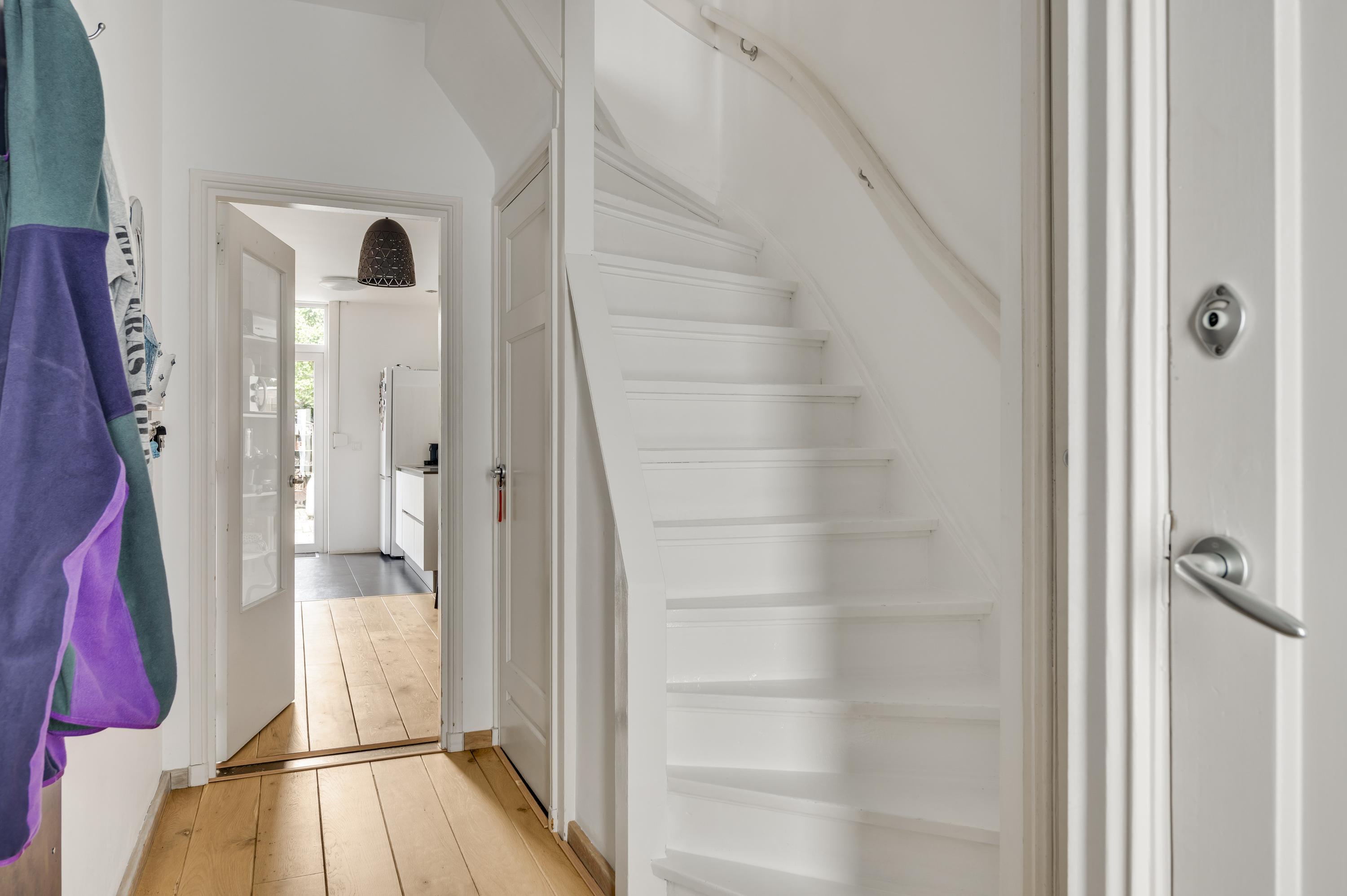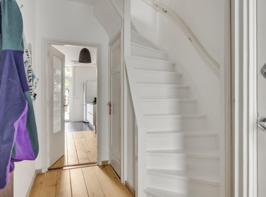 De hal (circa 3,96 x 1,11) is een fraaie ruimte, mede dankzij de paneeldeuren en de houten vloer. In de hal is niet alleen de trap naar de eerste verdieping, maar ook een trap naar het souterrain. De toiletruimte, met een wandcloset en een fonteintje, is uitgevoerd in mooie kleuren en materialen. Het kunststof raam zorgt voor een toiletruimte met fijne lichtinval.