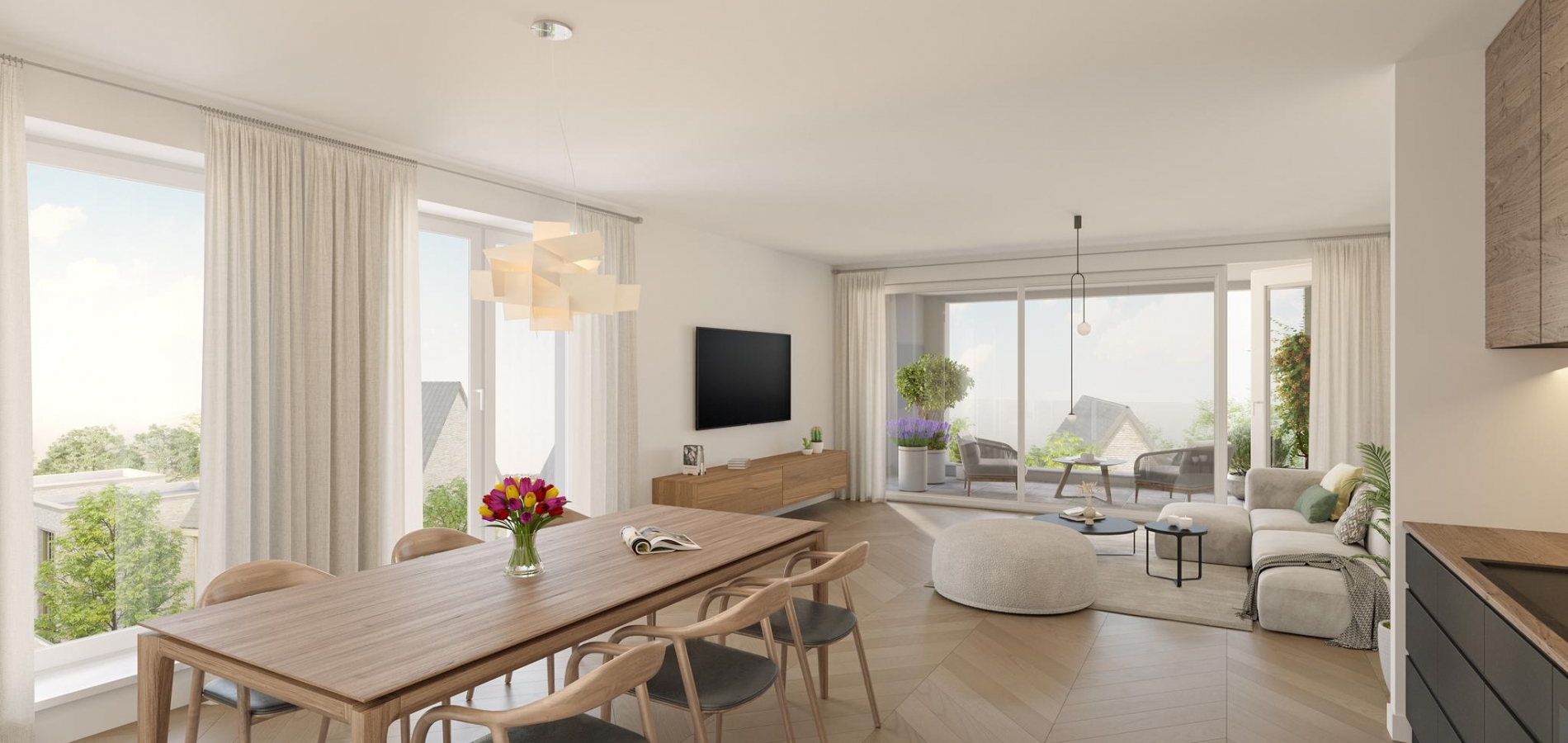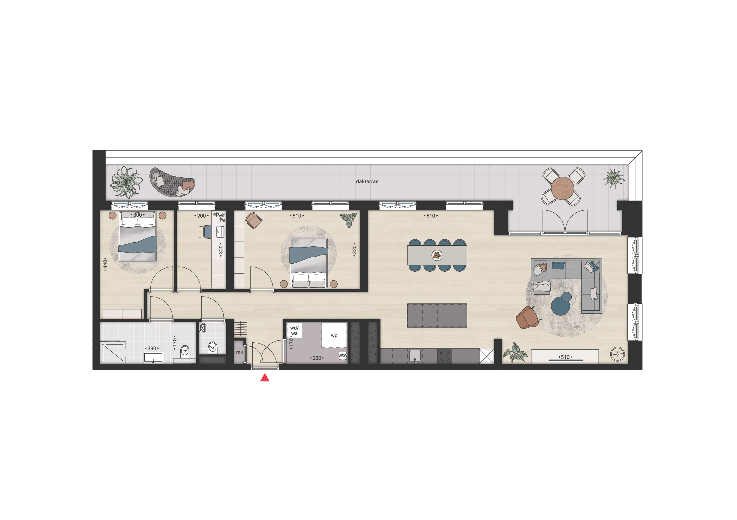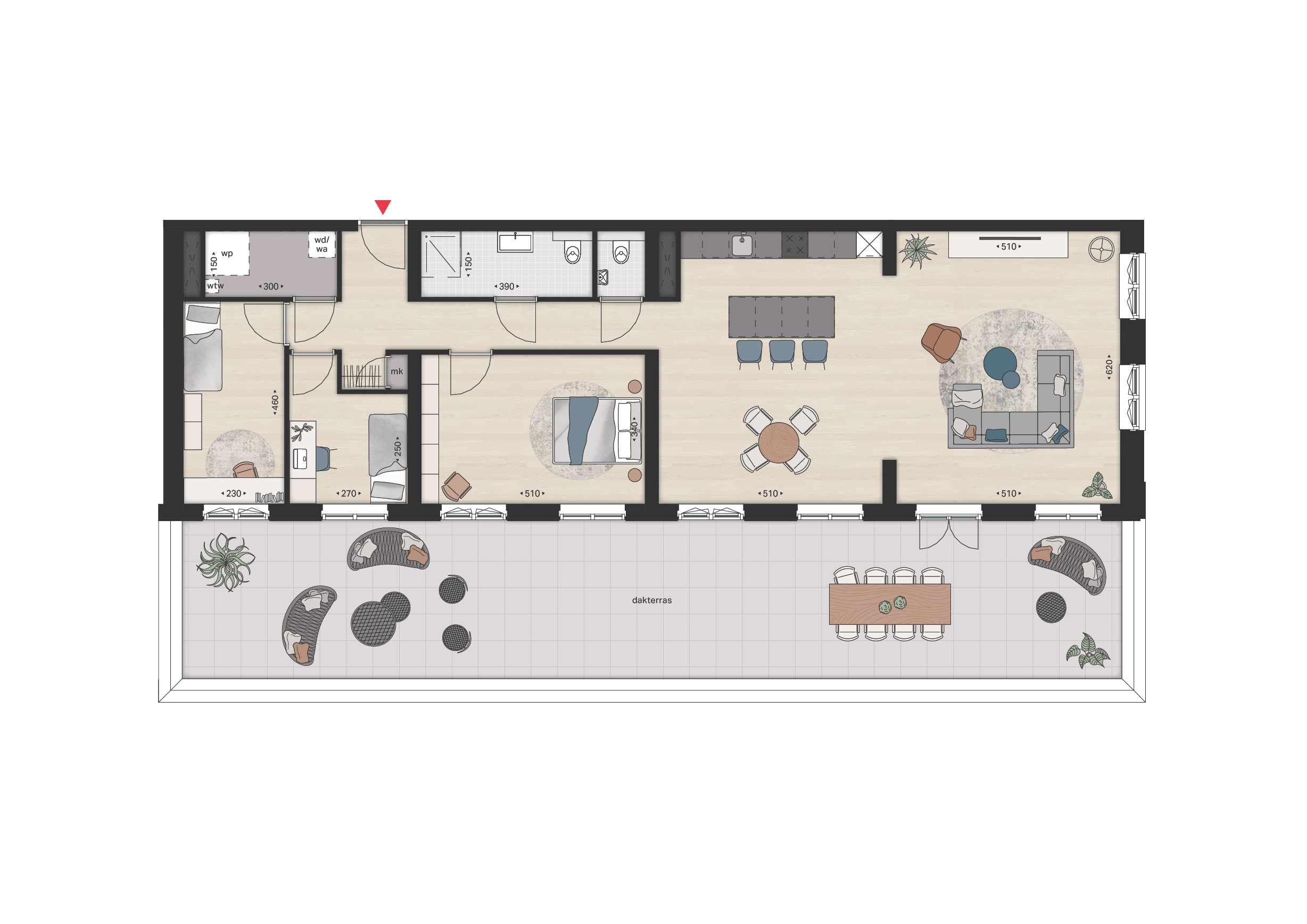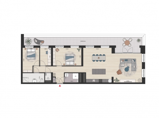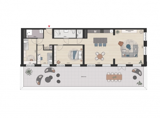 De penthouses beschikken beiden over een riant dakterras over de gehele breedte van het appartement. Type E beschikt over een dakterras van 38 m2, terwijl Type F beschikt over een dakterras van maar liefst 77 m2. Uitzonderlijk veel ruimte om lekker te kunnen genieten van een fijn binnen-buitengevoel.