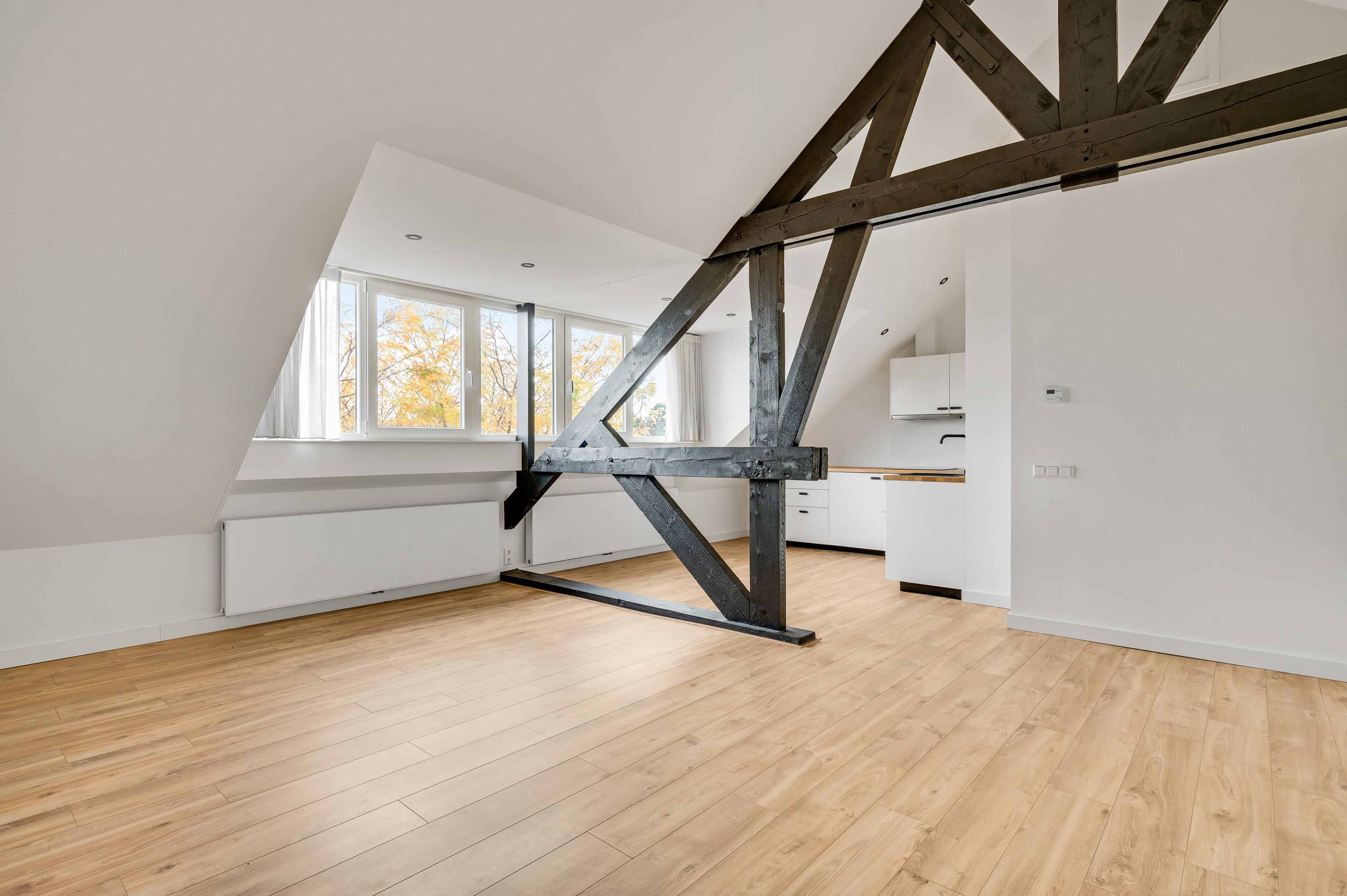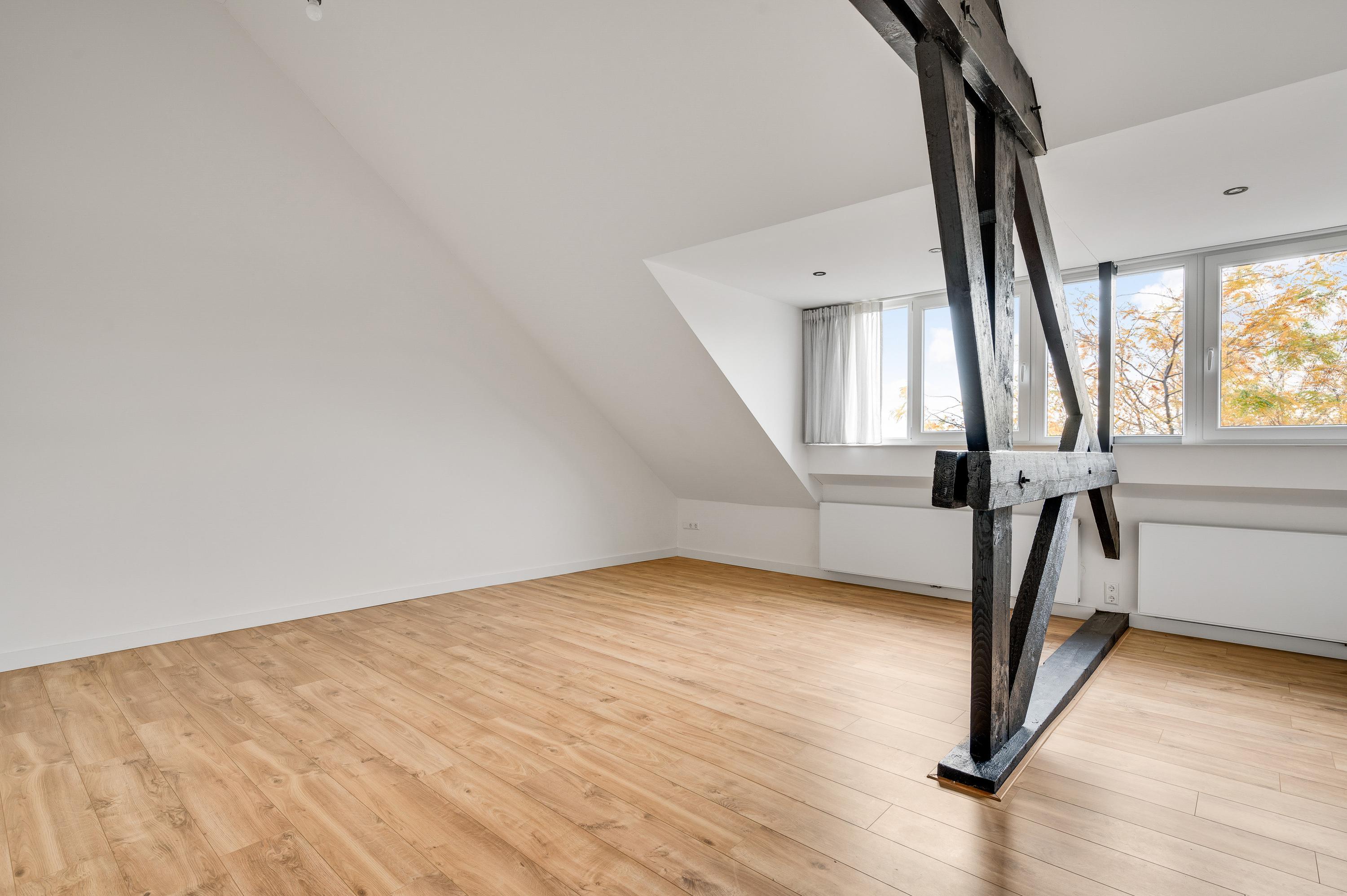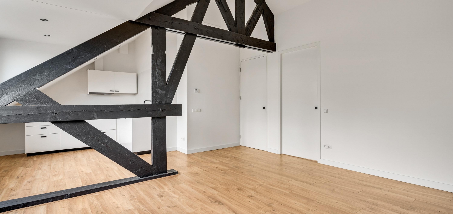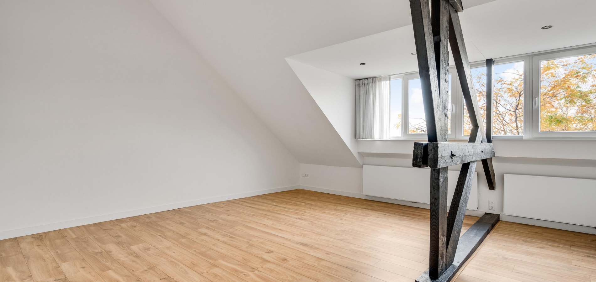 Het tweede deel van de hal geeft toegang tot de woonkamer, slaapkamers, de toiletruimte en badkamer. In de woonkamer (circa 24 m2) zorgt een grote dakkapel voor veel lichtinval. Fraaie elementen zijn de hoge nok en de originele dakconstructie, die in stijlvol zwart is geschilderd.