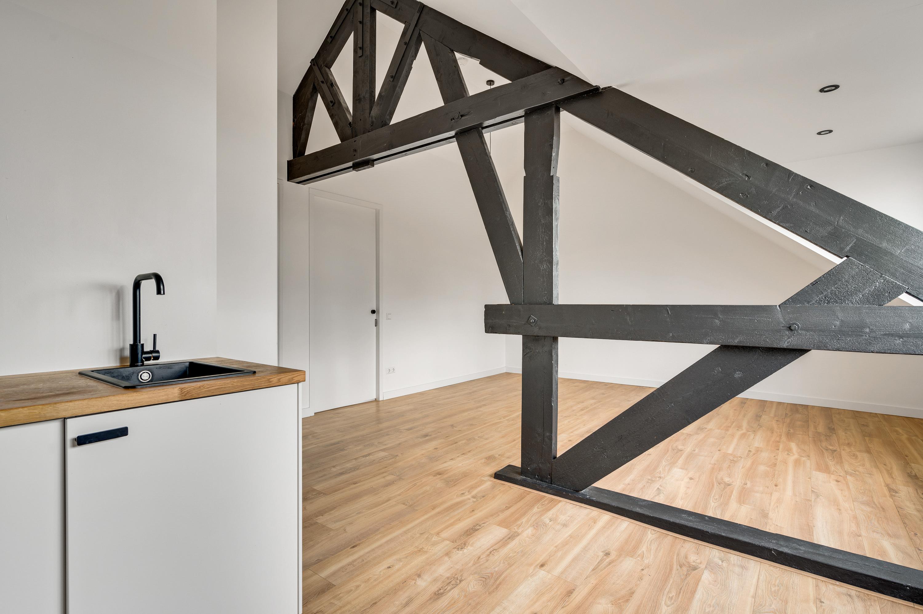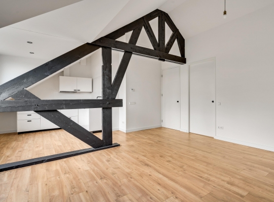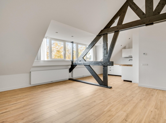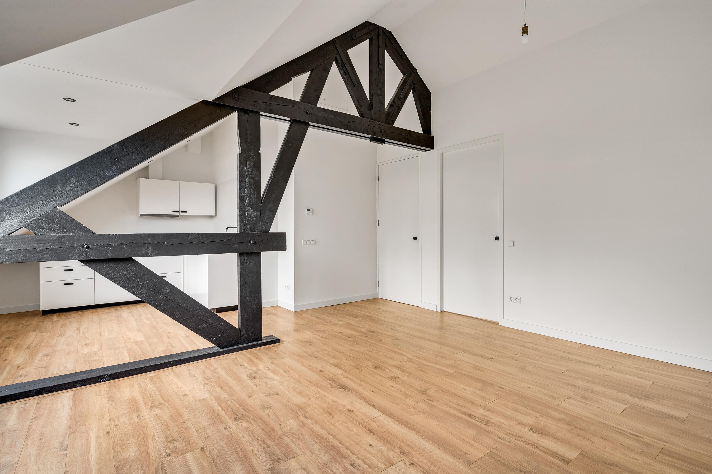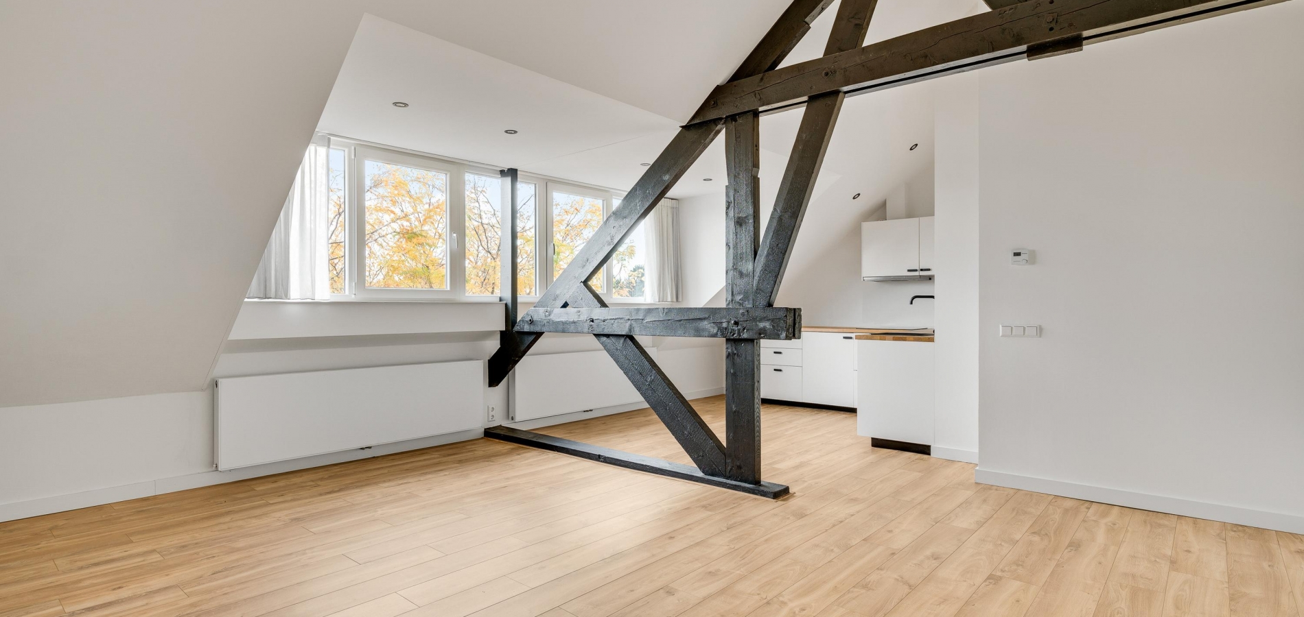Het tweede deel van de hal geeft toegang tot de woonkamer, slaapkamers, de toiletruimte en badkamer. In de woonkamer (circa 24 m2) zorgt een grote dakkapel voor veel lichtinval. Fraaie elementen zijn de hoge nok en de originele dakconstructie, die in stijlvol zwart is geschilderd.