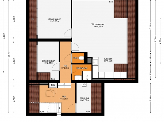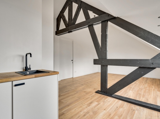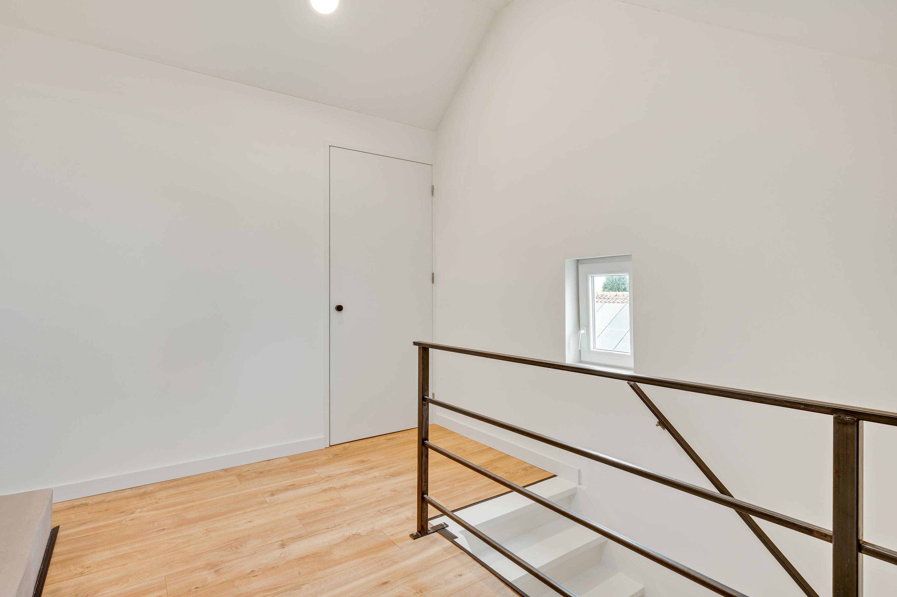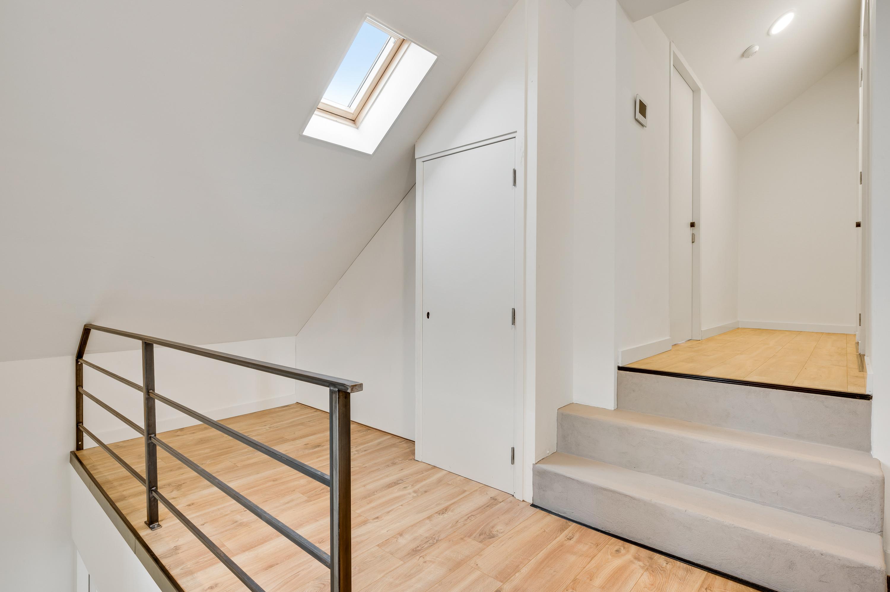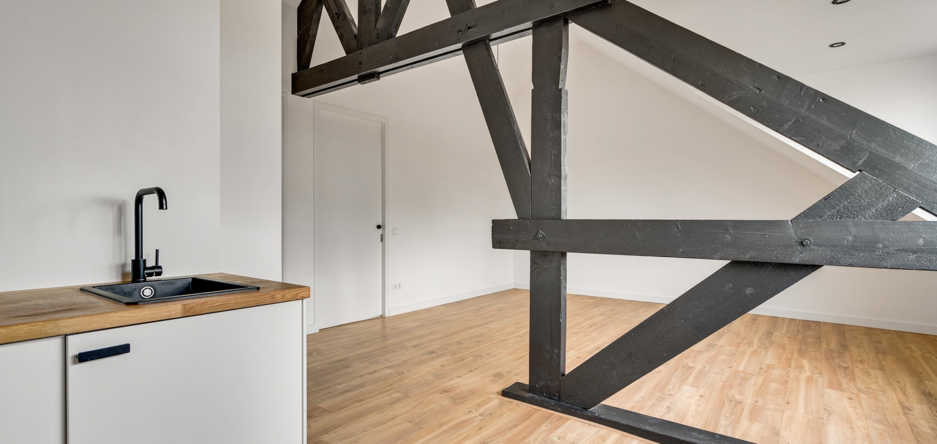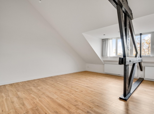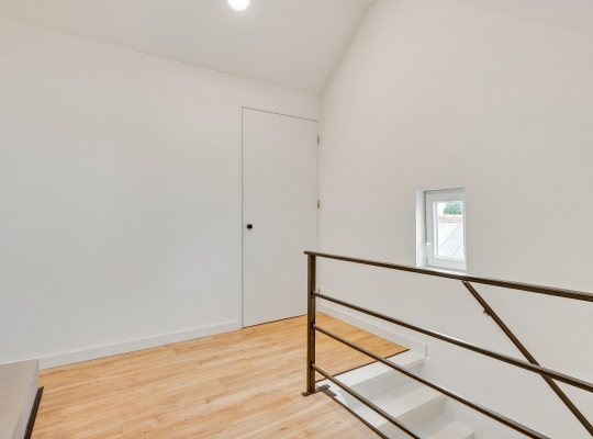 Het tweede deel van de hal geeft toegang tot de woonkamer, slaapkamers, de toiletruimte en badkamer. In de woonkamer (circa 24 m2) zorgt een grote dakkapel voor veel lichtinval. Fraaie elementen zijn de hoge nok en de originele dakconstructie, die in stijlvol zwart is geschilderd.