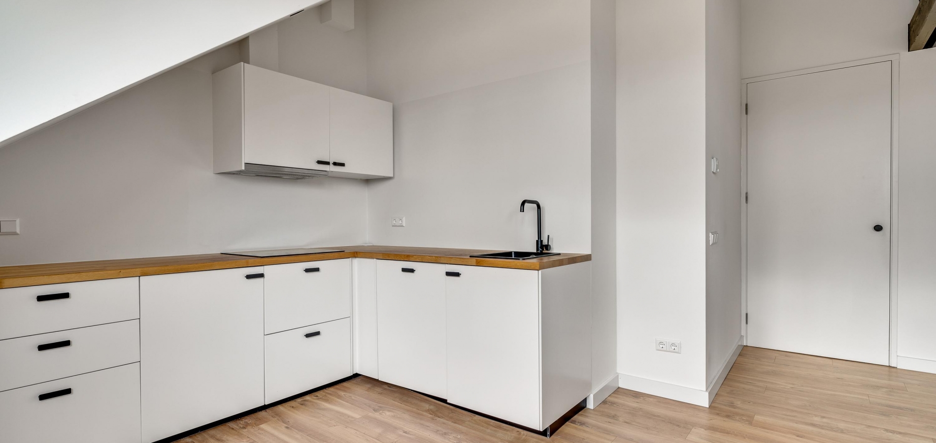 De open keuken heeft een oppervlakte van circa 8 m2. U hoeft niet meer naar de keukenspeciaalzaak, want er staat een splinternieuwe hoekopstelling met een zwarte kraan, spoelbak, handgreepjes en een houten aanrechtblad. De inductie kookplaat, afzuigkap en vaatwasser zijn ingebouwd.
