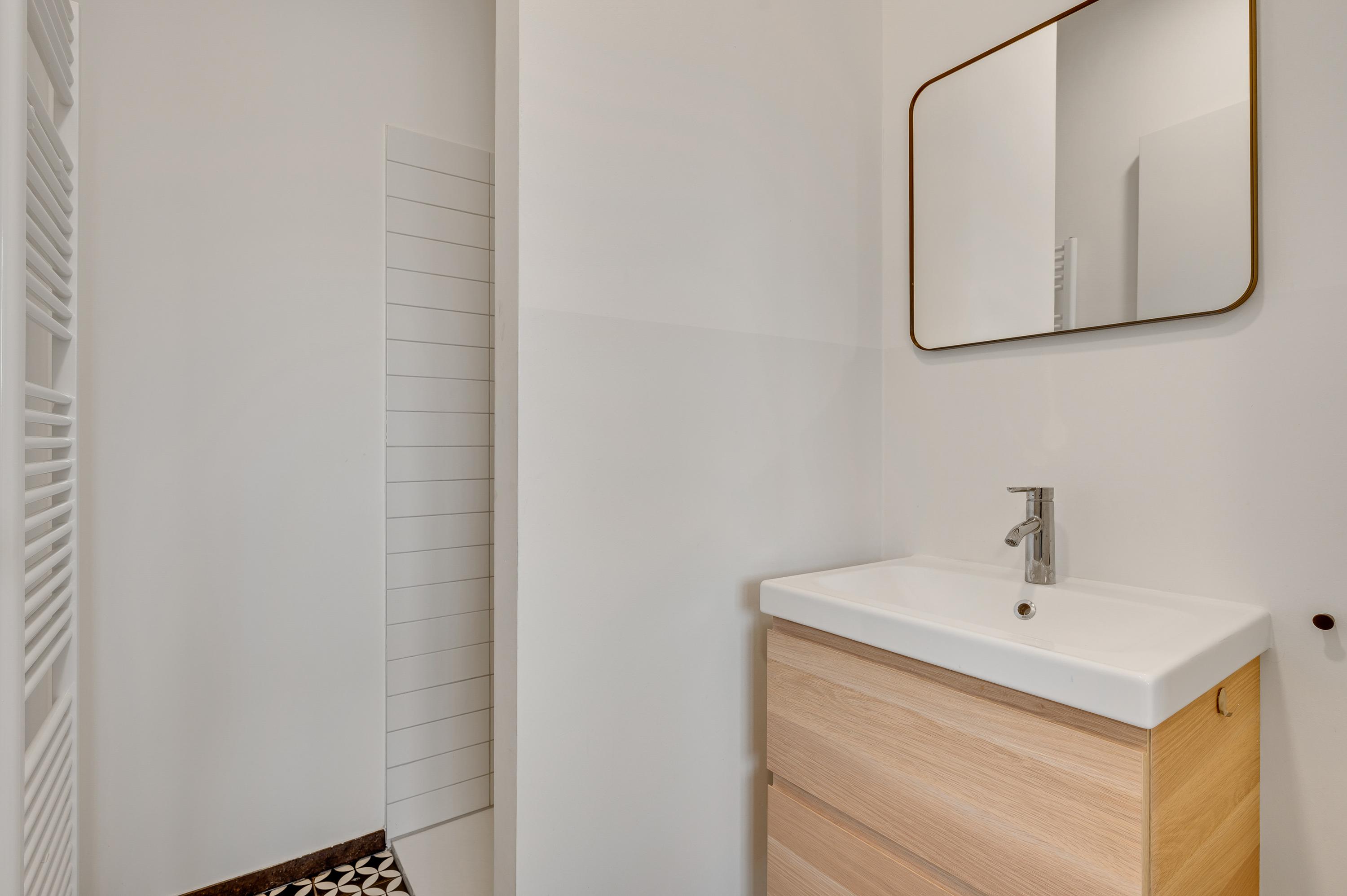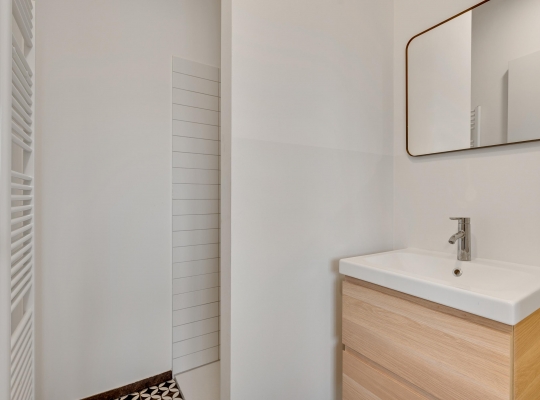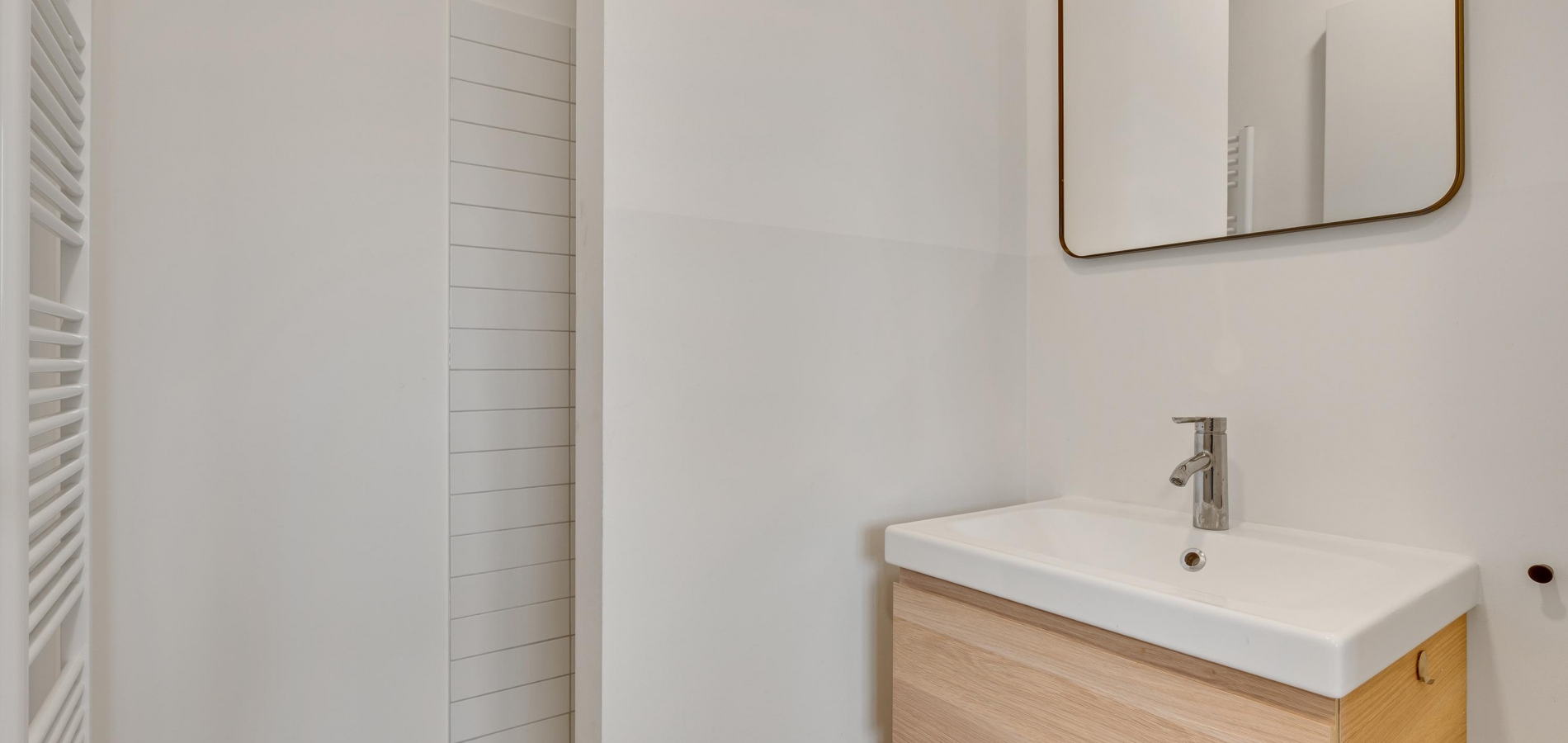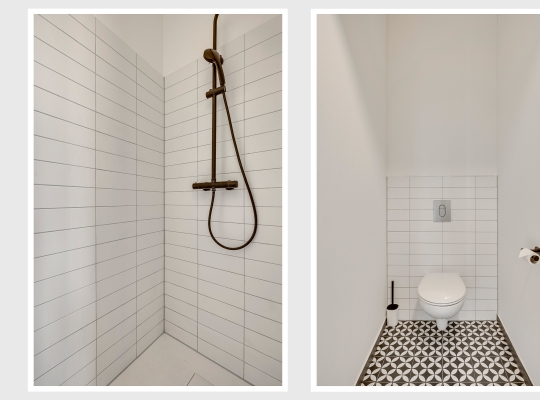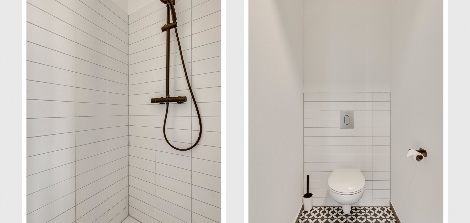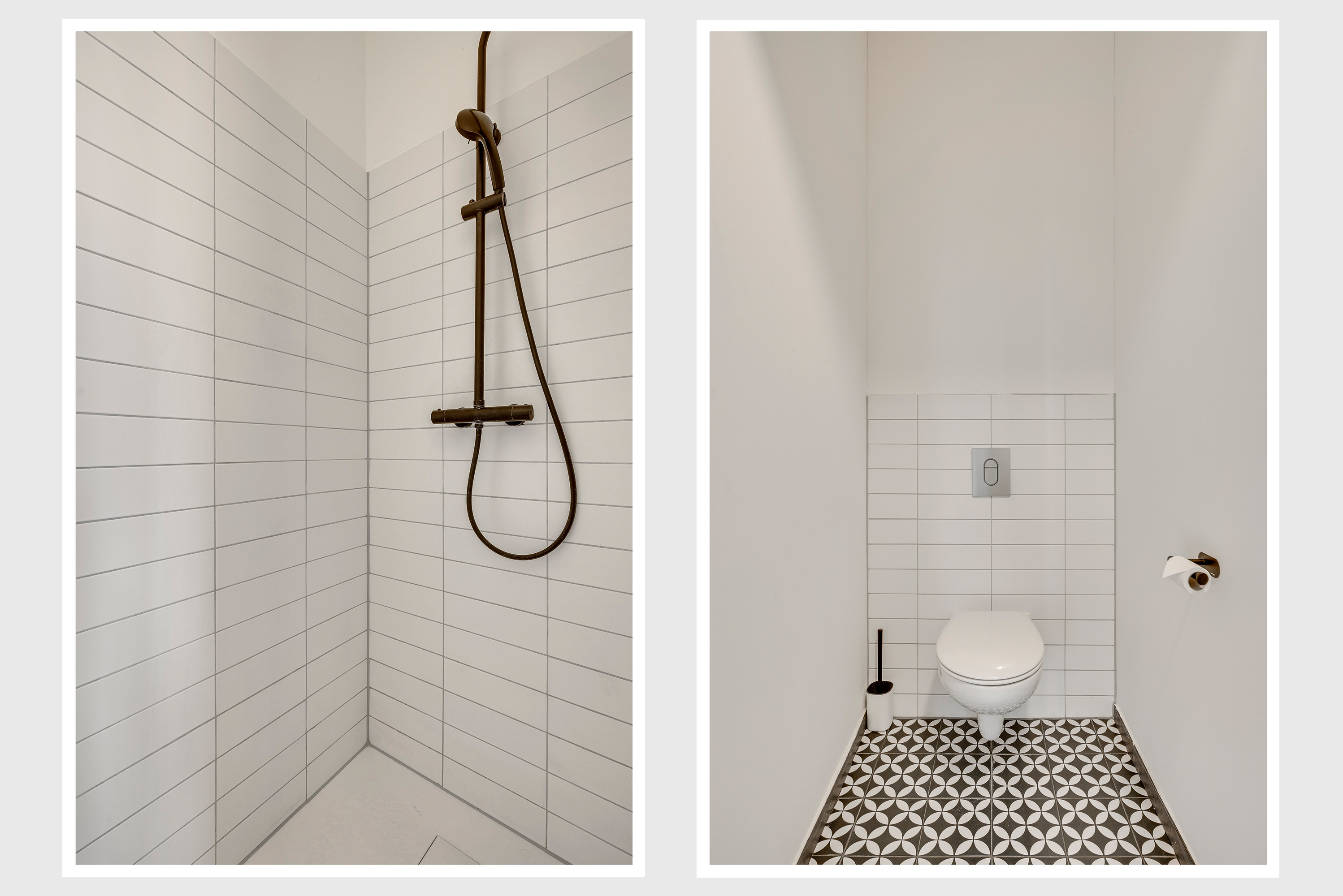 Aan de overzijde van de hal is de badkamer (circa 1,92 x 1,56). Fraai tegelwerk is gecombineerd met modern sanitair, uitgevoerd in mooie kleuren. De douche is van goed formaat en verder heeft u de beschikking over een wastafelmeubel, een spiegel en een handdoekenradiator. Naast de badkamer is de toiletruimte met wandcloset, uitgevoerd in dezelfde stijl.