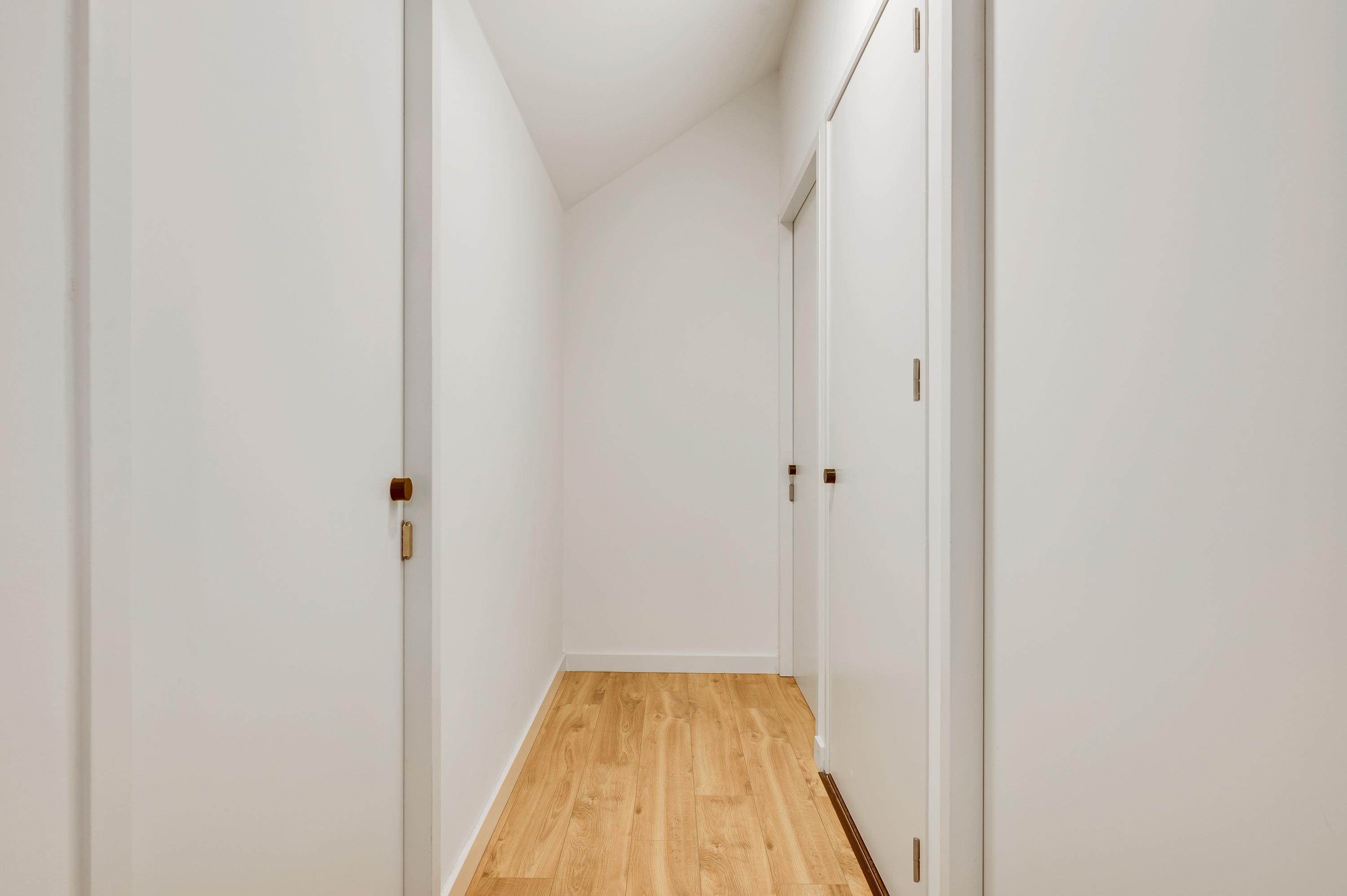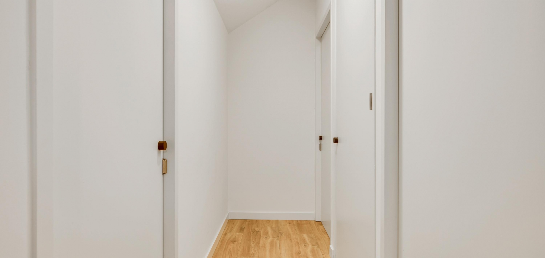 Op de tweede verdieping is de entree van het appartement, die toegang geeft tot een ruime hal. Door het raampje valt het daglicht naar binnen en er ligt, net als in bijna het hele appartement, een mooie pvc-vloer. De inpandige berging (circa 2,94 x 2,48 vloeroppervlakte) biedt ruimte aan de HR-ketel (Vaillant, 2022, eigendom). Ook is hier de aansluiting voor de wasmachine.