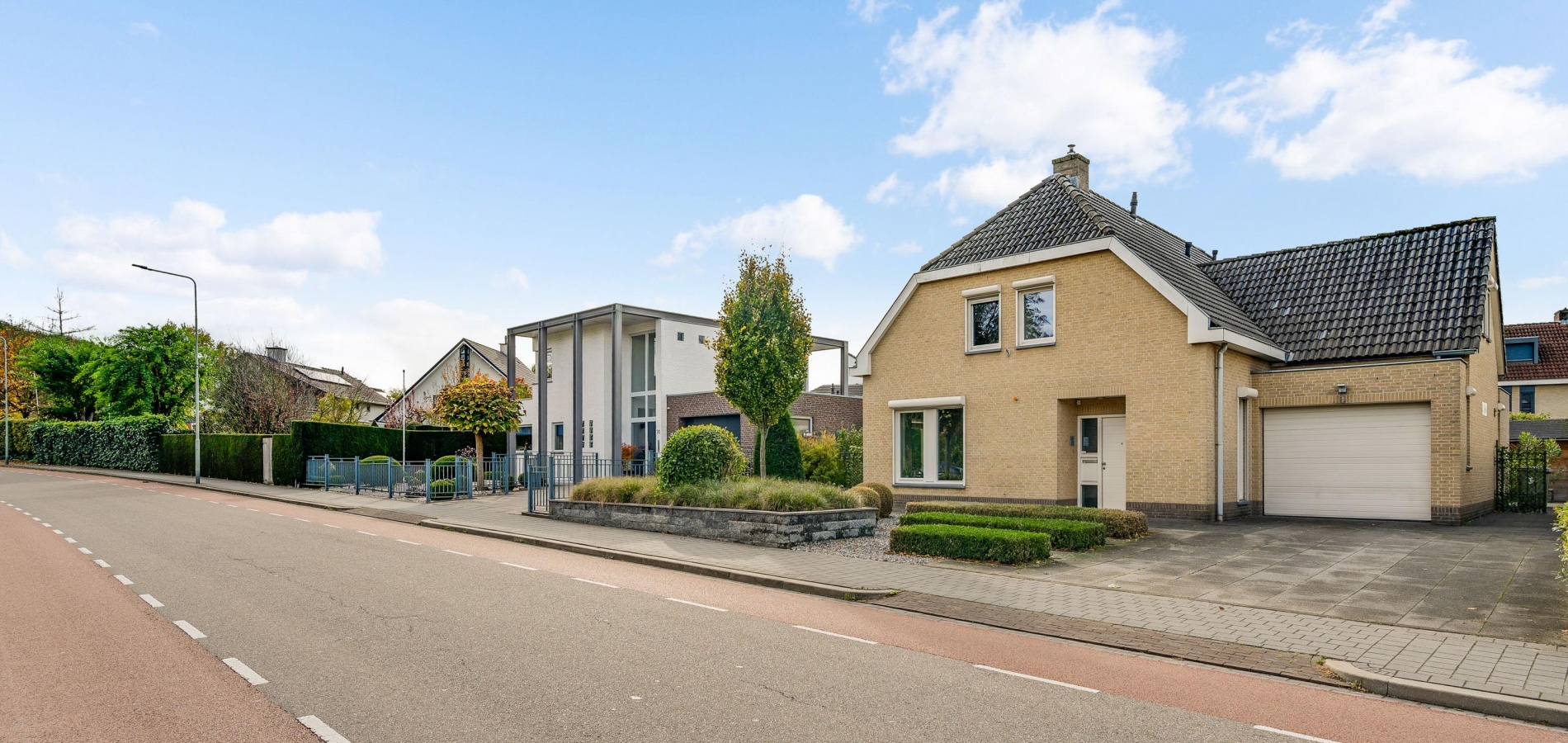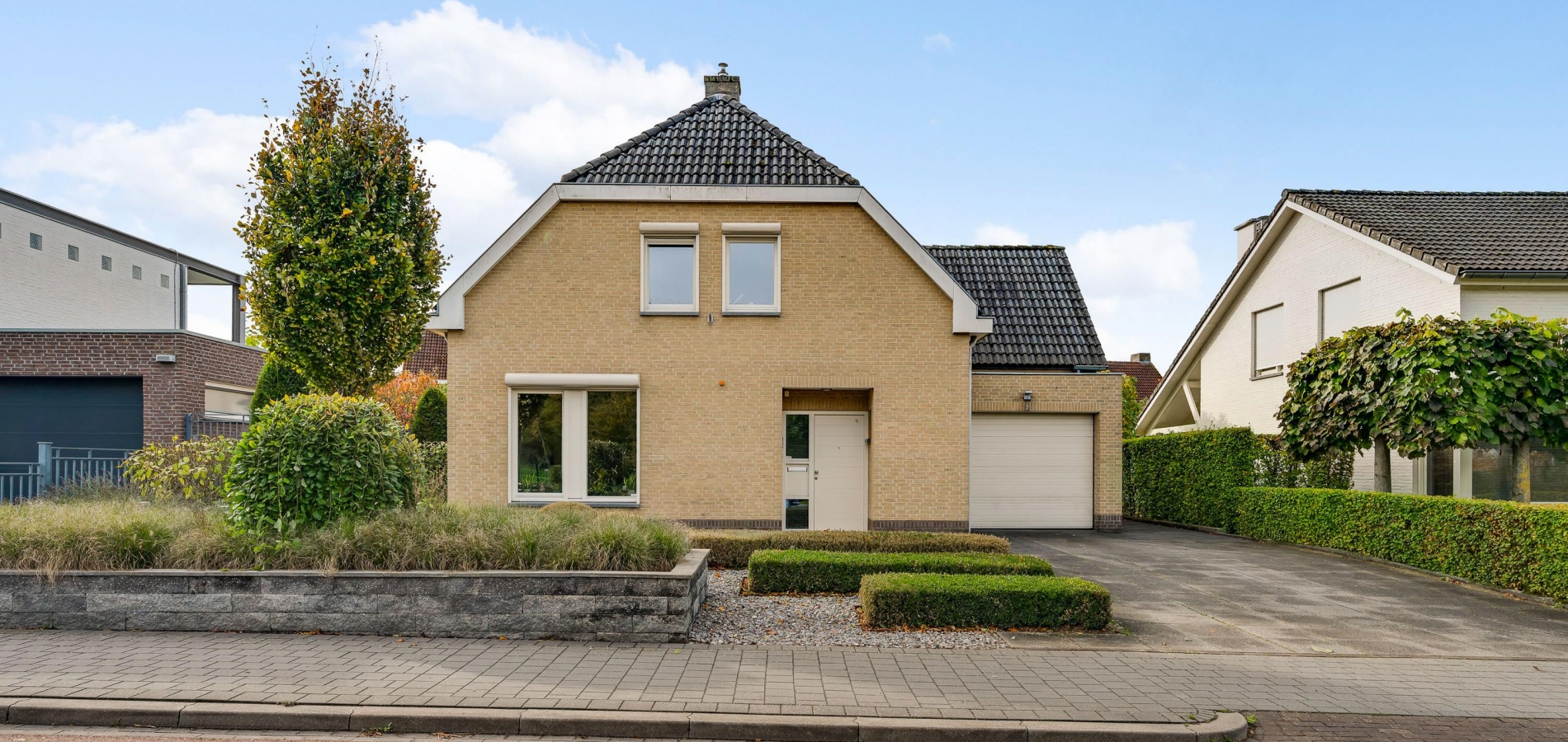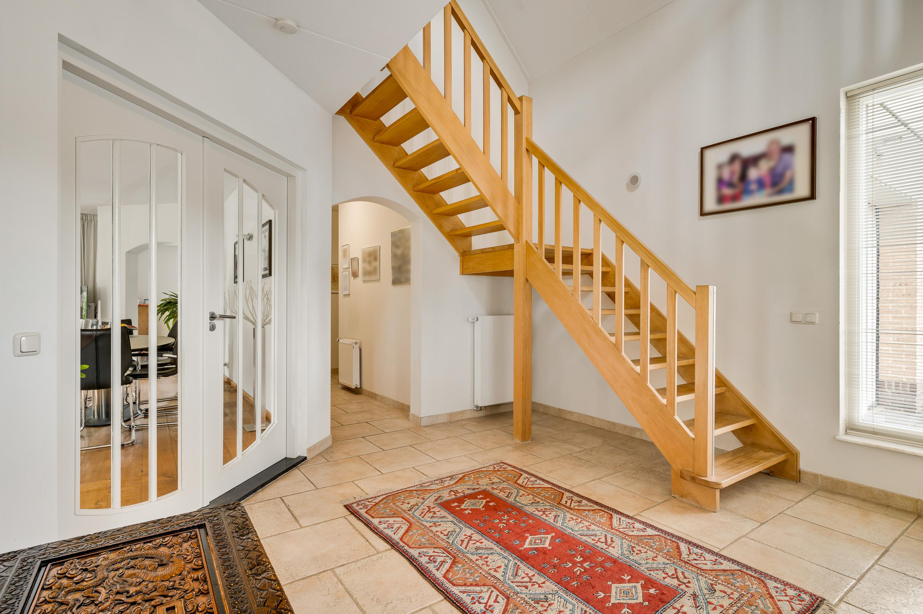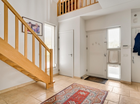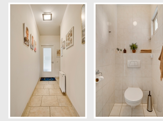 Aan de voorzijde, naast de oprit, is de overdekte entree van deze fraaie villa. In de royale ontvangsthal zijn de meterkast, de bordestrap en het gastentoilet. De inpandig te bereiken garage (circa 6,84 x 3,30) is voorzien van elektra, een geïsoleerde sectionaalpoort en twee ramen in de zijgevel.