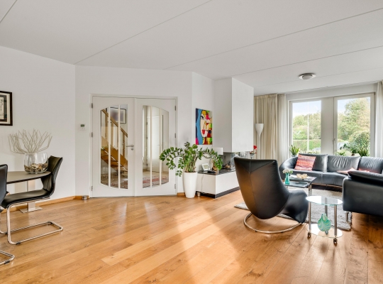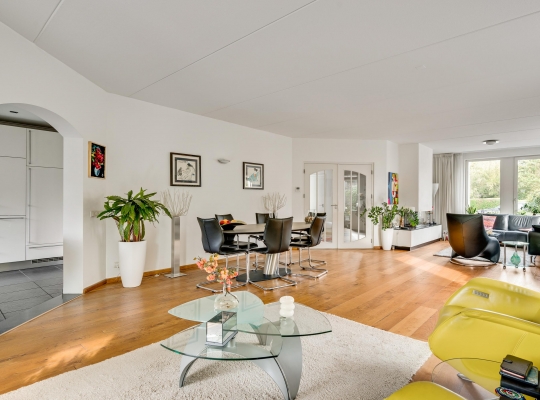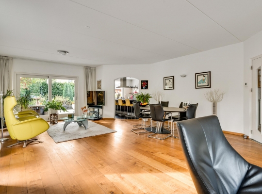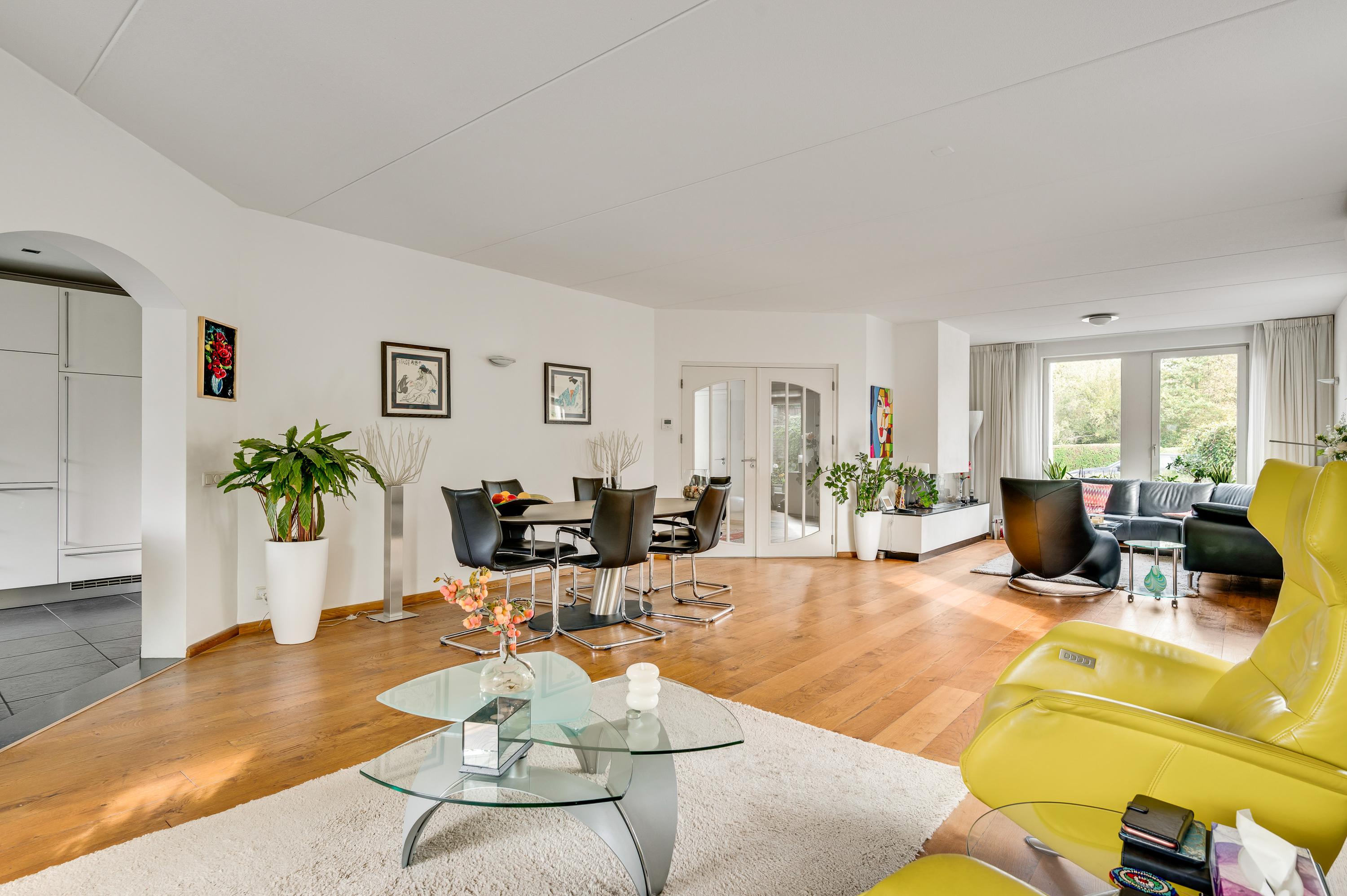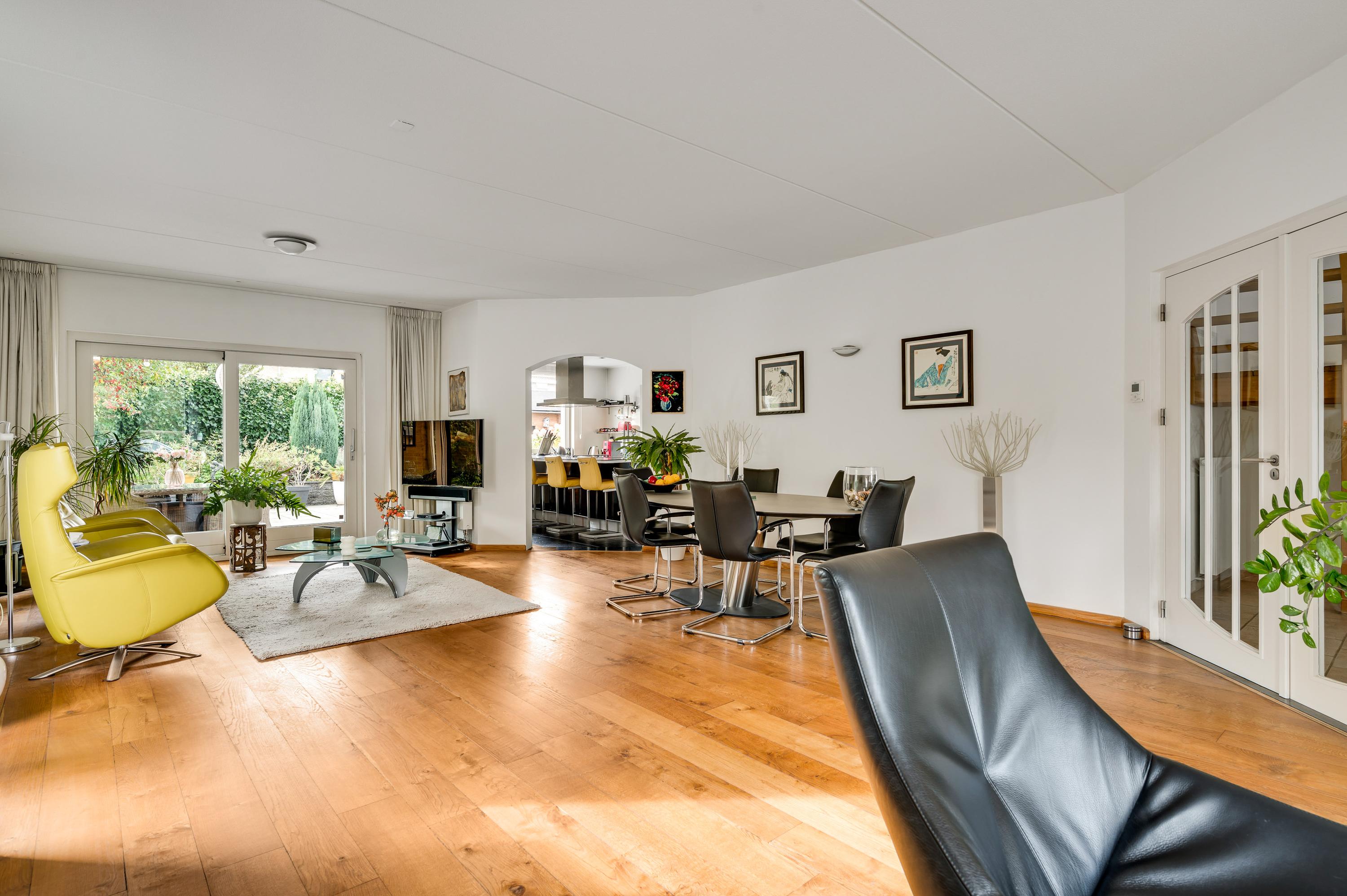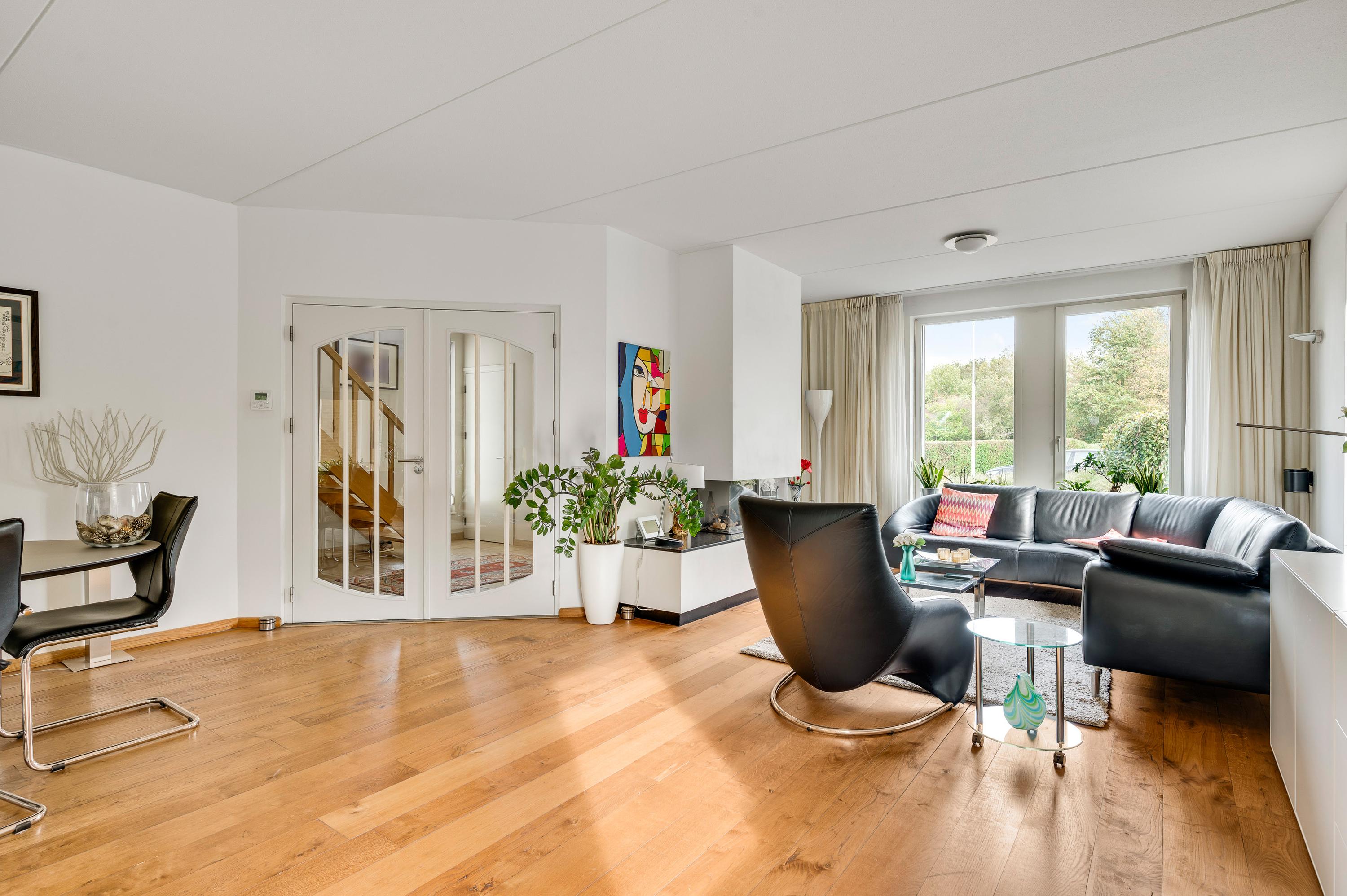 Twee stijlvolle deuren met glas verbinden de hal met de woonkamer van ruim 60 m2. Sfeermakers zijn de parketvloer en de moderne schouw met gashaard. Het zitgedeelte is aan de voorzijde, aan de achterzijde is het tv-gedeelte en in het hart van de woonkamer is het eetgedeelte. Grote ramen en de schuifpui zorgen voor veel lichtinval en er hangt een airco-unit, die kan koelen en verwarmen.