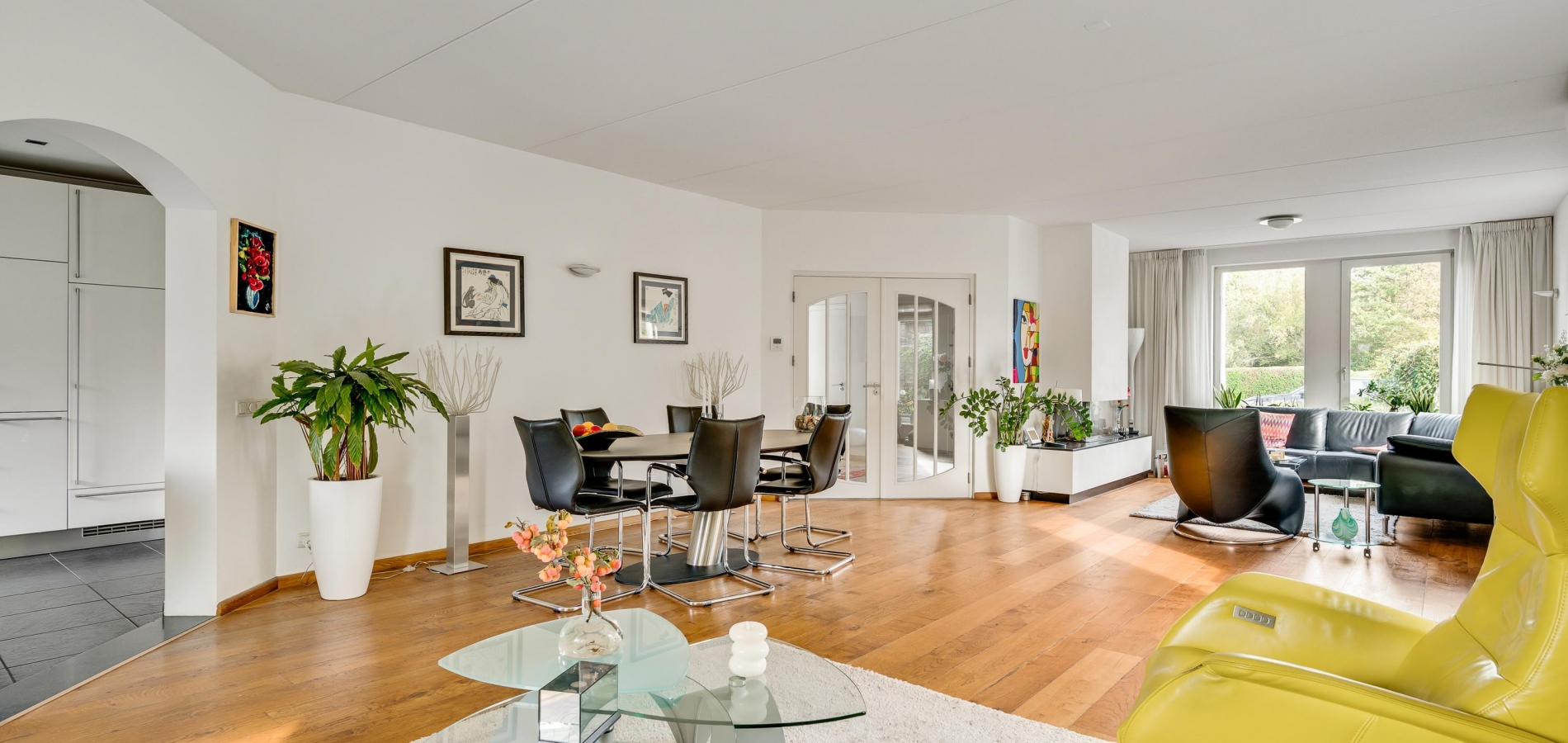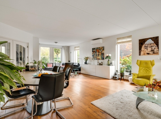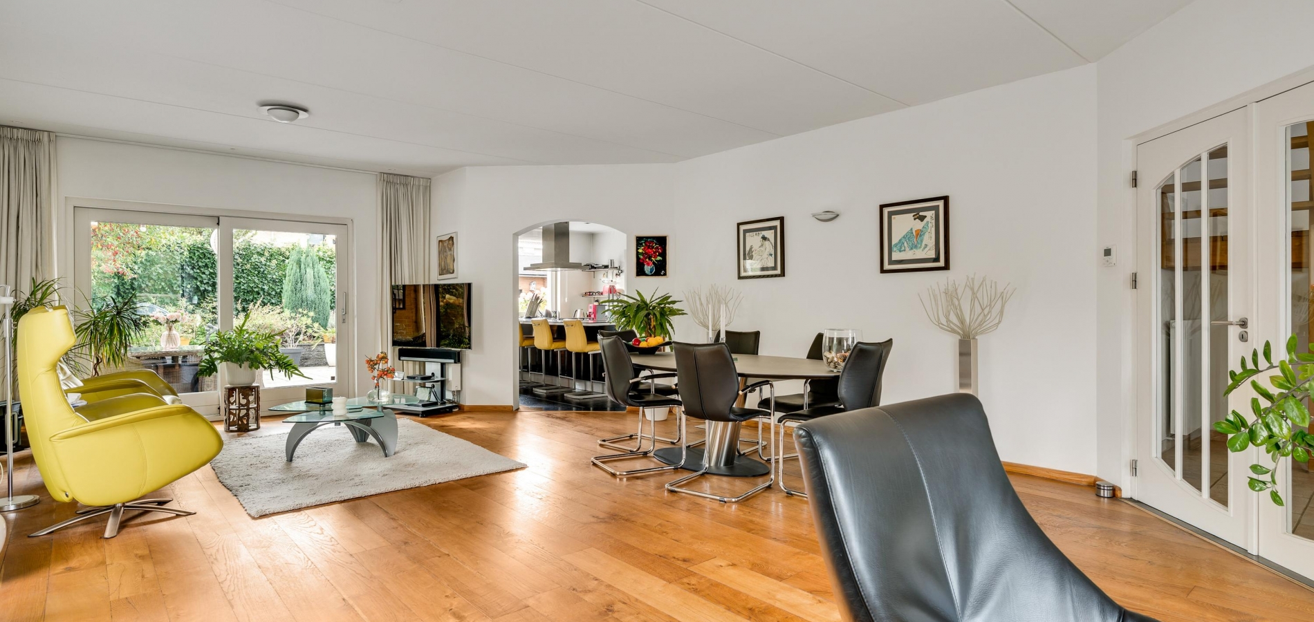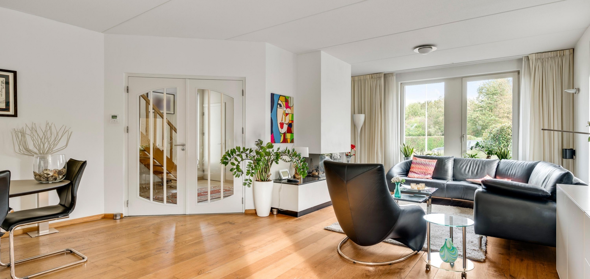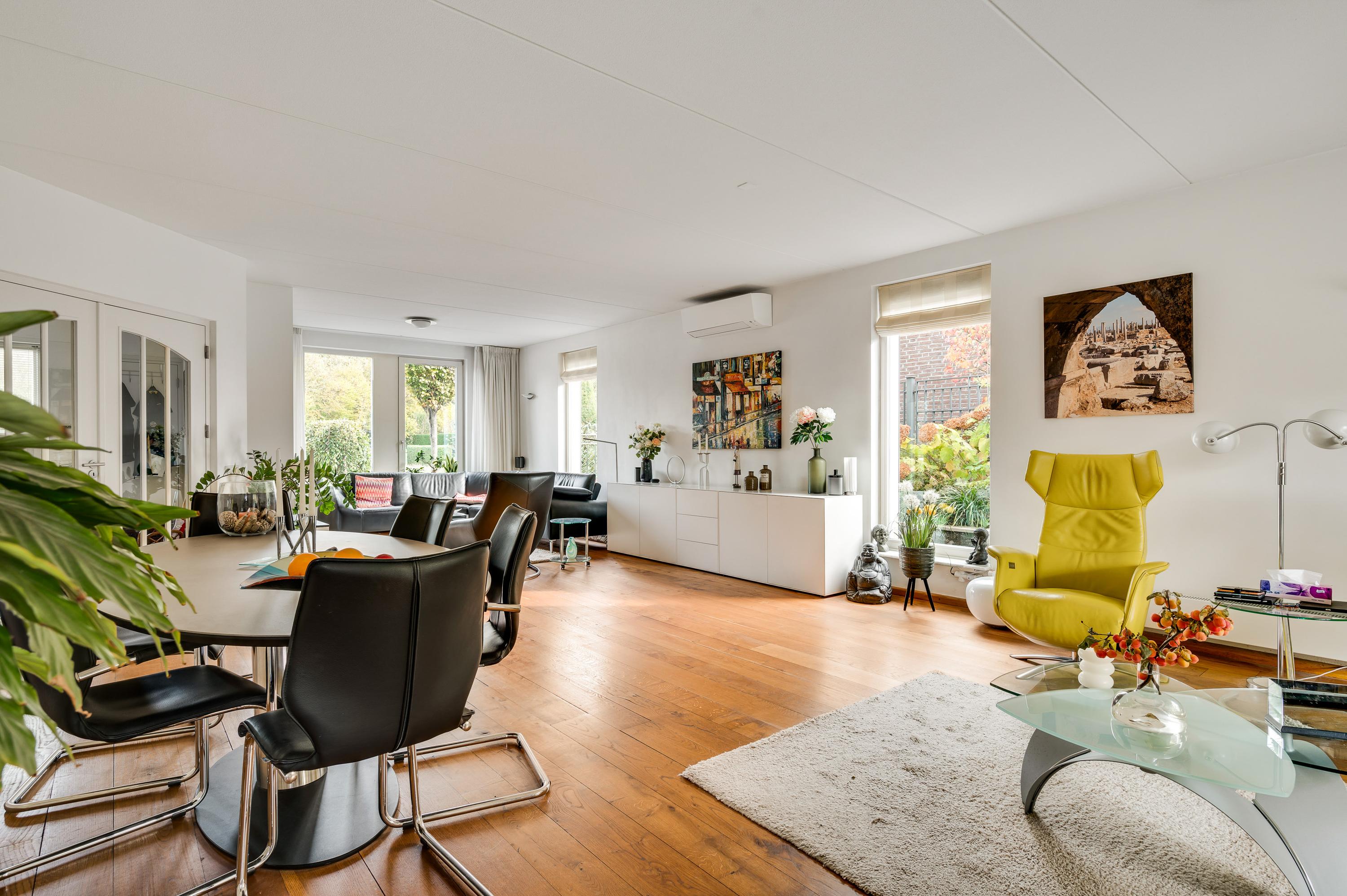 Twee stijlvolle deuren met glas verbinden de hal met de woonkamer van ruim 60 m2. Sfeermakers zijn de parketvloer en de moderne schouw met gashaard. Het zitgedeelte is aan de voorzijde, aan de achterzijde is het tv-gedeelte en in het hart van de woonkamer is het eetgedeelte. Grote ramen en de schuifpui zorgen voor veel lichtinval en er hangt een airco-unit, die kan koelen en verwarmen.