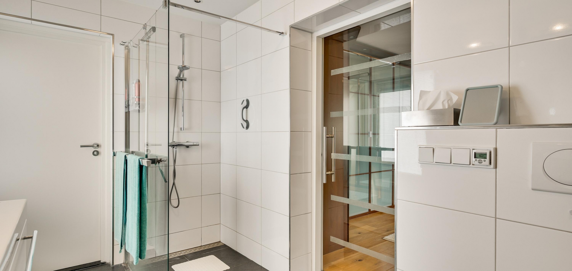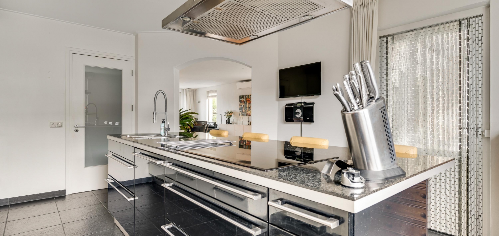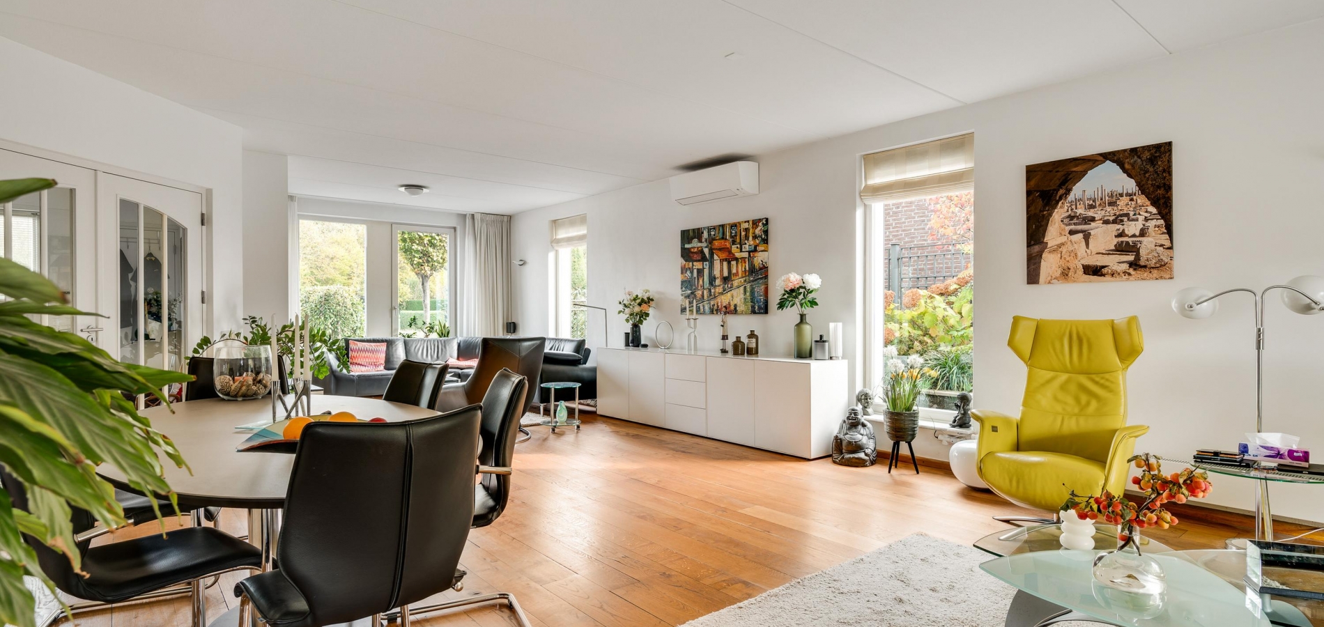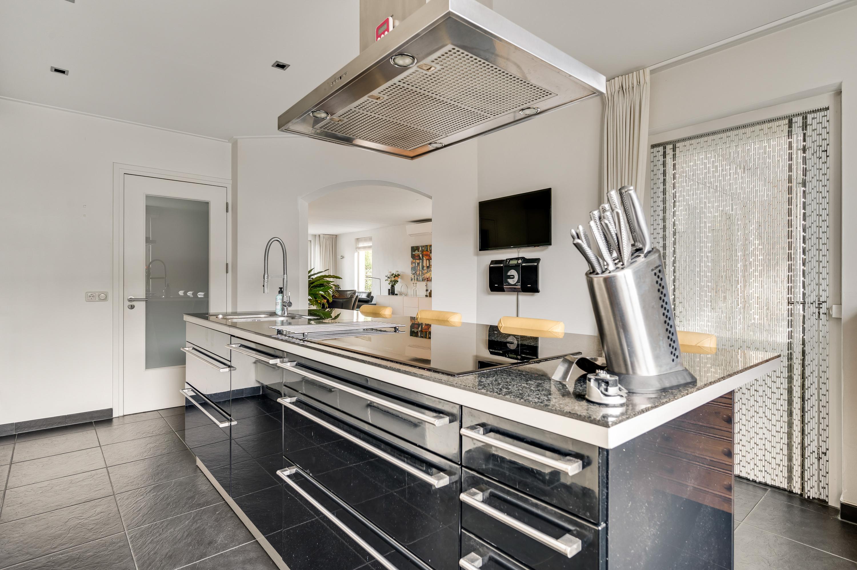 Twee stijlvolle deuren met glas verbinden de hal met de woonkamer van ruim 60 m2. Sfeermakers zijn de parketvloer en de moderne schouw met gashaard. Het zitgedeelte is aan de voorzijde, aan de achterzijde is het tv-gedeelte en in het hart van de woonkamer is het eetgedeelte. Grote ramen en de schuifpui zorgen voor veel lichtinval en er hangt een airco-unit, die kan koelen en verwarmen.