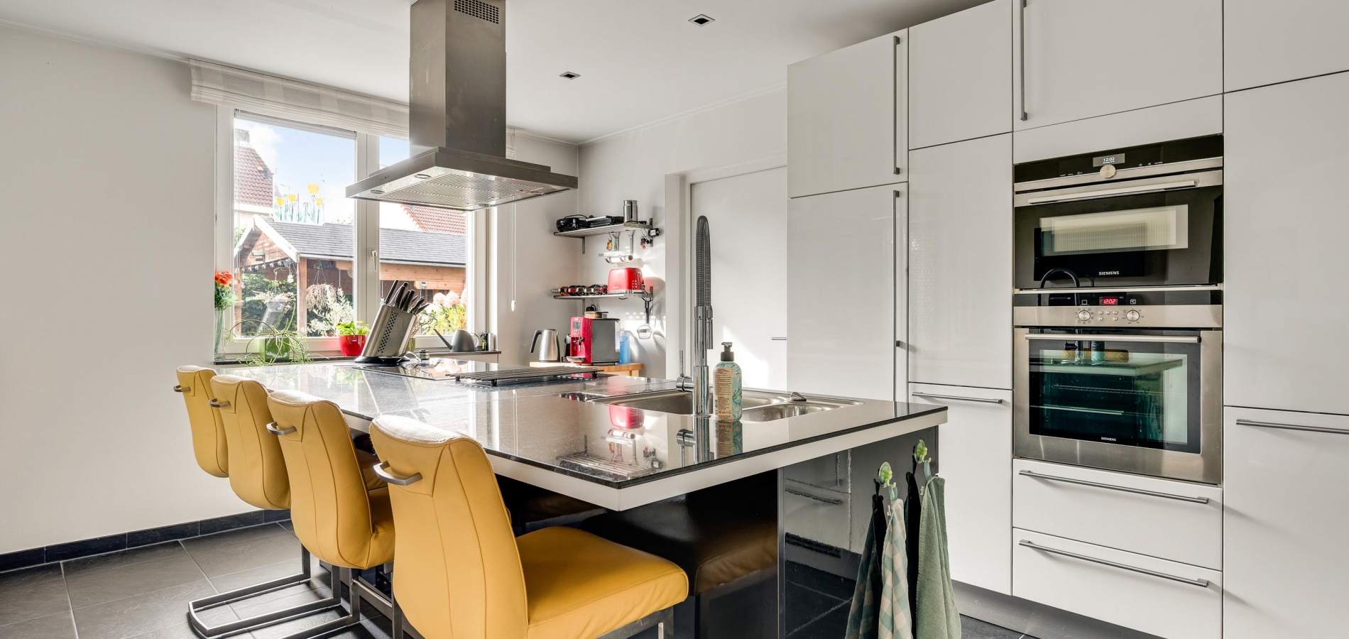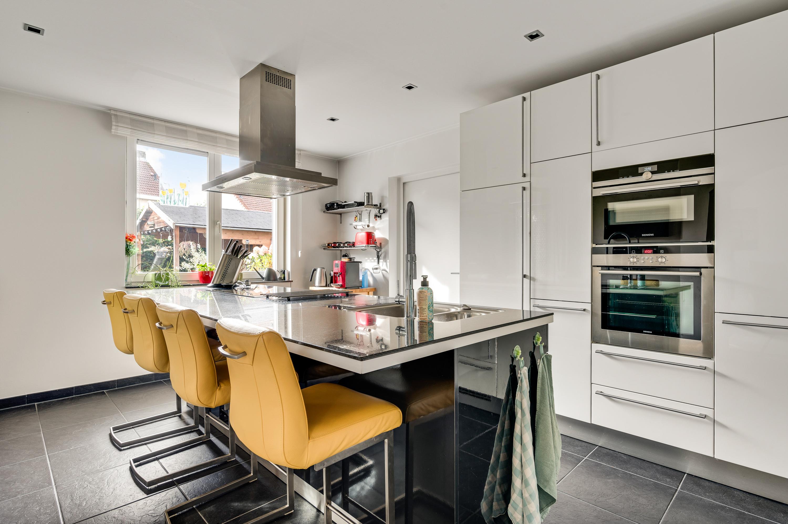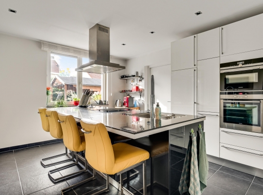 Vanuit de hal en woonkamer heeft u toegang tot de royale eetkeuken van circa 18 m2. De donkere tegelvloer past goed bij de keukenopstelling (2008) met een groot kook-, spoel- en ziteiland. Alle benodigde apparatuur van Bosch en Siemens is ingebouwd: een inductie kookplaat, afzuigkap, oven, combimagnetron, vaatwasser en een koelkast. Naast de keuken is de bijkeuken/wasruimte (circa 3,32 x 3,08), waar een tweede keukenopstelling met inbouwapparatuur staat.