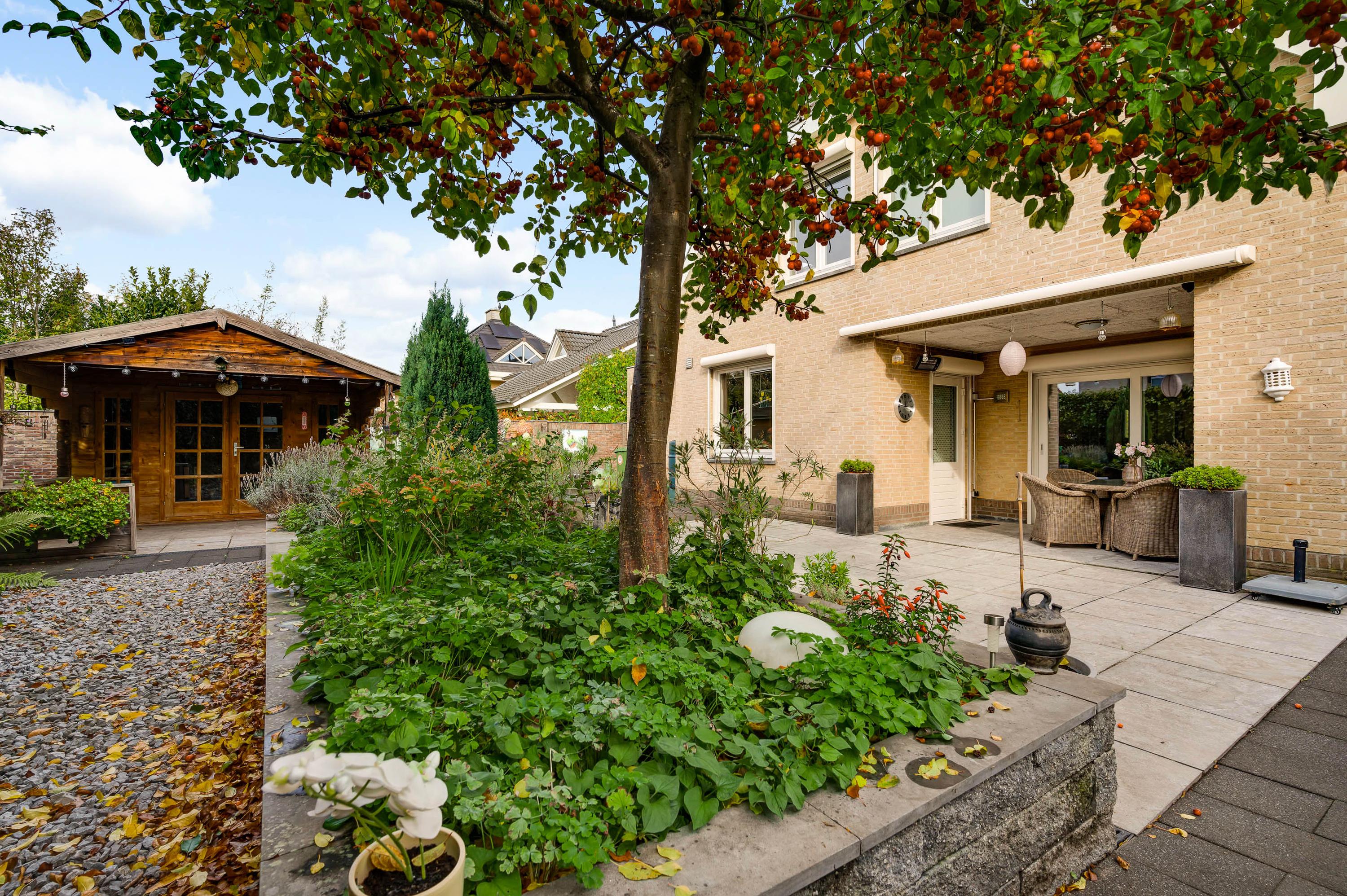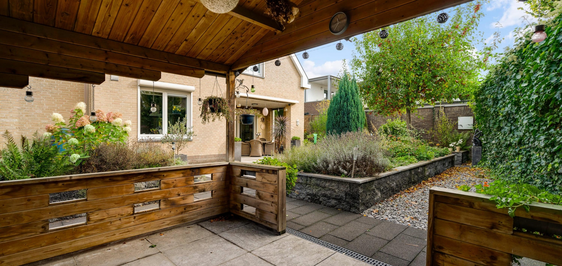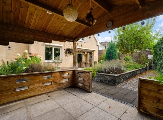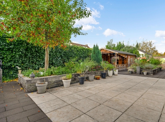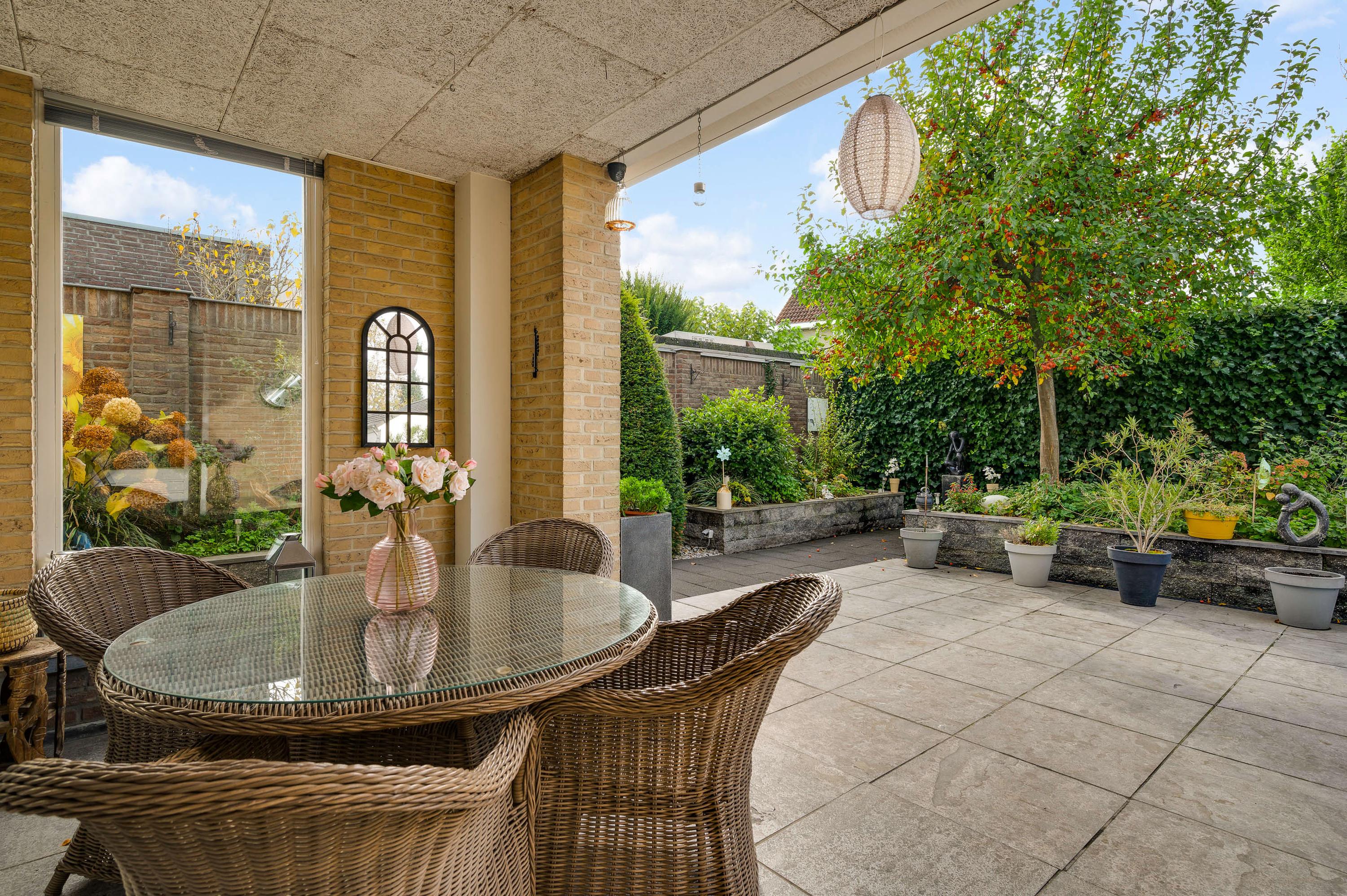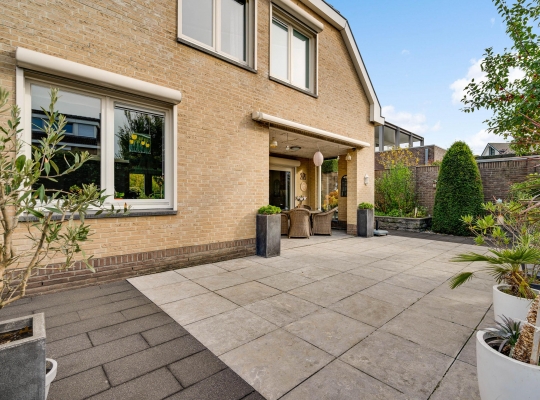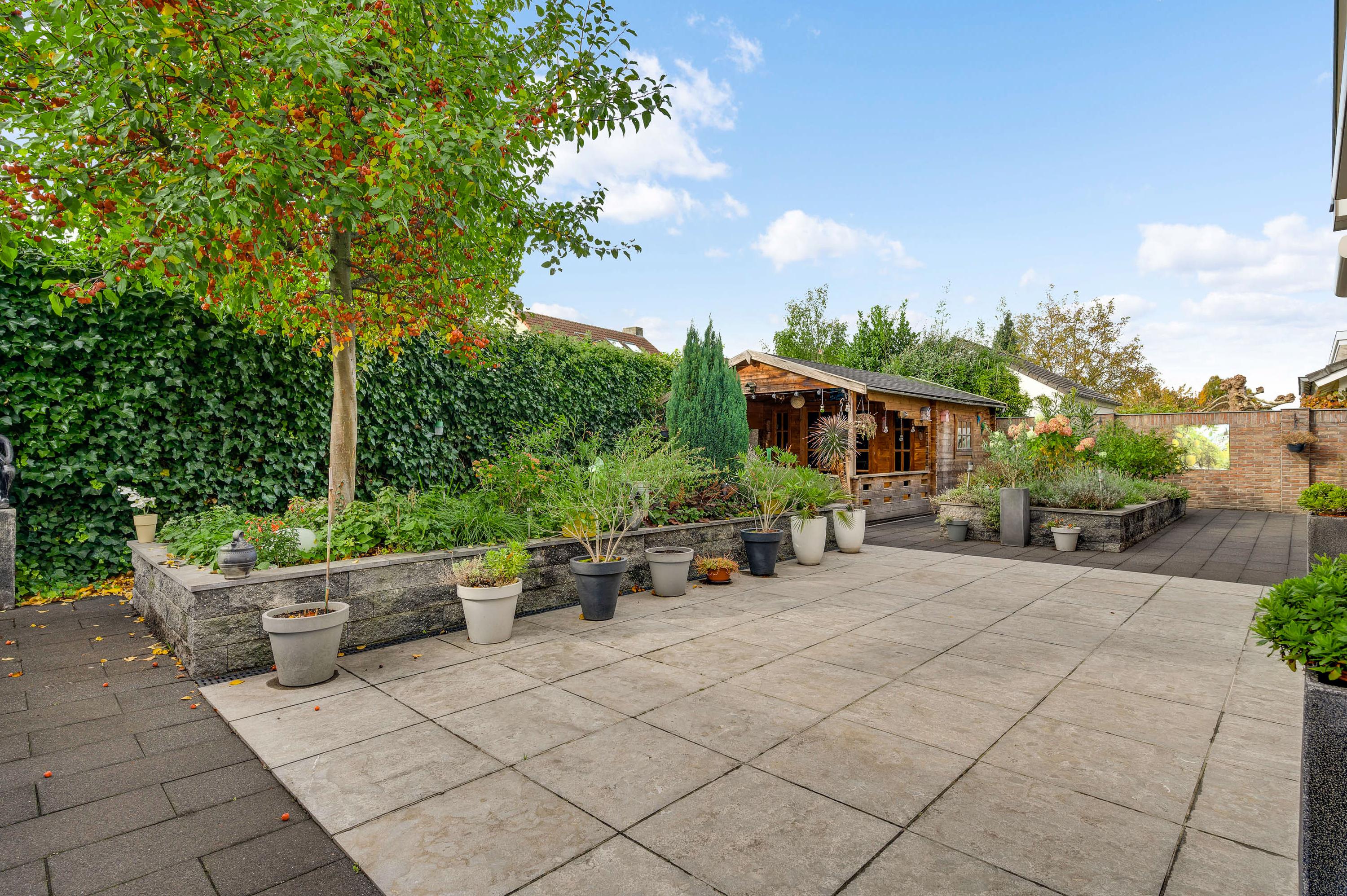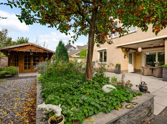 De villa wordt omringd door een fraai aangelegde tuin met een brede oprit, een eigen achterom en een grote variatie aan beplanting. Blikvanger in de achtertuin is het overdekte terras, dat grenst aan het zonneterras met zonnescherm. In de hoek van de tuin staat een houten berging (circa 3,53 x 2,92) met overkapping. De ligging op het zuidwesten zorgt voor veel zon in de tuin, maar een schaduwplek is er ook.