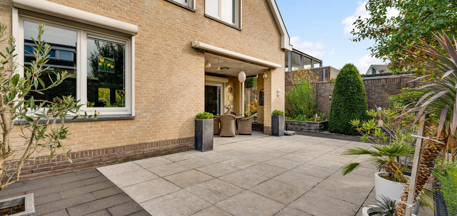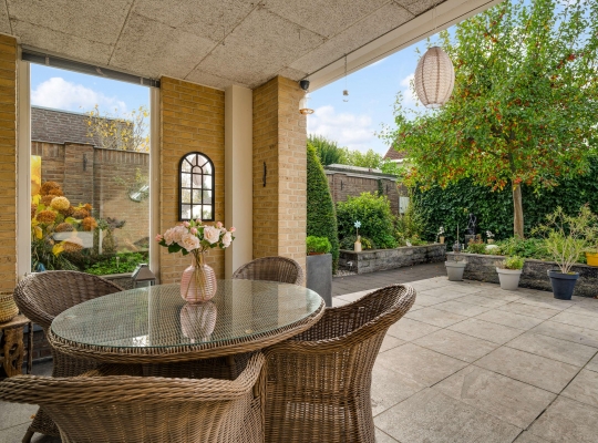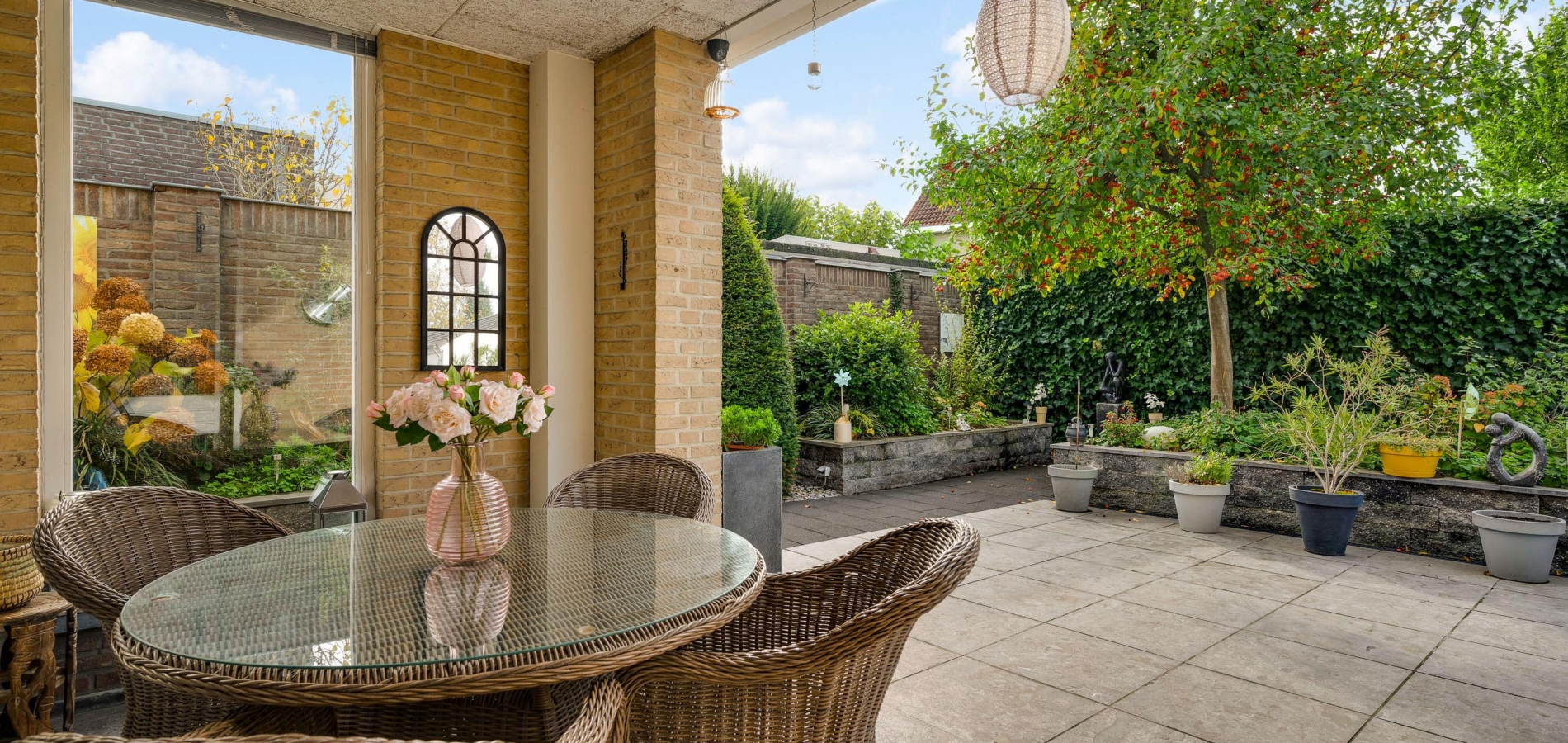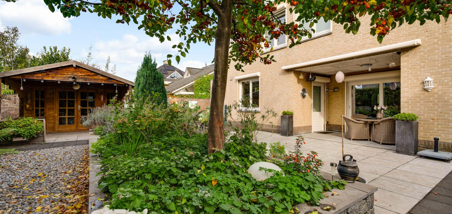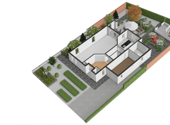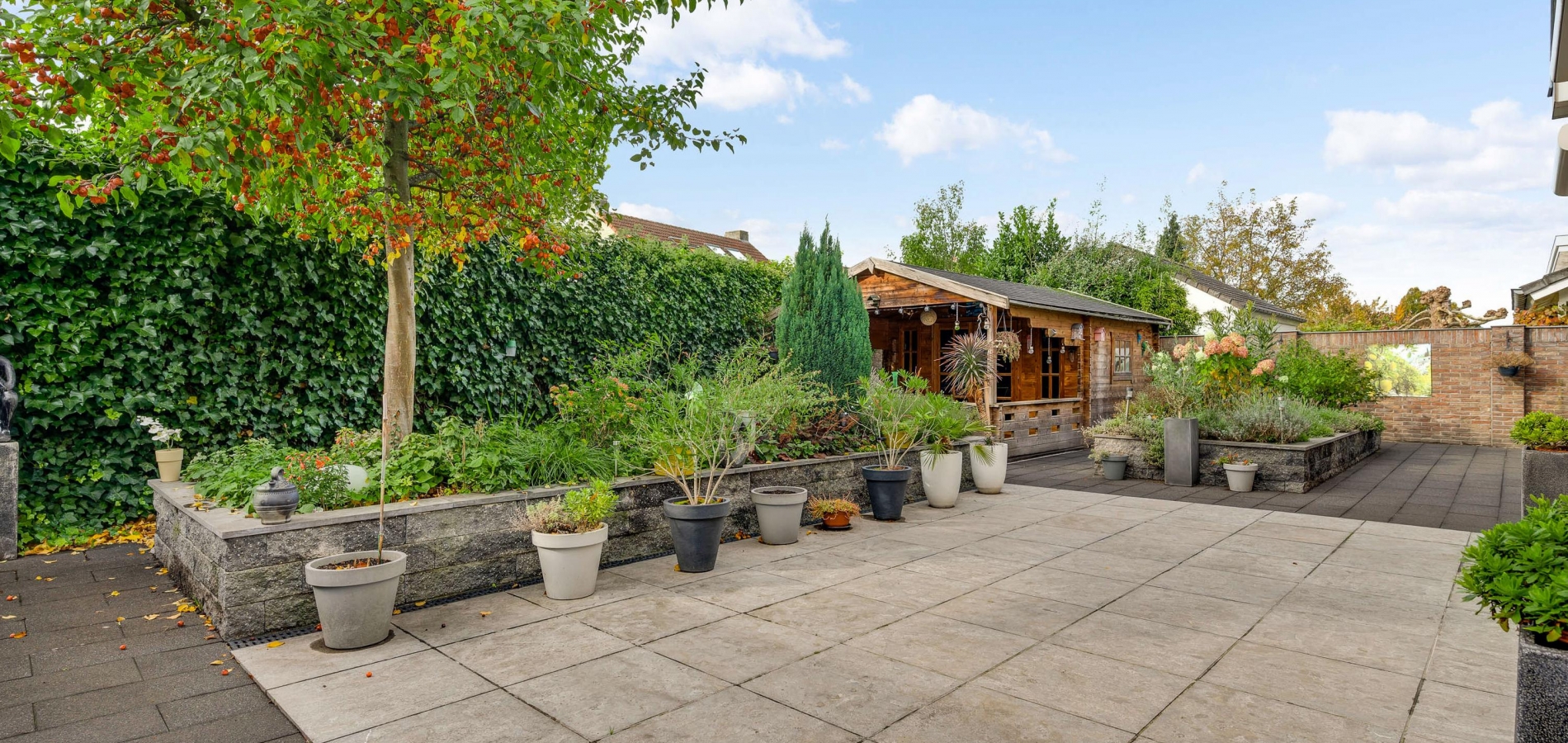 De villa wordt omringd door een fraai aangelegde tuin met een brede oprit, een eigen achterom en een grote variatie aan beplanting. Blikvanger in de achtertuin is het overdekte terras, dat grenst aan het zonneterras met zonnescherm. In de hoek van de tuin staat een houten berging (circa 3,53 x 2,92) met overkapping. De ligging op het zuidwesten zorgt voor veel zon in de tuin, maar een schaduwplek is er ook.
